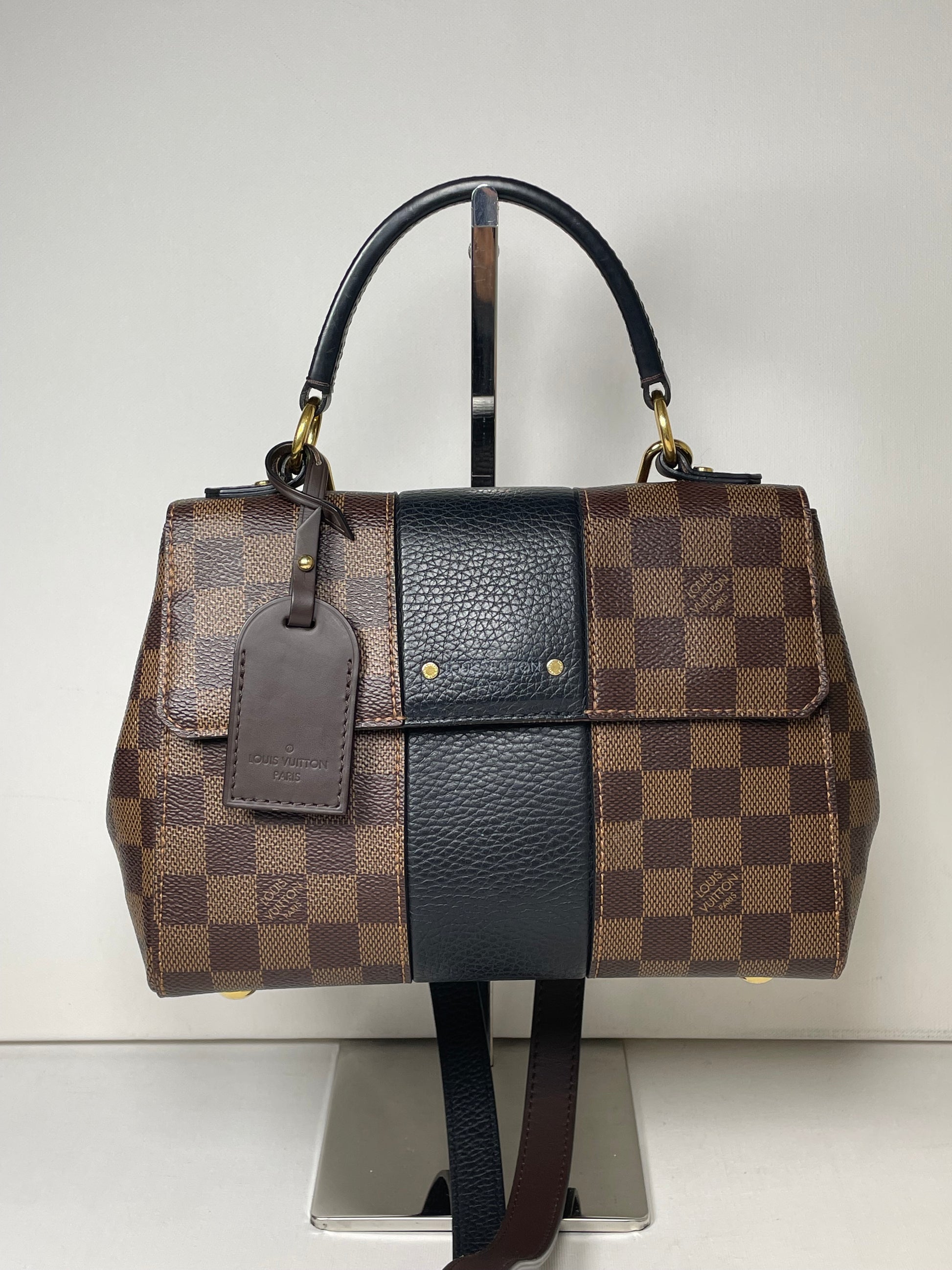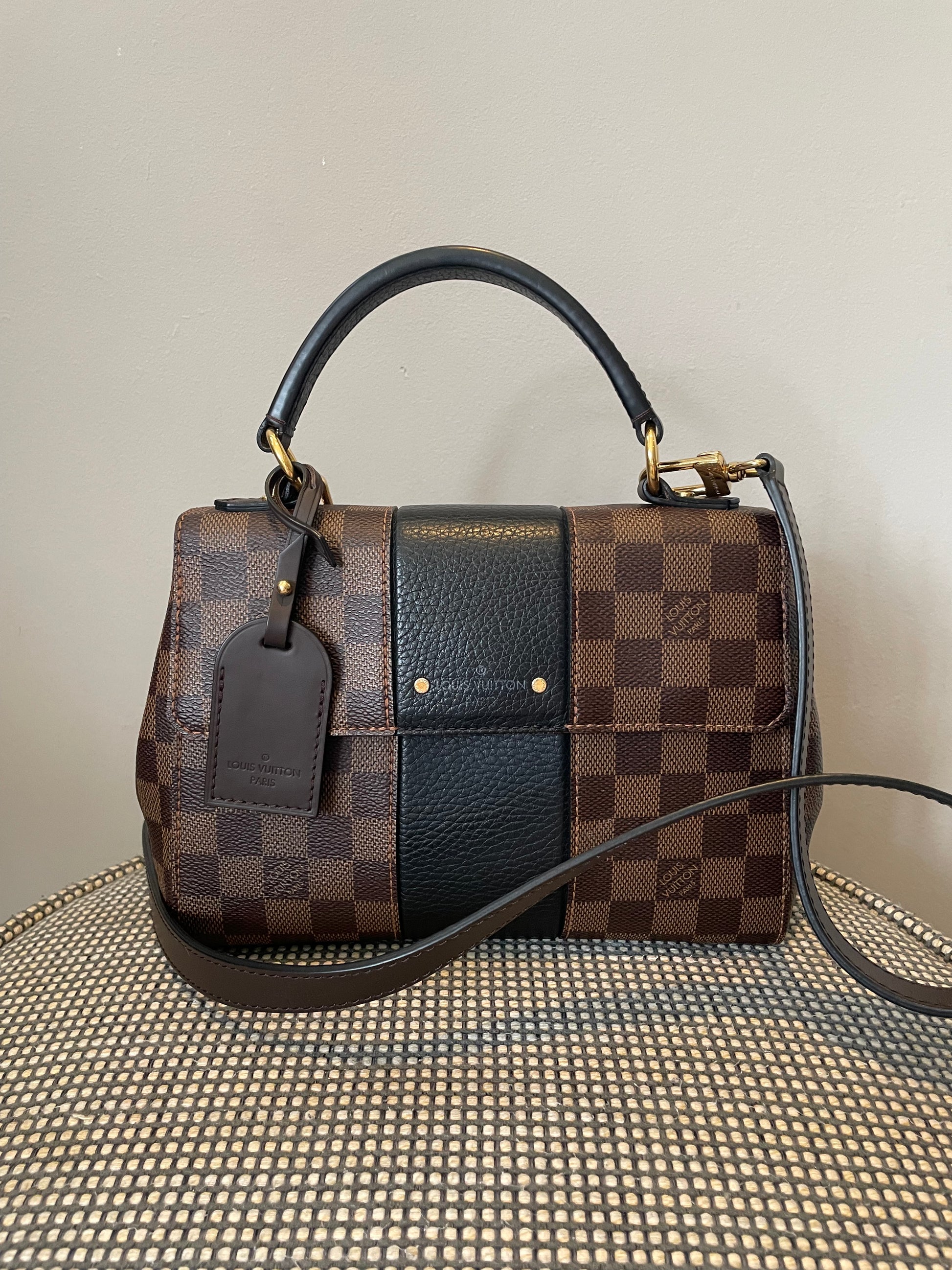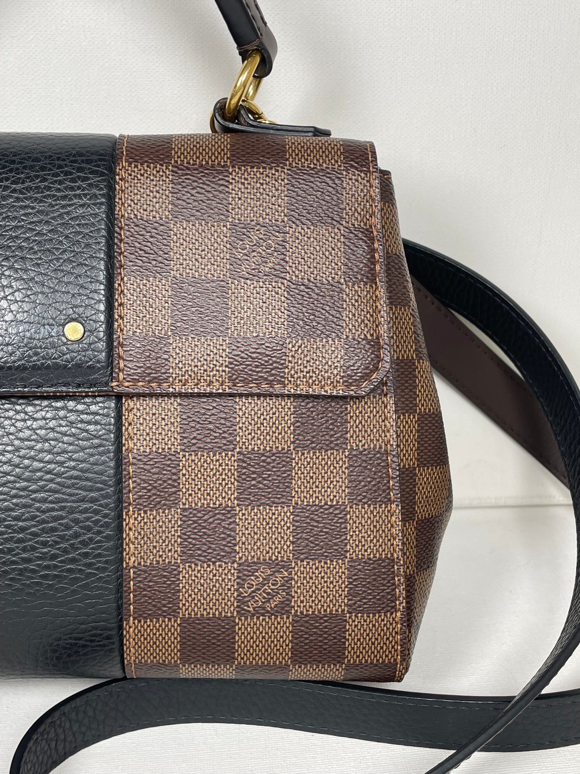 This is a stunning Louis Vuitton Bond Street bag, BB in Damier Ebene (brown) canvas and supple black Taurillon leather. This is a great grab and go bag that looks peefect dressed up or down. This bag is both elegant and functional. The long strap allows you to carry the bag crossbody for hands-free convenience and can be removed and carried in the crook of your arm to take you from day to night seamlessly.