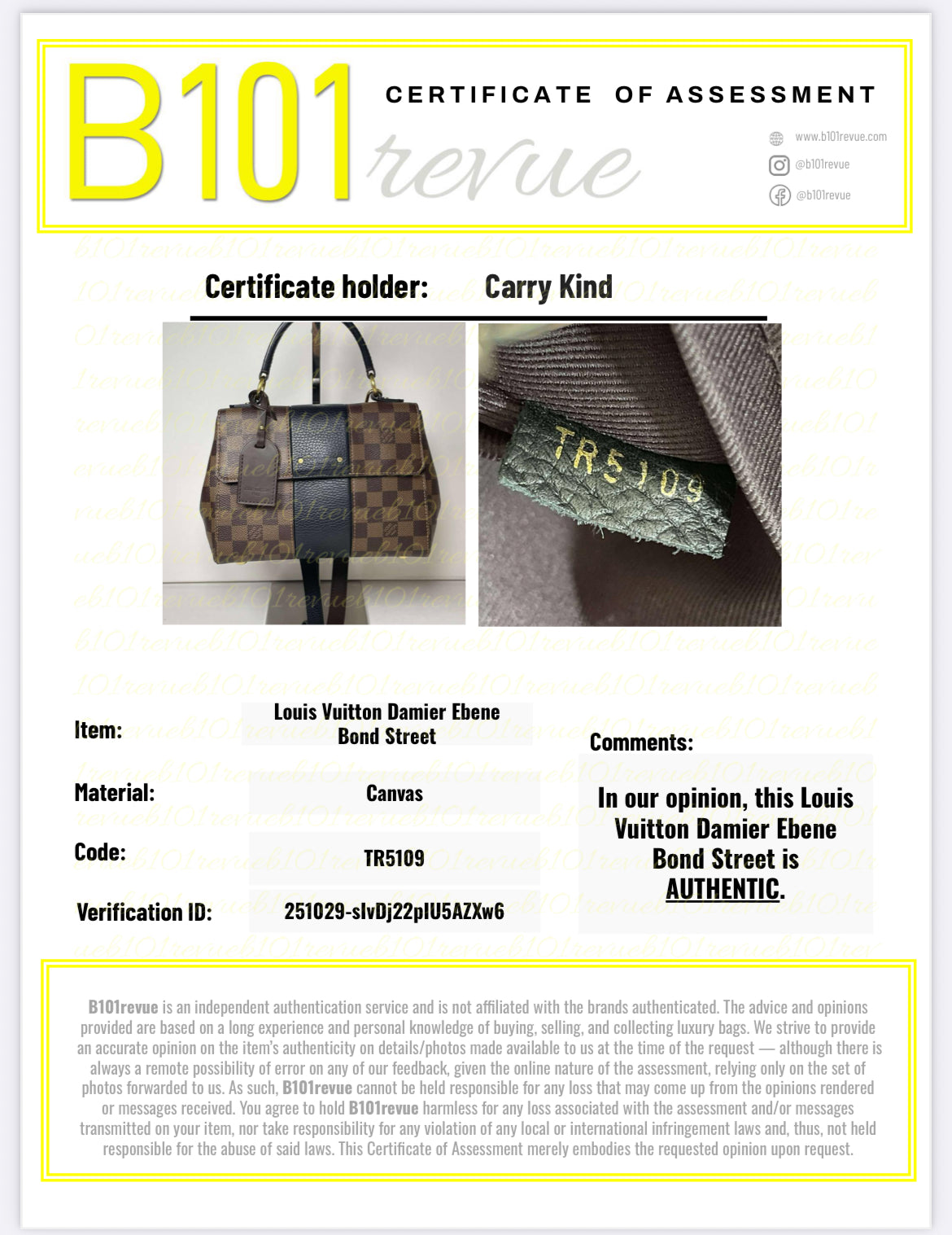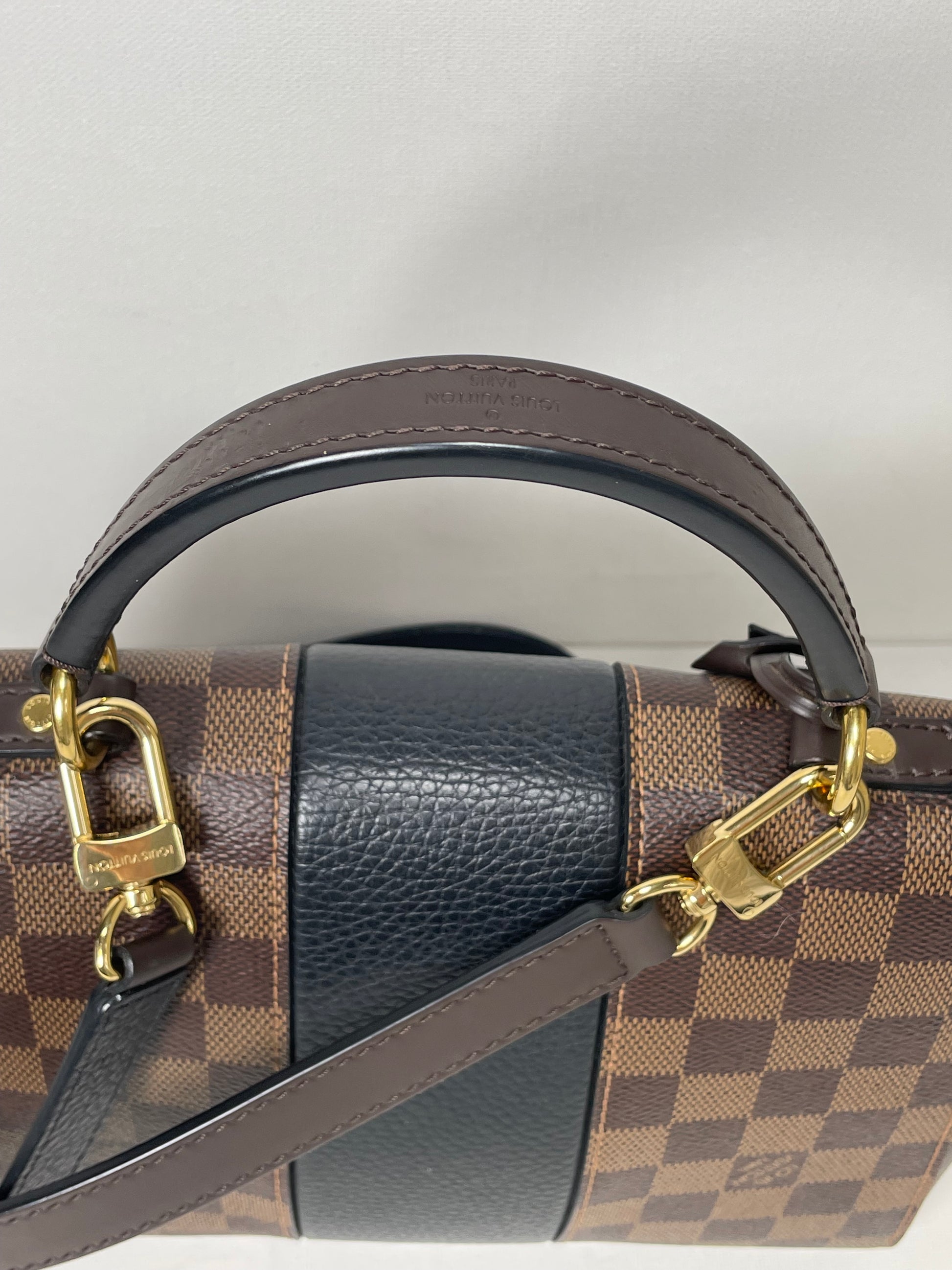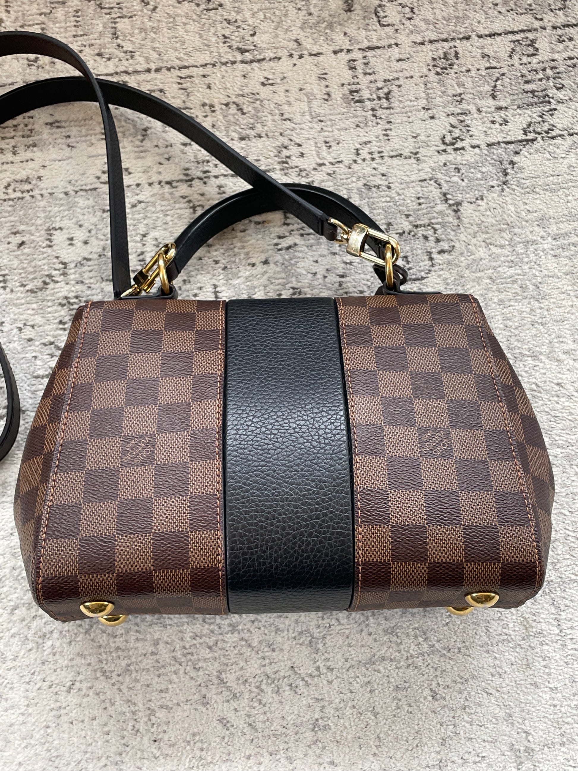 This is a stunning Louis Vuitton Bond Street bag, BB in Damier Ebene (brown) canvas and supple black Taurillon leather. This is a great grab and go bag that looks peefect dressed up or down. This bag is both elegant and functional. The long strap allows you to carry the bag crossbody for hands-free convenience and can be removed and carried in the crook of your arm to take you from day to night seamlessly.
