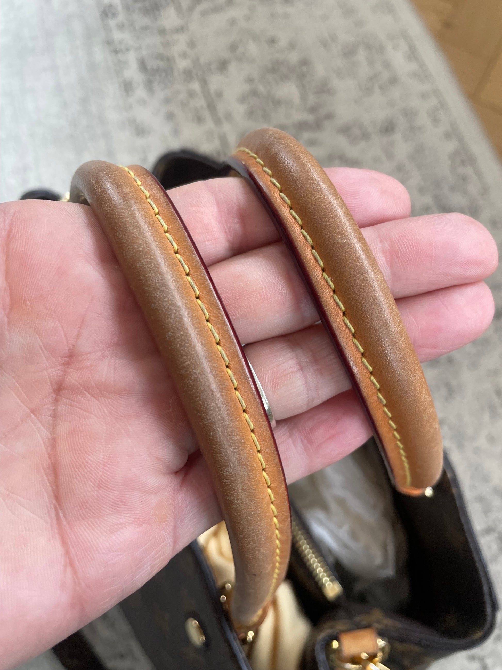 The exterior canvas is clean and in lovely condition. The leather has minor signs of use with slight darkening . The bag is slightly misshapen due to storage. The hardware has light surface scratches. The interior lining is clean with light signs of use. The clochette shows minor signs of use and has a couple of rubbing marks to either side.