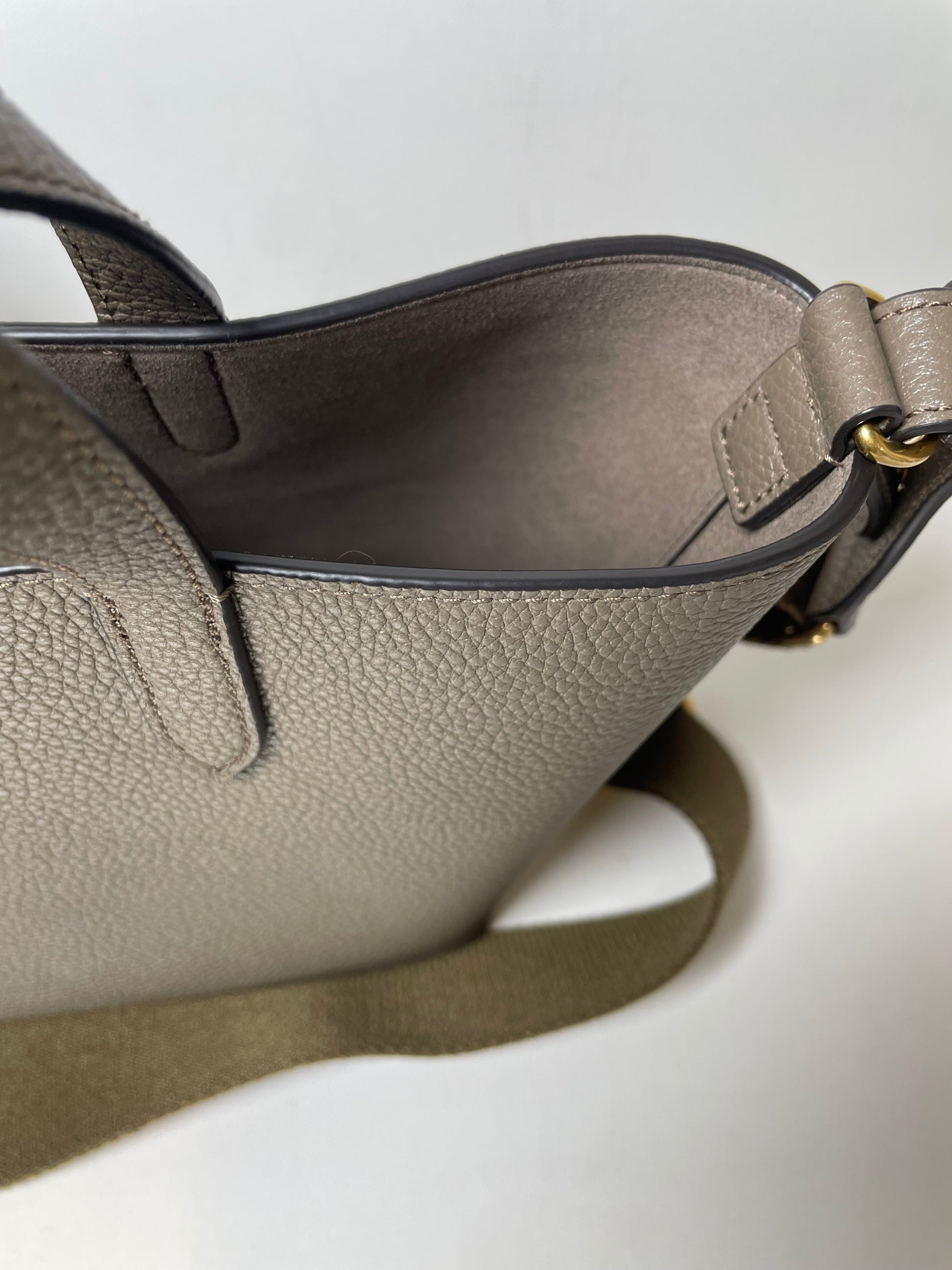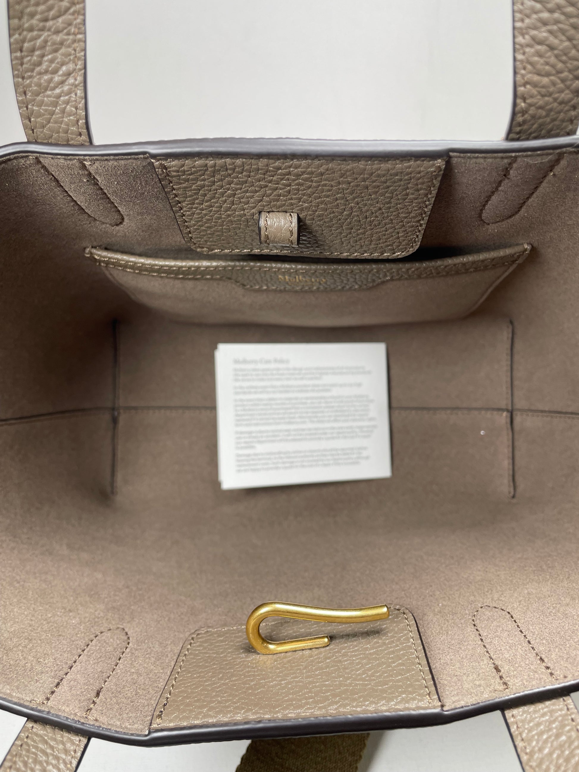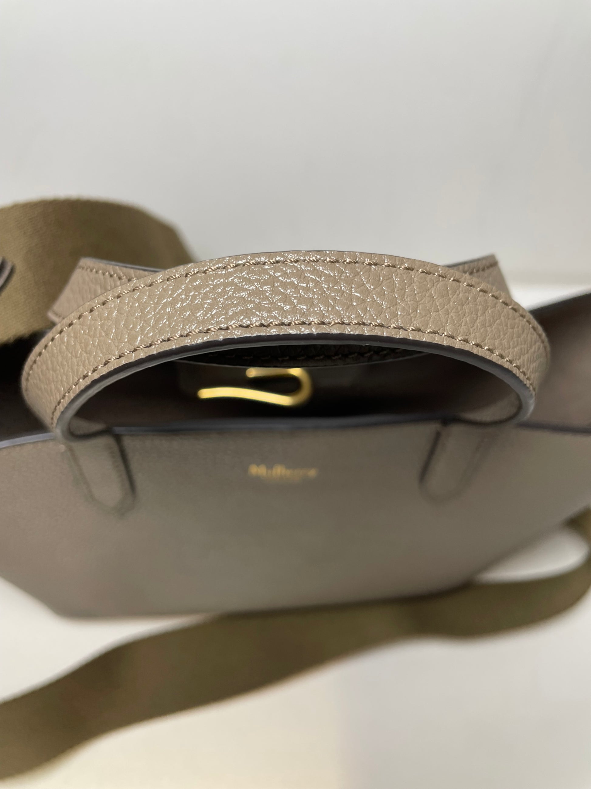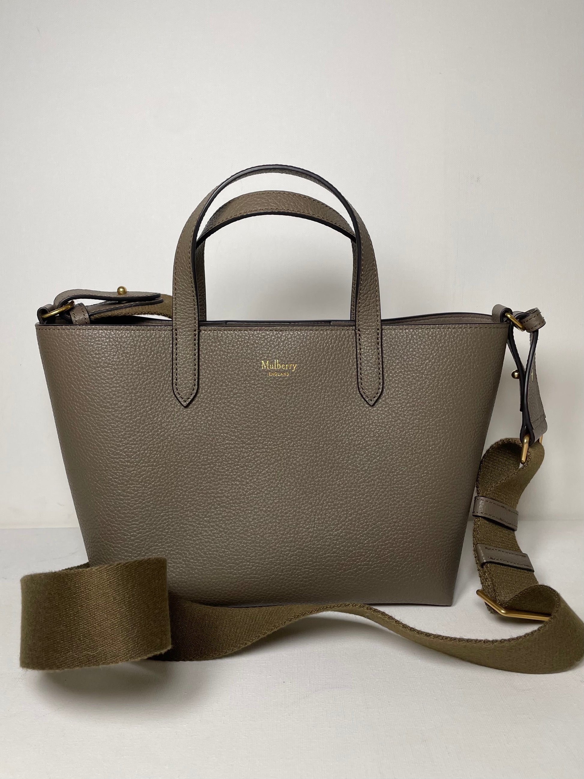 This is a super cute small, Mulberry Alder Tote with removable long guitar strap. This small and perfectly formed tote bag is made from beautiful grainy leather in a warm khaki green colour (the colour is Linen Green) with a tonal contrasting long carry strap and grab handles in the same leather as the body of the bag, creating a modern and sleek feel to the bag. This simply structured bag allows the leather to shine through. The the goldtone curved clip secures the top along with an open slip pocket inside.