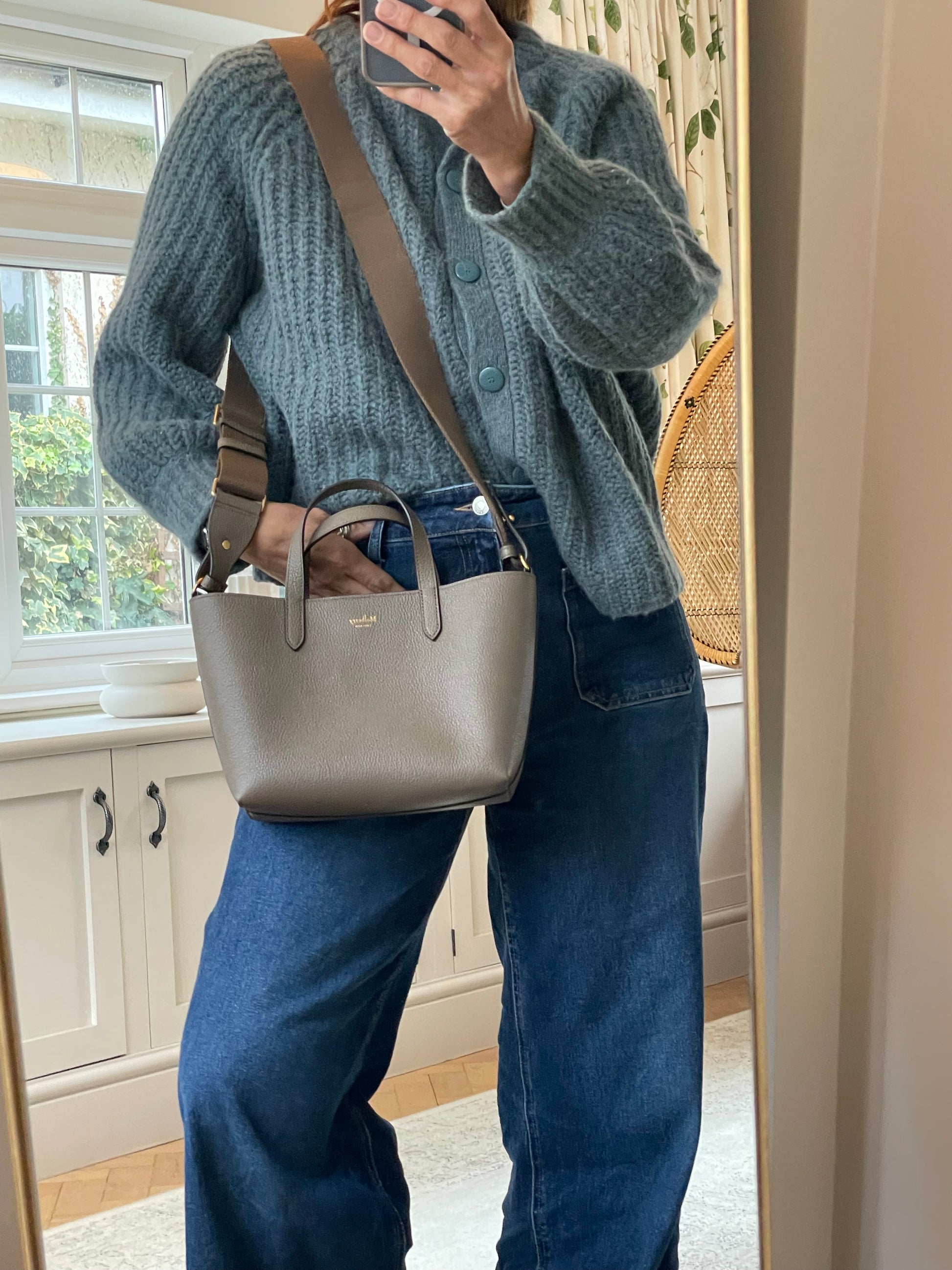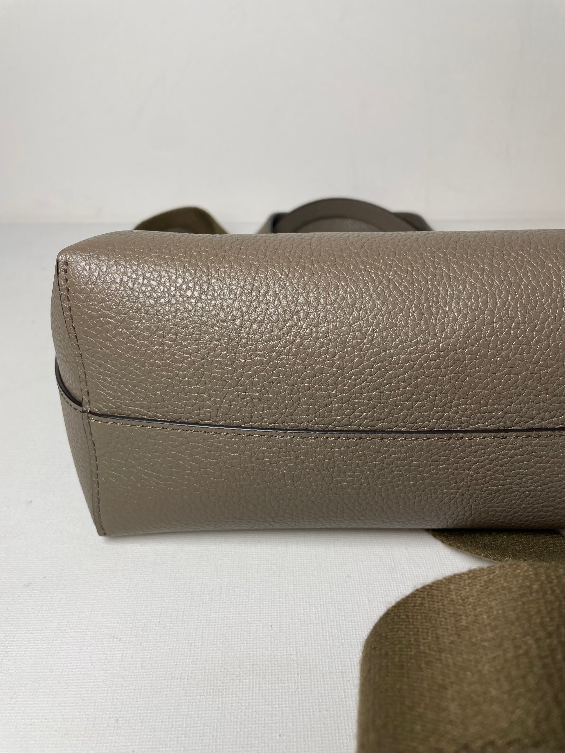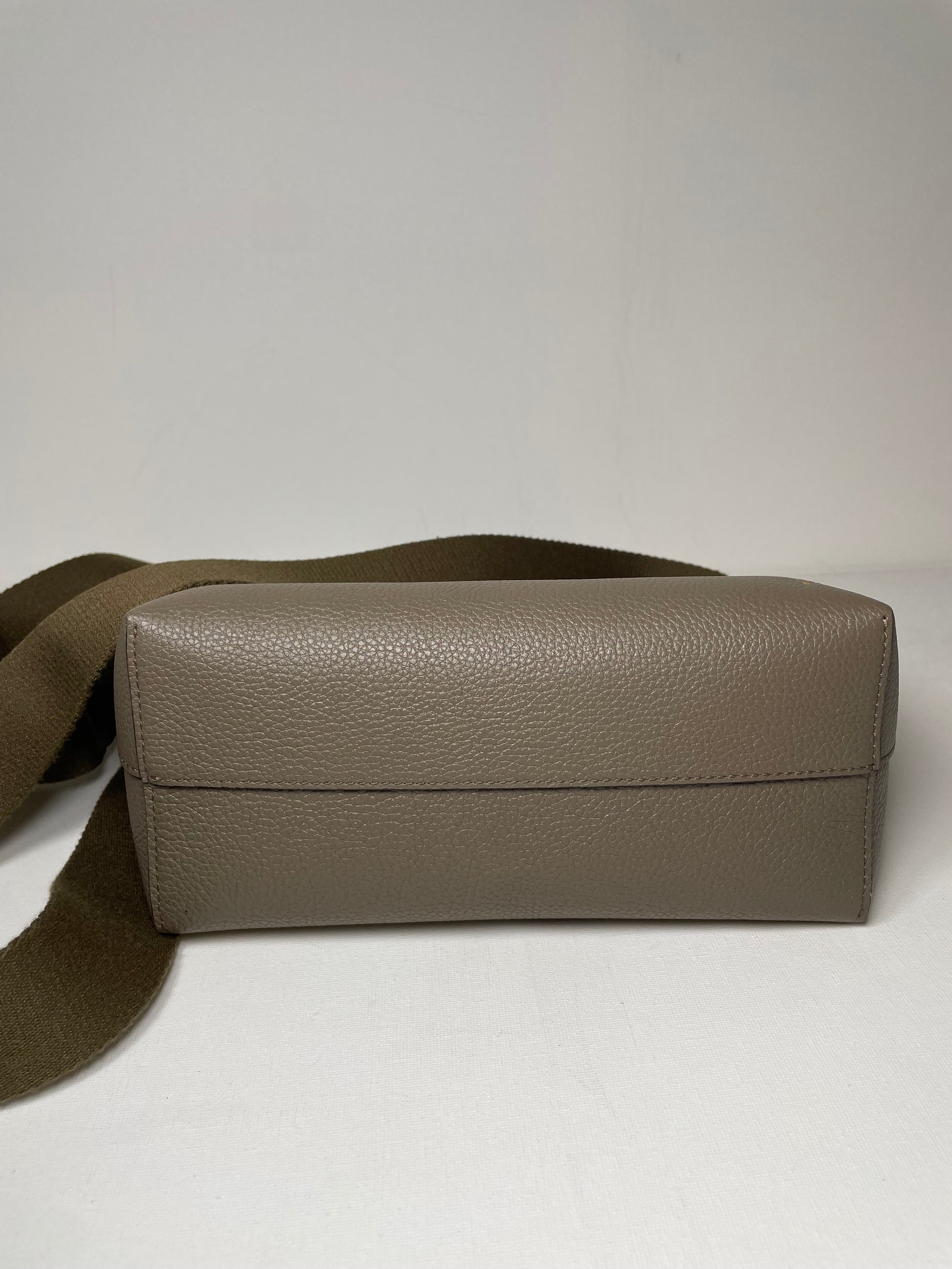 This is a super cute small, Mulberry Alder Tote with removable long guitar strap. This small and perfectly formed tote bag is made from beautiful grainy leather in a warm khaki green colour (the colour is Linen Green) with a tonal contrasting long carry strap and grab handles in the same leather as the body of the bag, creating a modern and sleek feel to the bag. This simply structured bag allows the leather to shine through. The the goldtone curved clip secures the top along with an open slip pocket inside.