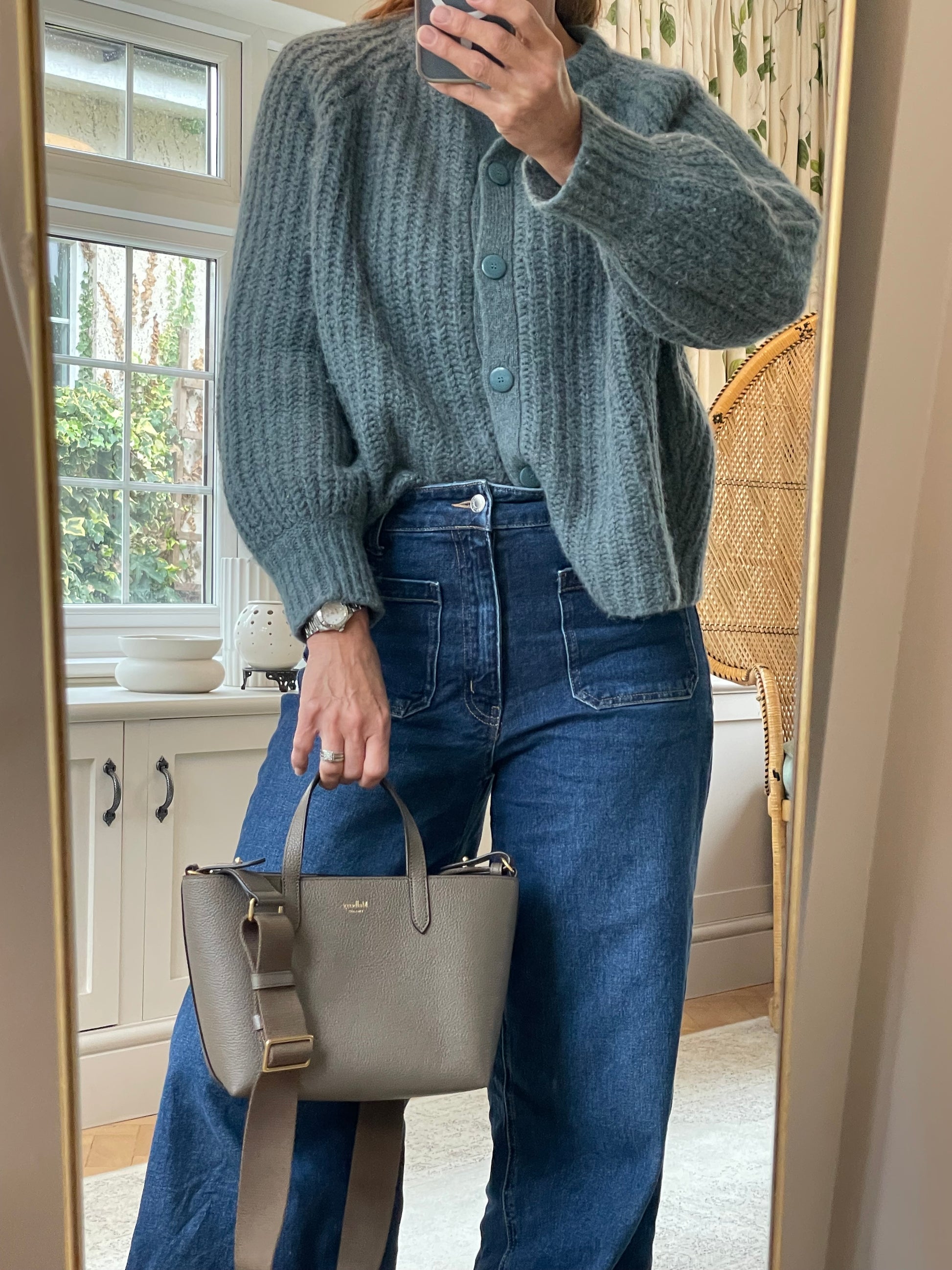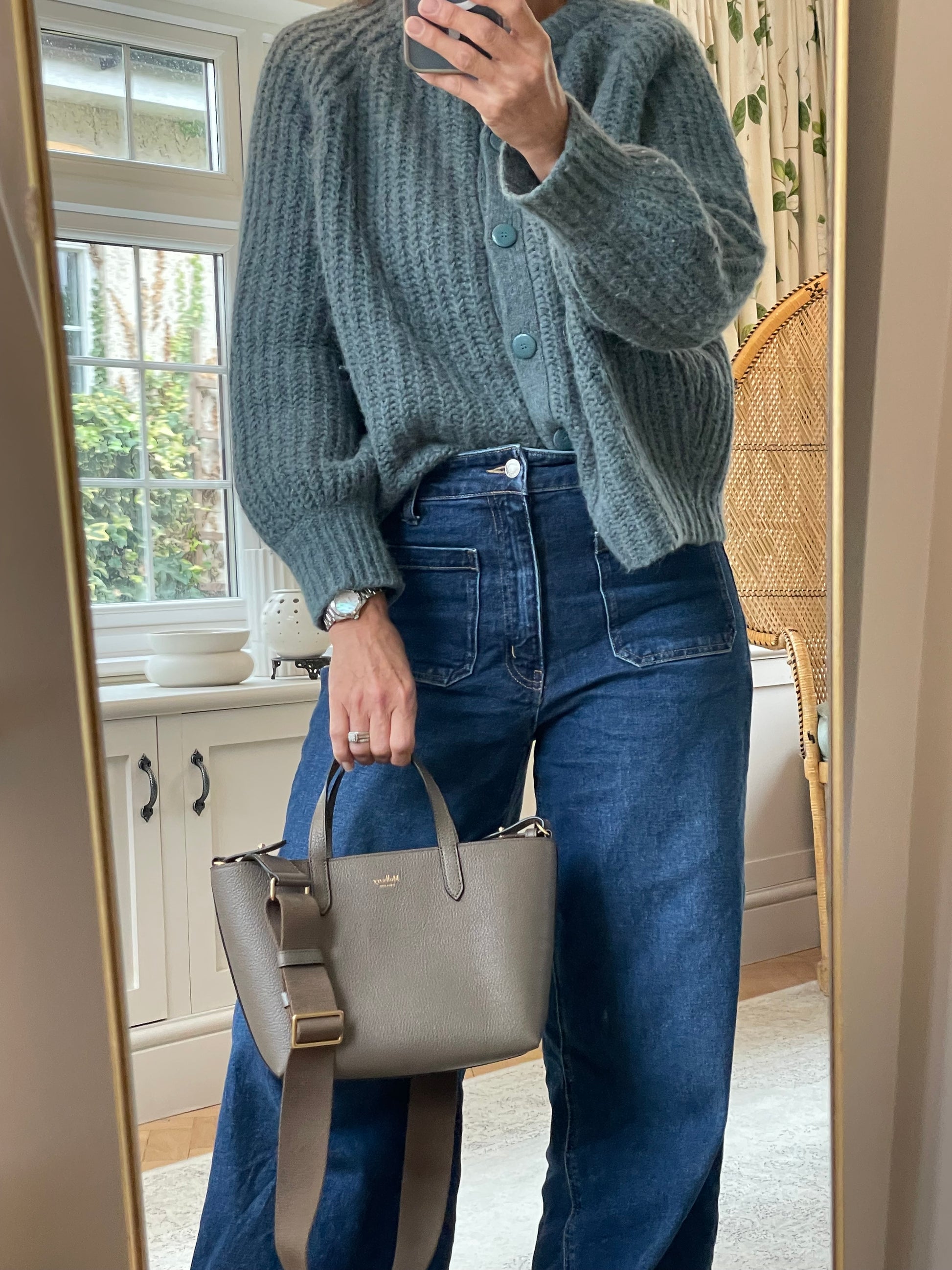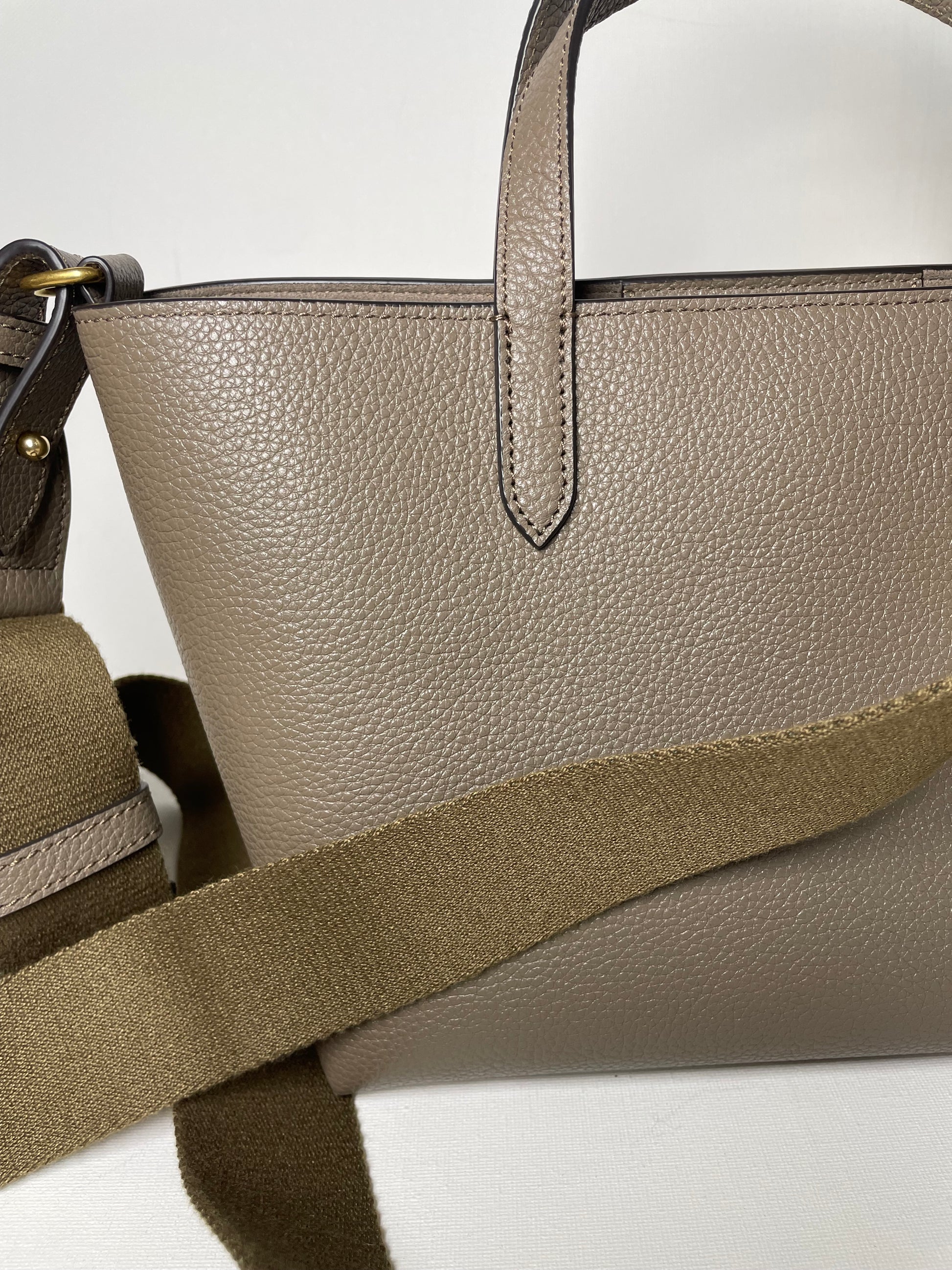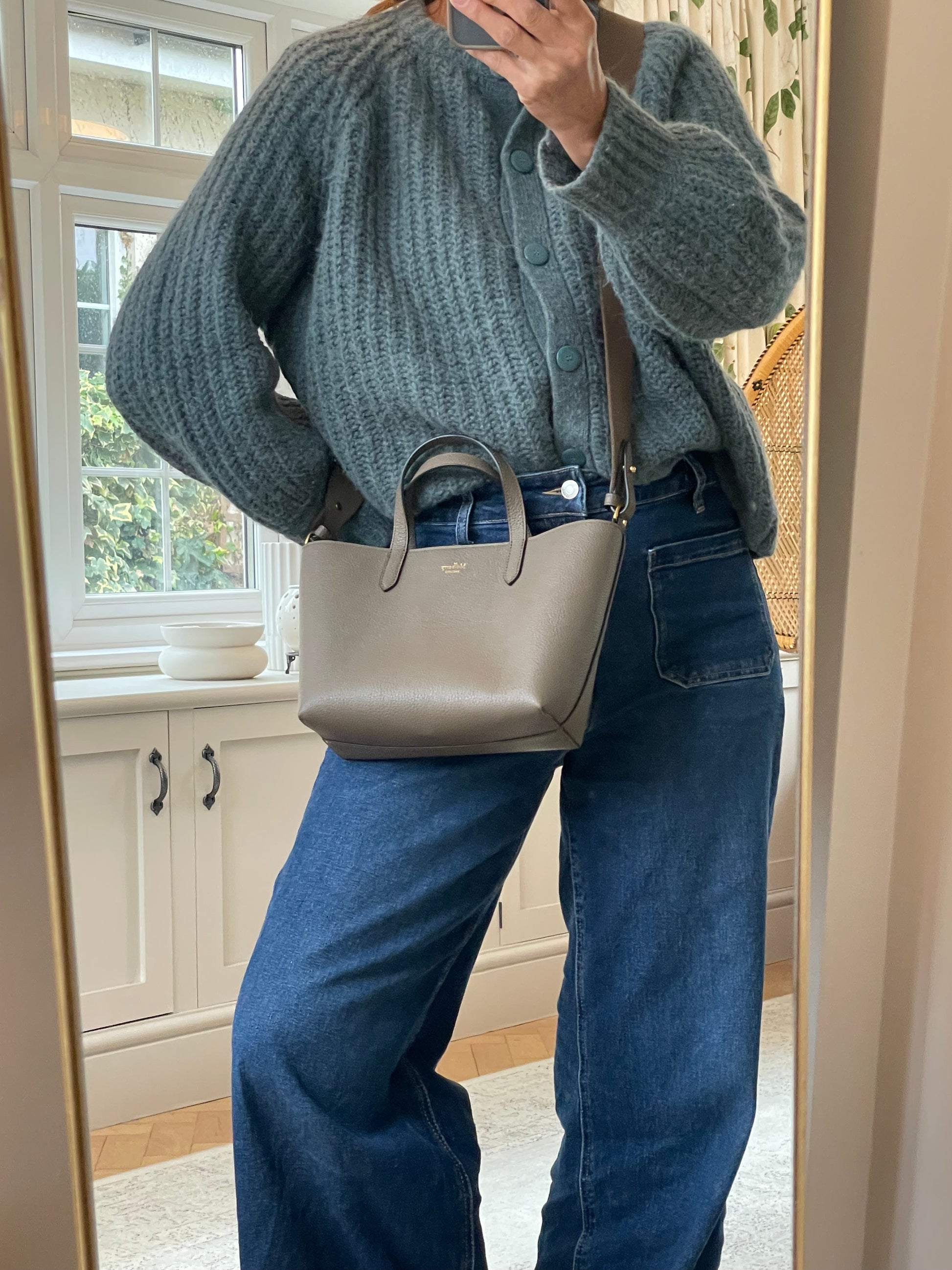 This is a super cute small, Mulberry Alder Tote with removable long guitar strap. This small and perfectly formed tote bag is made from beautiful grainy leather in a warm khaki green colour (the colour is Linen Green) with a tonal contrasting long carry strap and grab handles in the same leather as the body of the bag, creating a modern and sleek feel to the bag. This simply structured bag allows the leather to shine through. The the goldtone curved clip secures the top along with an open slip pocket inside.
