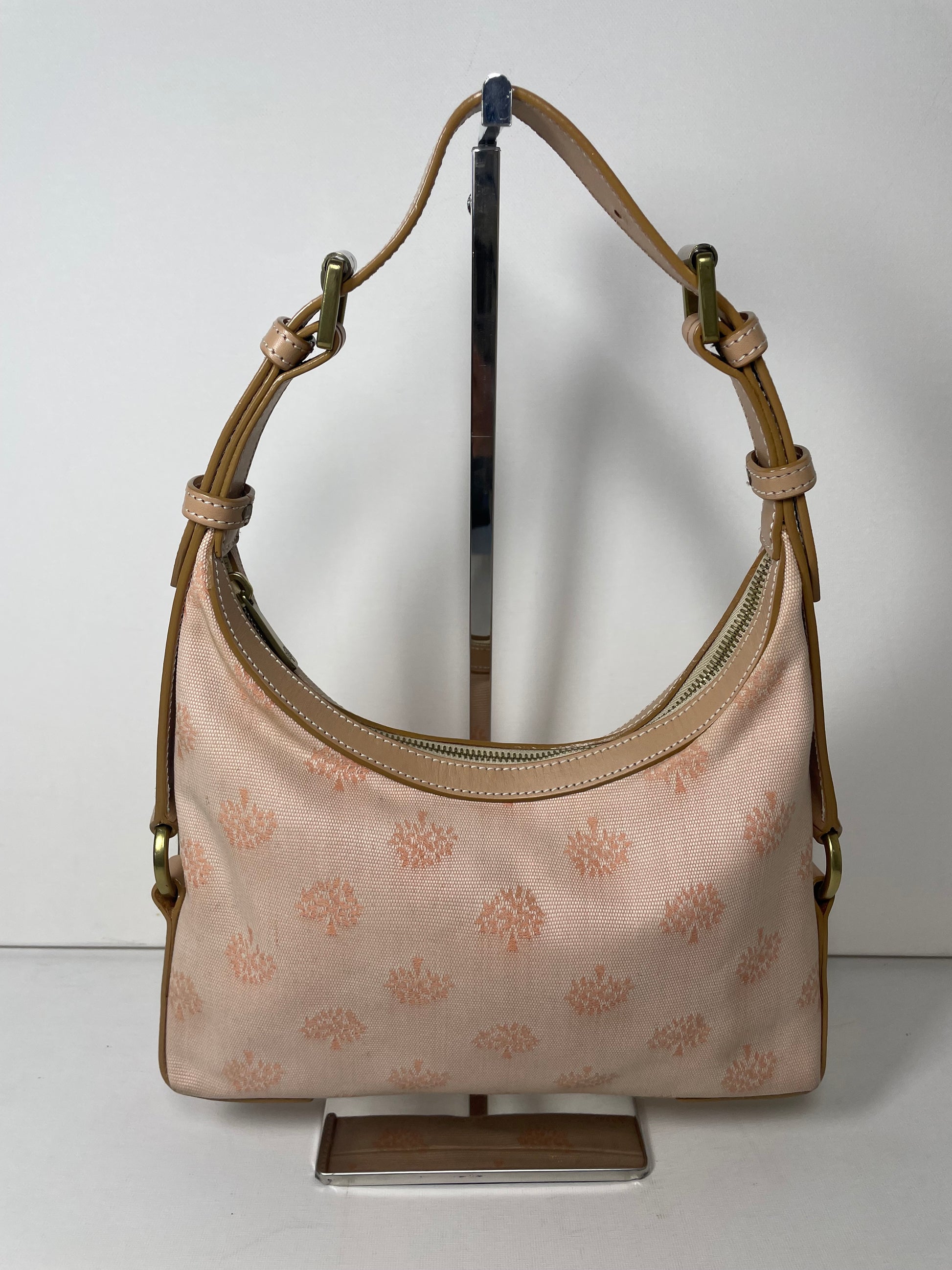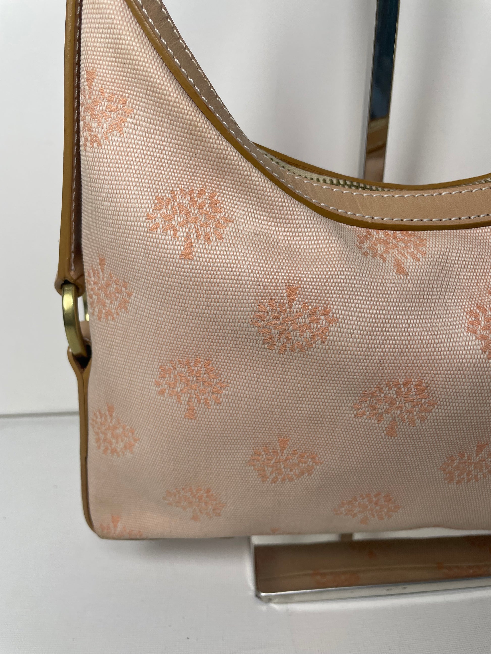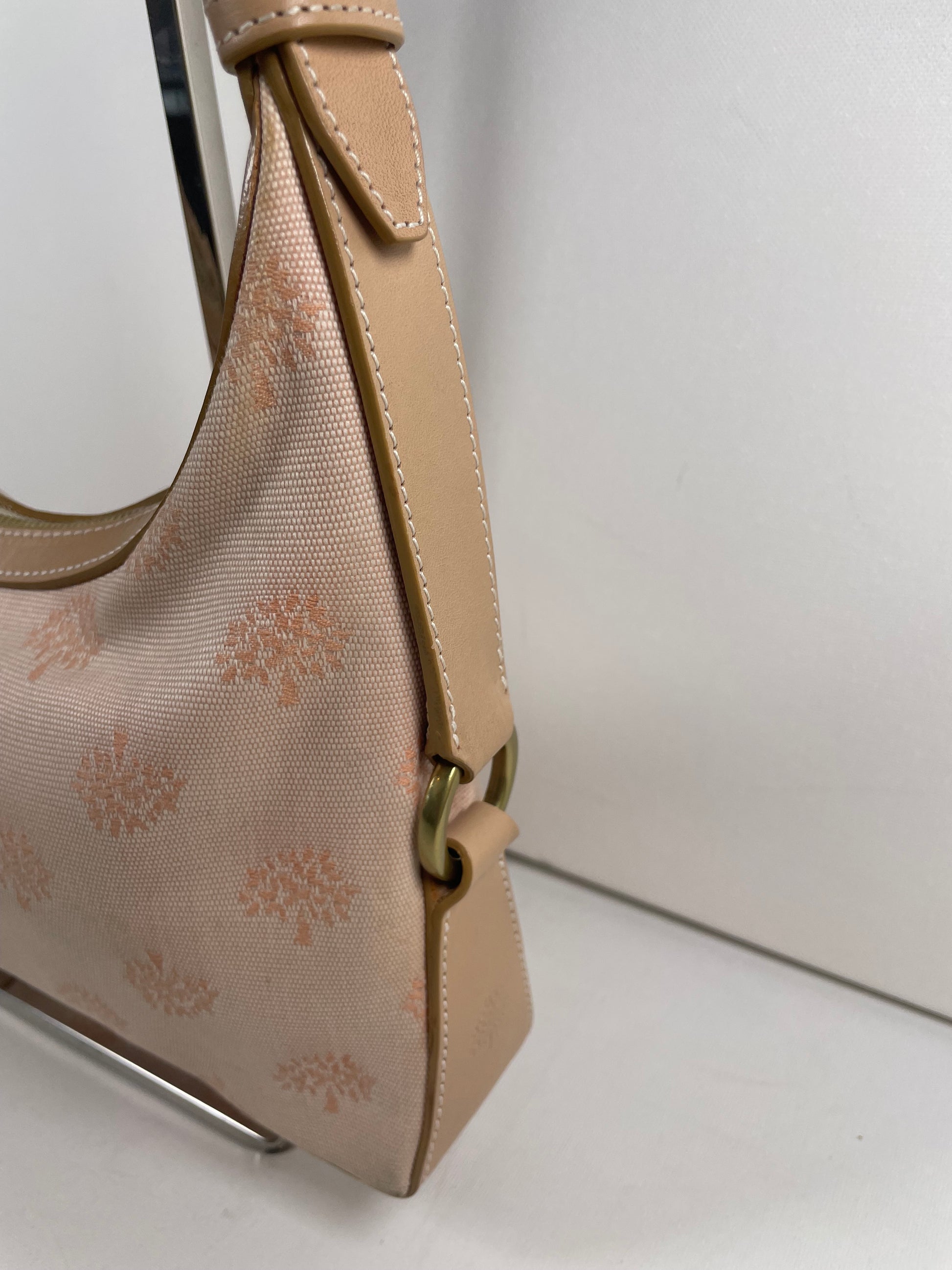 This is a vintage Mulberry Jacquard Hobo bag in pink canvas with the signature tree logo pattern. The bag is a soft pink/cream canvas material featuring a lighter pink jacquard tree pattern. It has light beige leather trim and an adjustable shoulder strap. The hardware, including the strap buckles and side rings is in a brass colour
