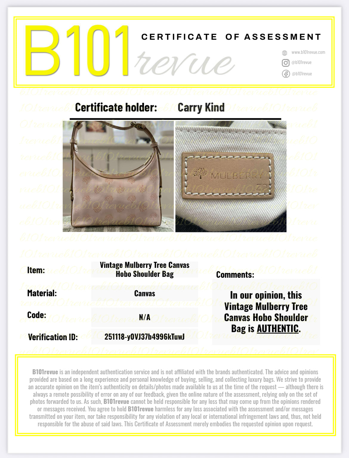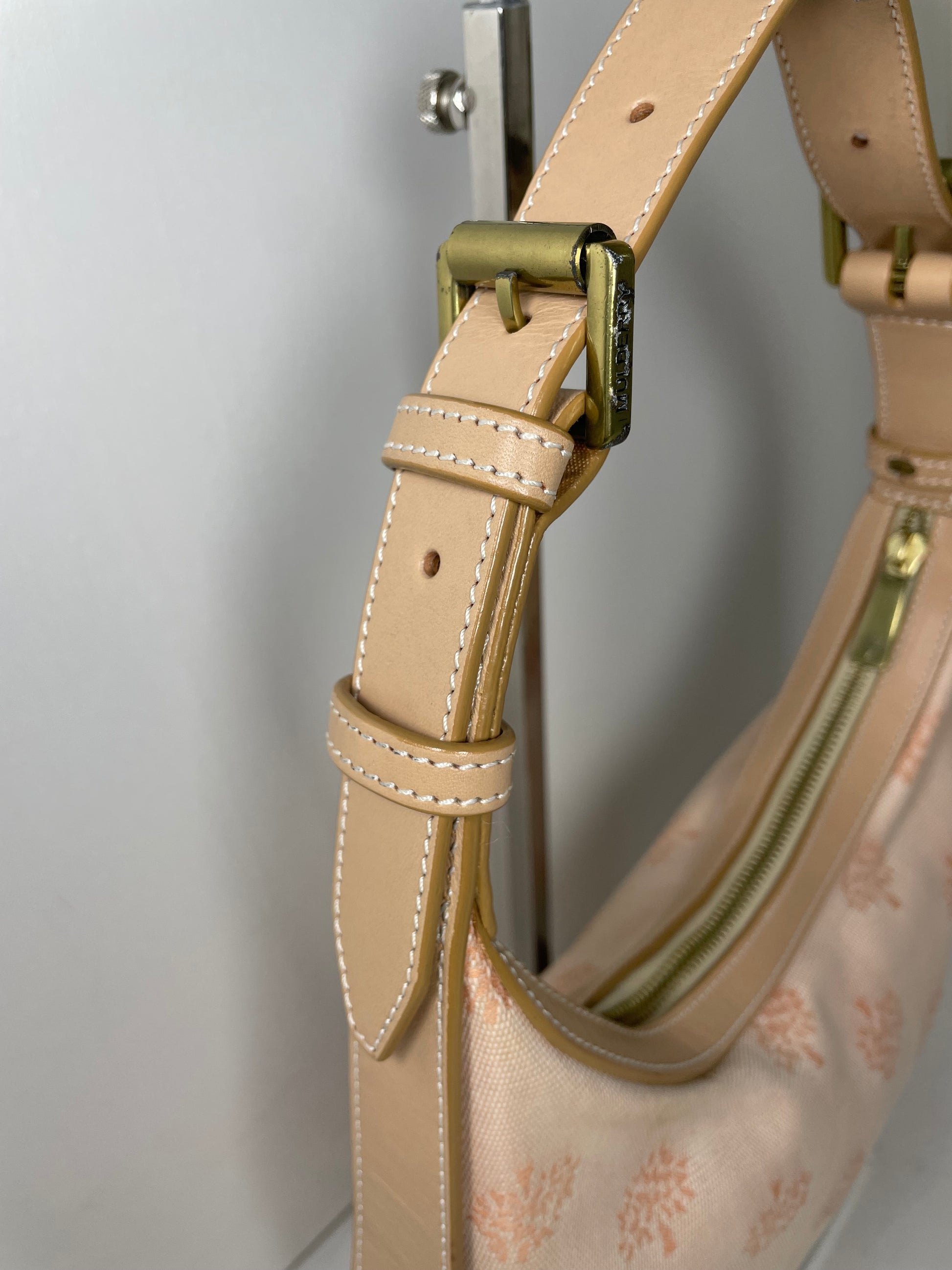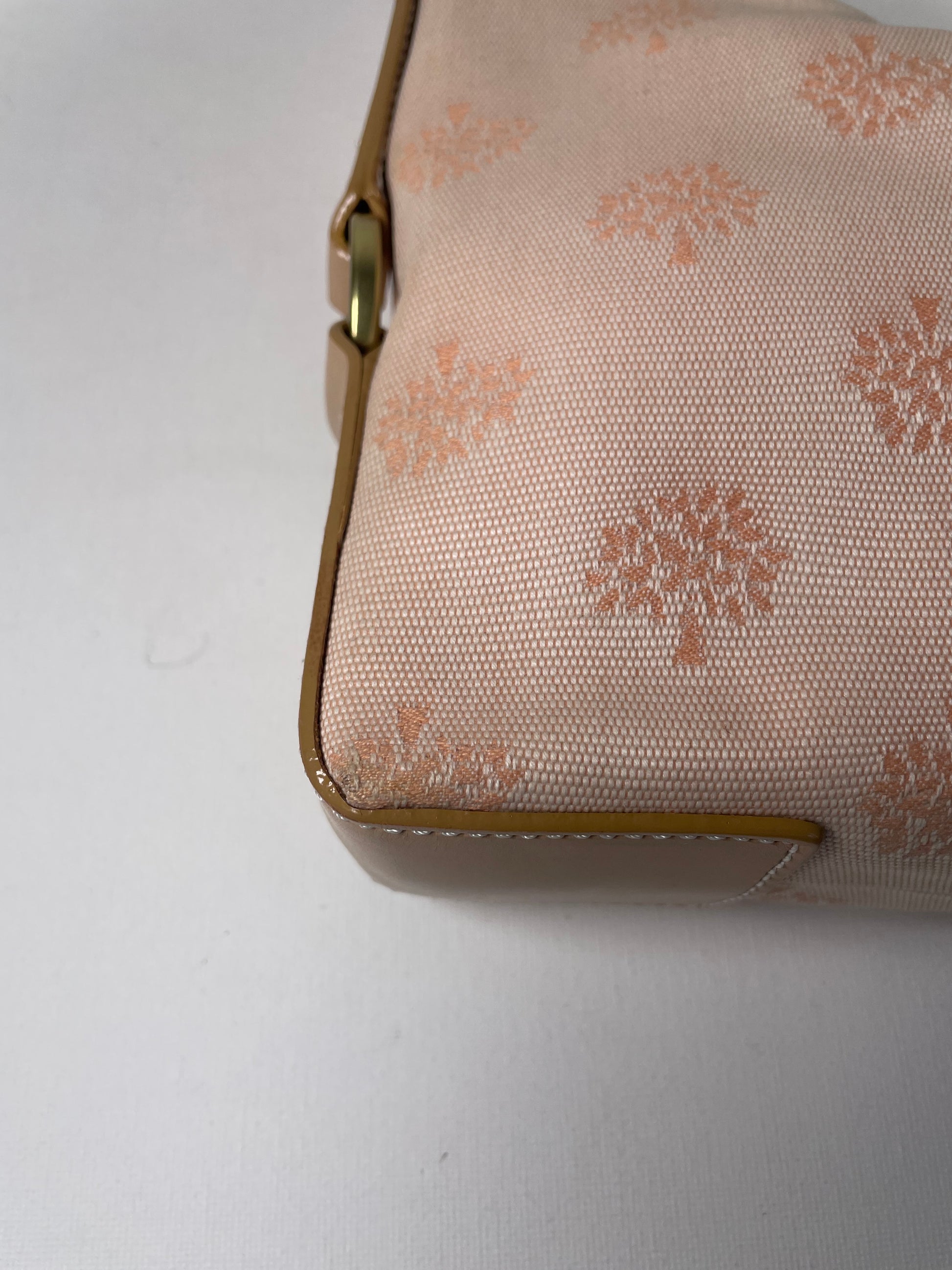 This is a vintage Mulberry Jacquard Hobo bag in pink canvas with the signature tree logo pattern. The bag is a soft pink/cream canvas material featuring a lighter pink jacquard tree pattern. It has light beige leather trim and an adjustable shoulder strap. The hardware, including the strap buckles and side rings is in a brass colour