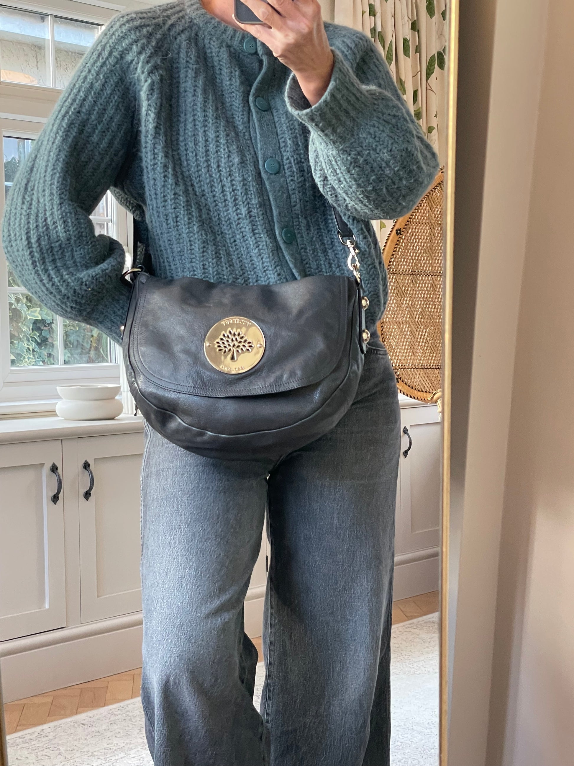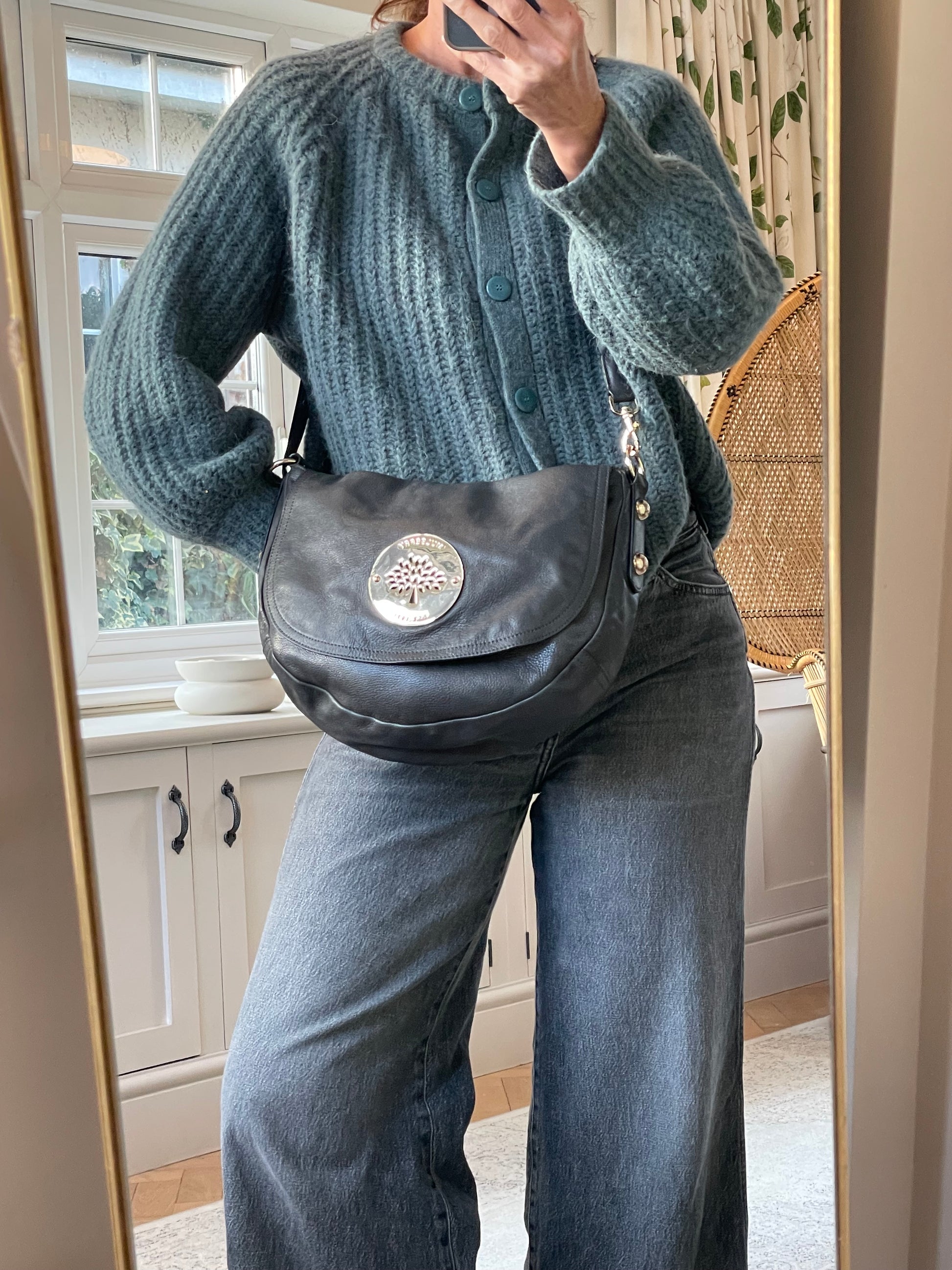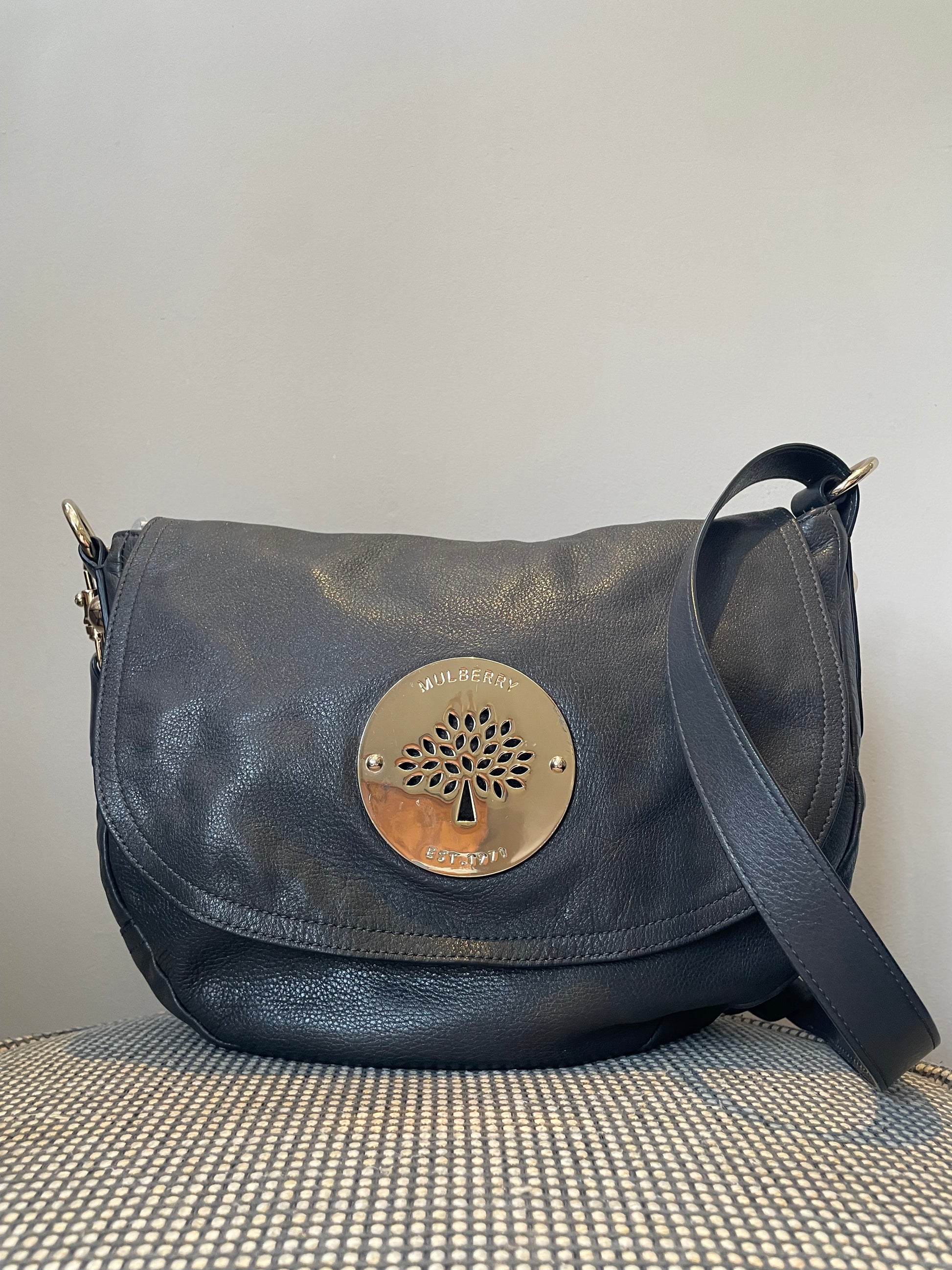 This is a lovely, relaxed Medium Mulberry Daria Satchel in a deep grey leather. This is a fantastic size for everyday and the strap can be doubled so it can be used as a shoulder bag or longer so it sits Crossbody. The opening flap has the oversized Mulberry disk with contrasts beautifully with the Oxblood grainy leather. Inside is a secure back zip pocket and open slip pocket.