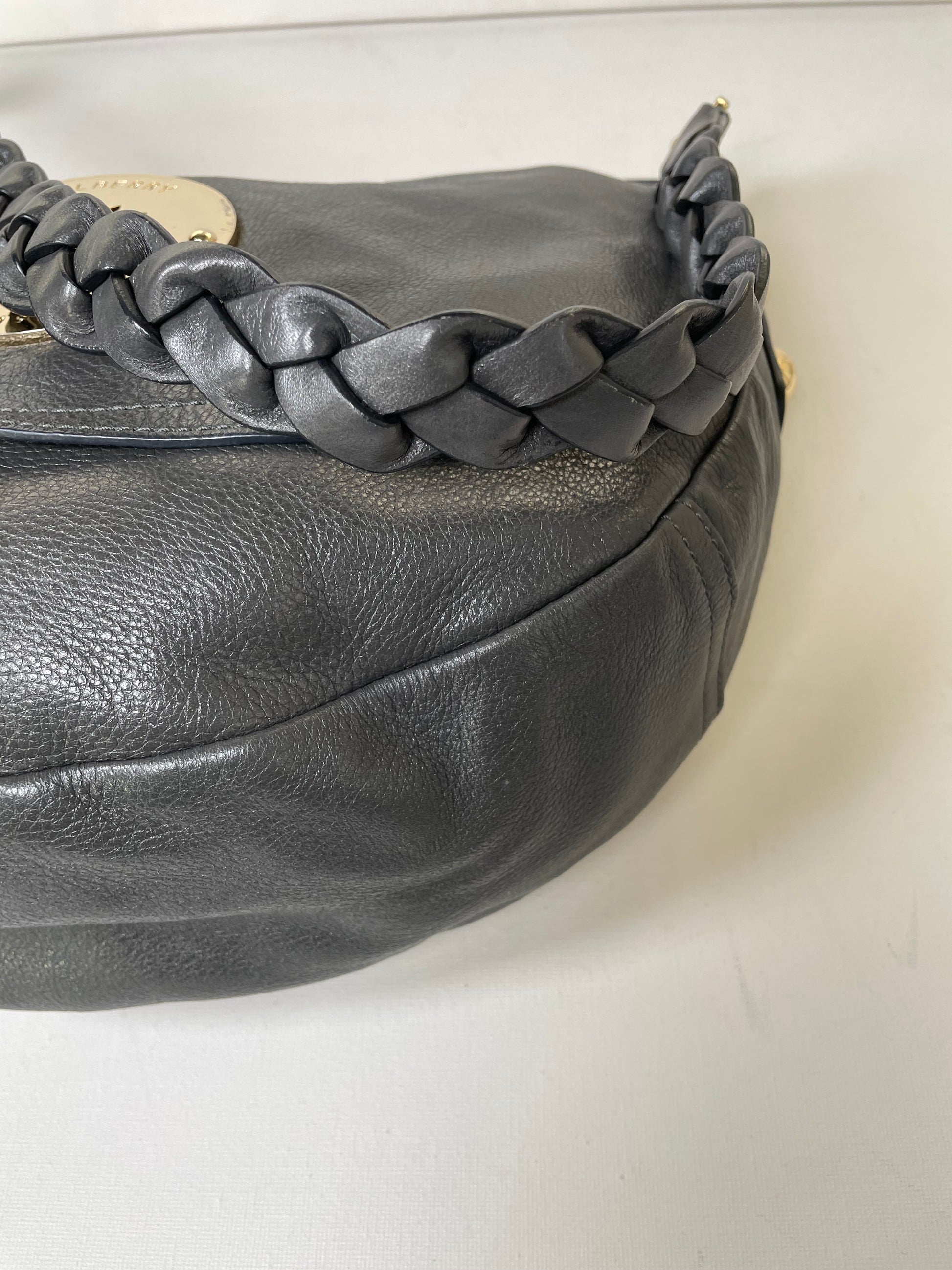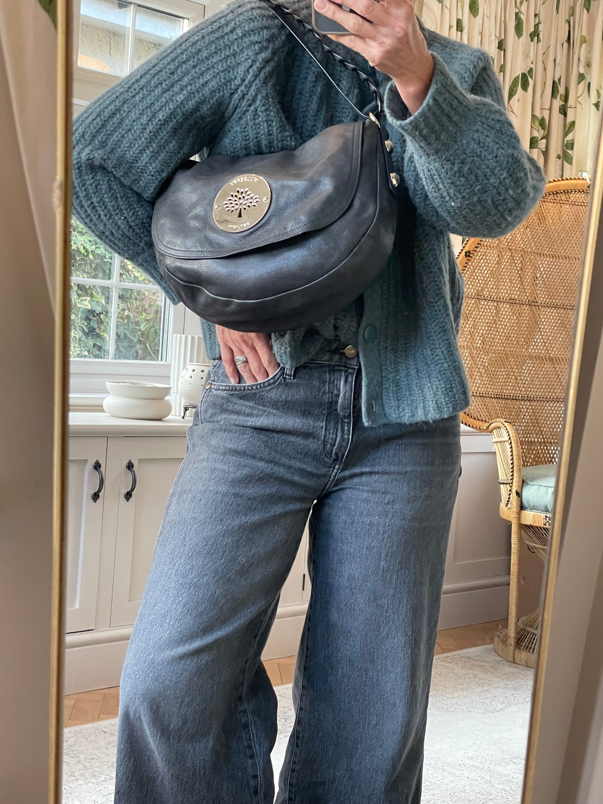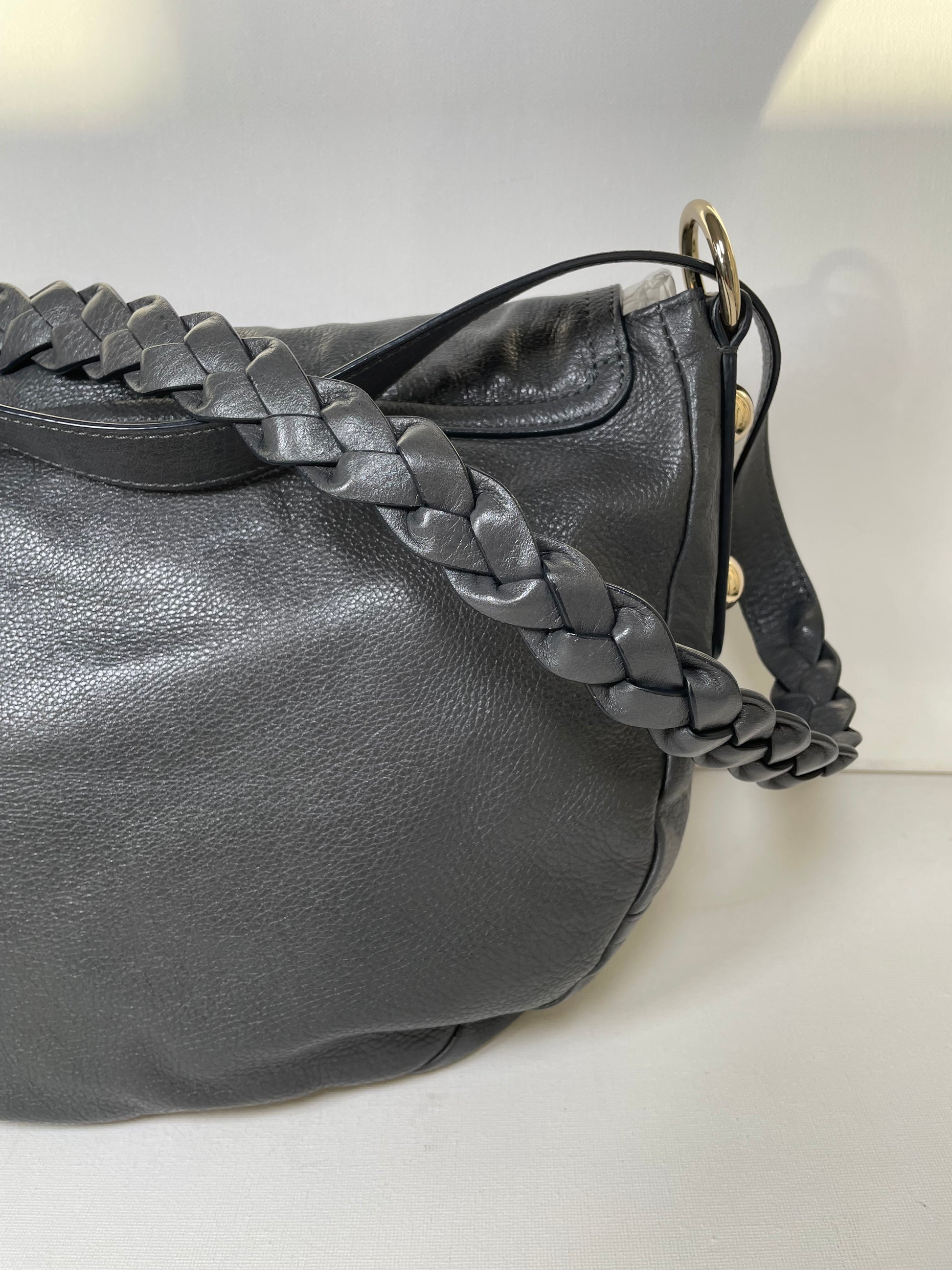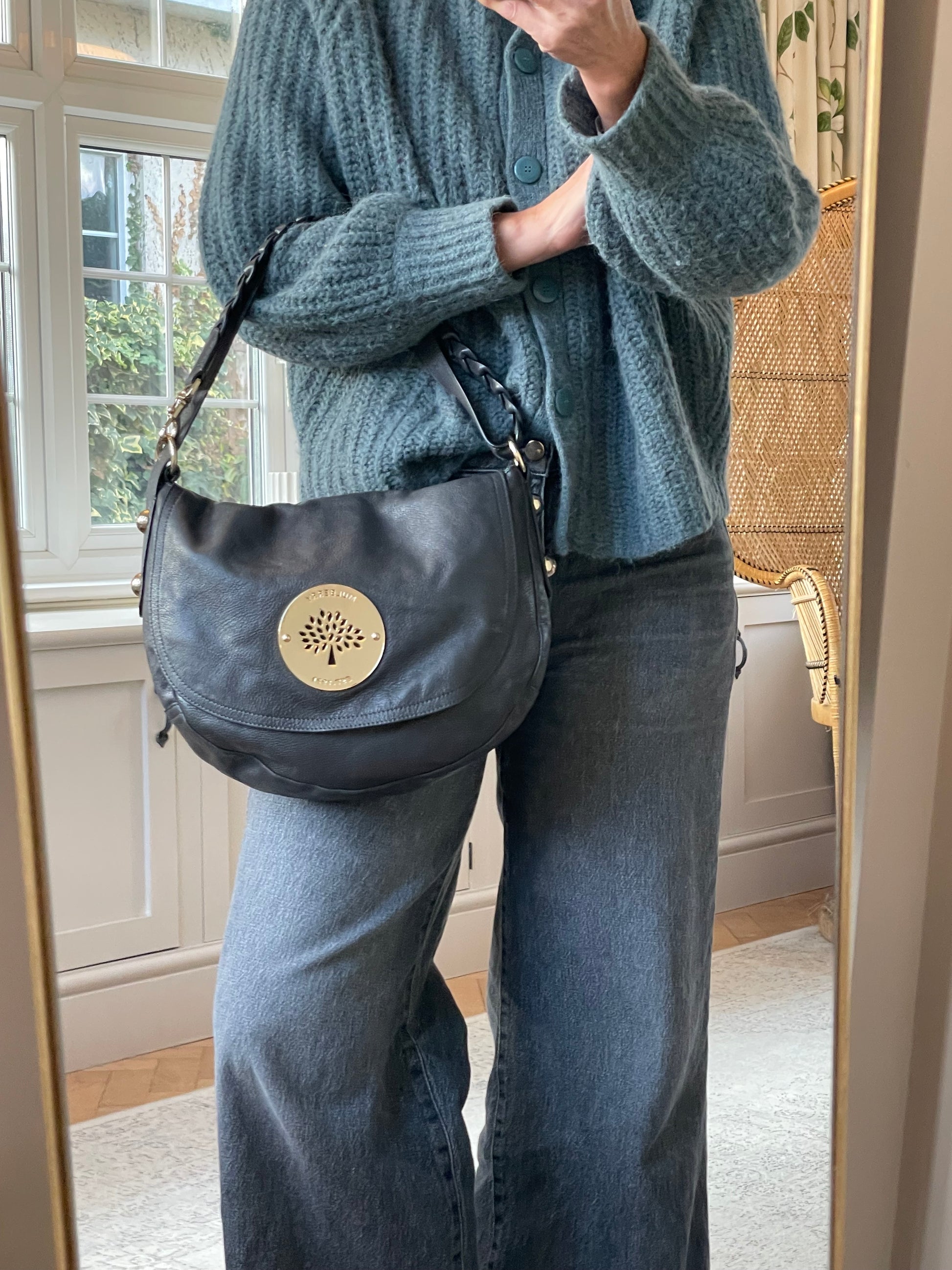This is a lovely, relaxed Medium Mulberry Daria Satchel in a deep grey leather. This is a fantastic size for everyday and the strap can be doubled so it can be used as a shoulder bag or longer so it sits Crossbody. The opening flap has the oversized Mulberry disk with contrasts beautifully with the Oxblood grainy leather. Inside is a secure back zip pocket and open slip pocket.