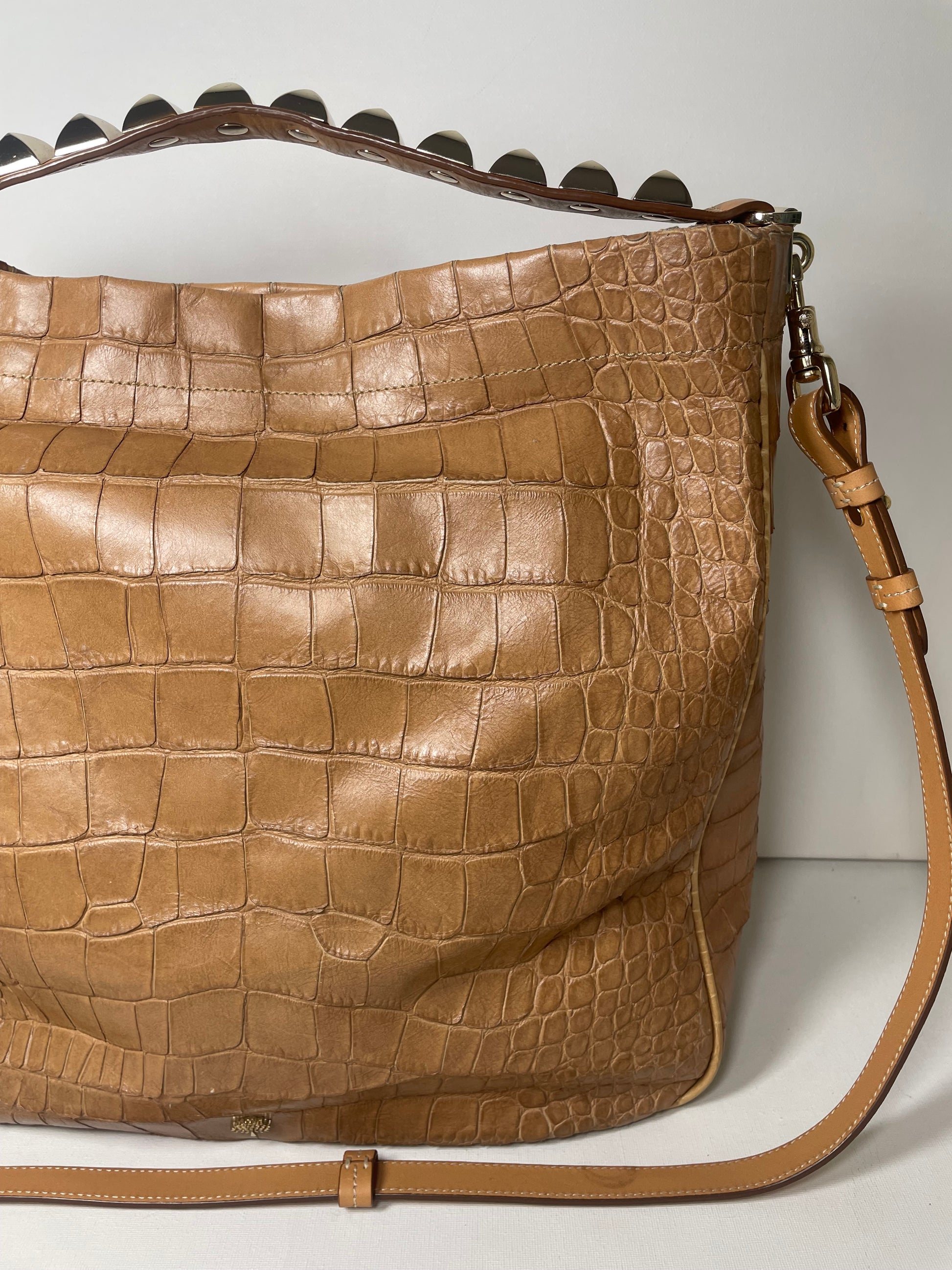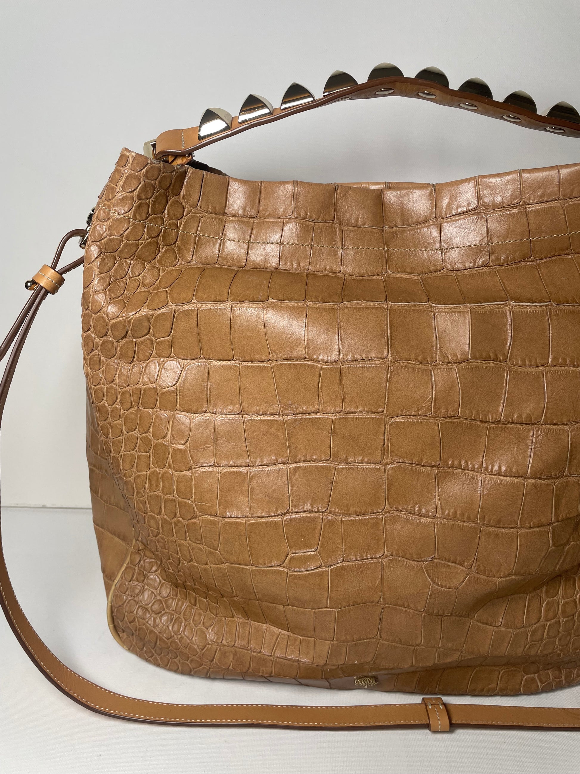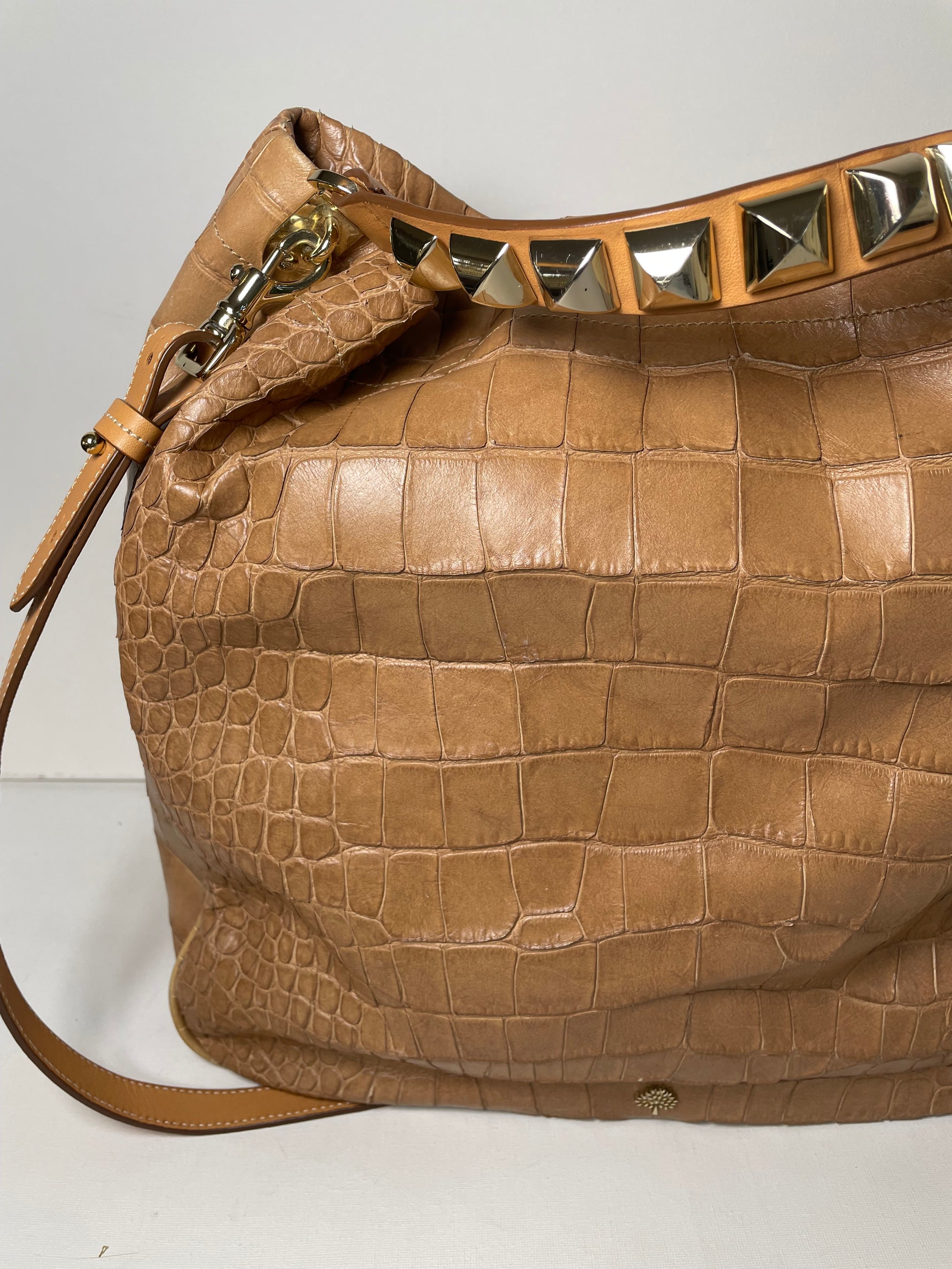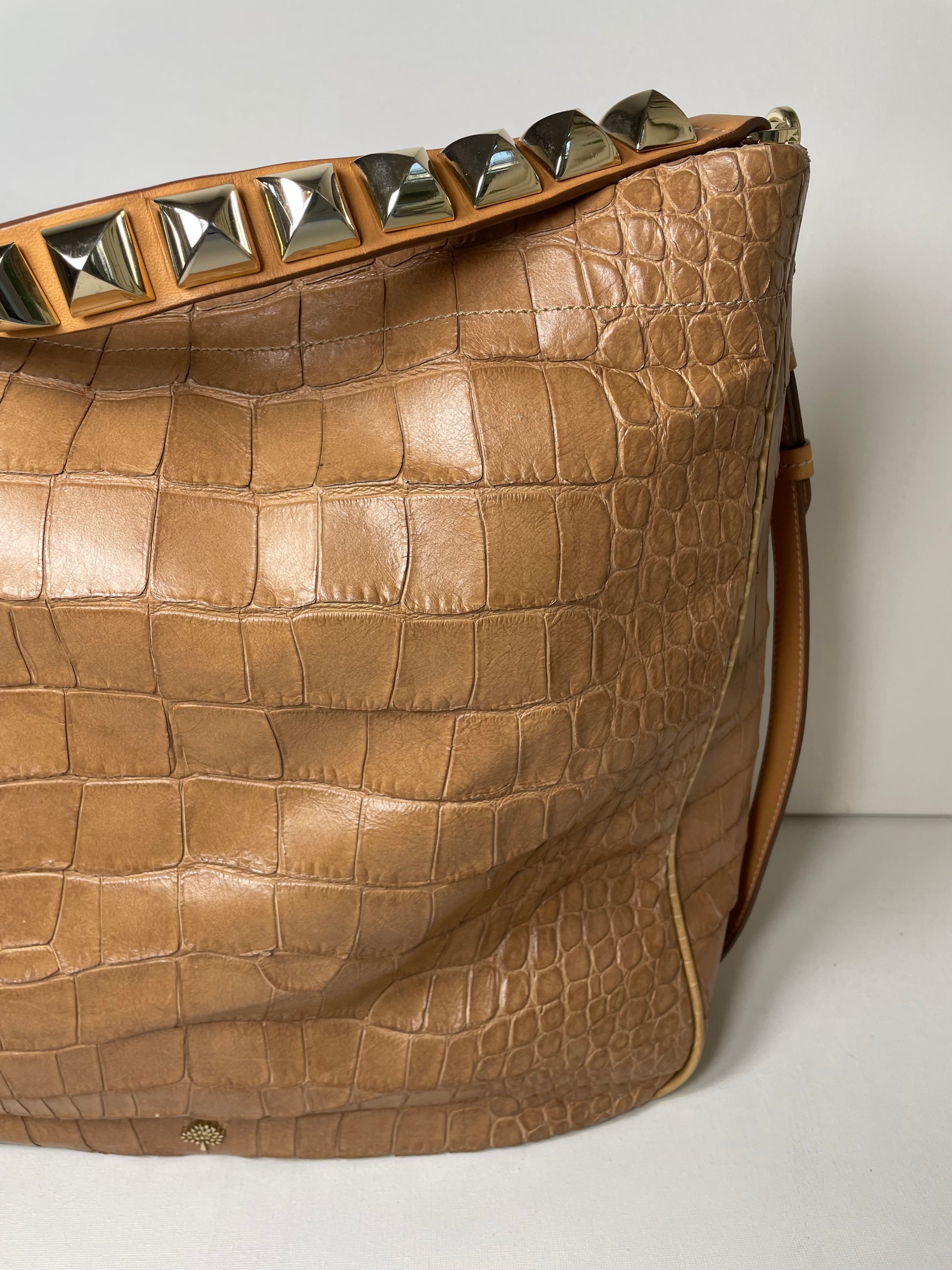 The Mulberry Eliza Hobo bag is both elegant and easy to use. The soft, slouchy moc croc leather, combined with the detailing of pyramid stud hardware creates a modern and edgy look. The Eliza bag can be carried by hand or in the nook of your arm via the studded top handle, the long removable carry strap allows you to wear it longer on the body or even crossbody for hands free convenience. Inside there is a main compartment and a secure zip close pocket and open slip pocket.