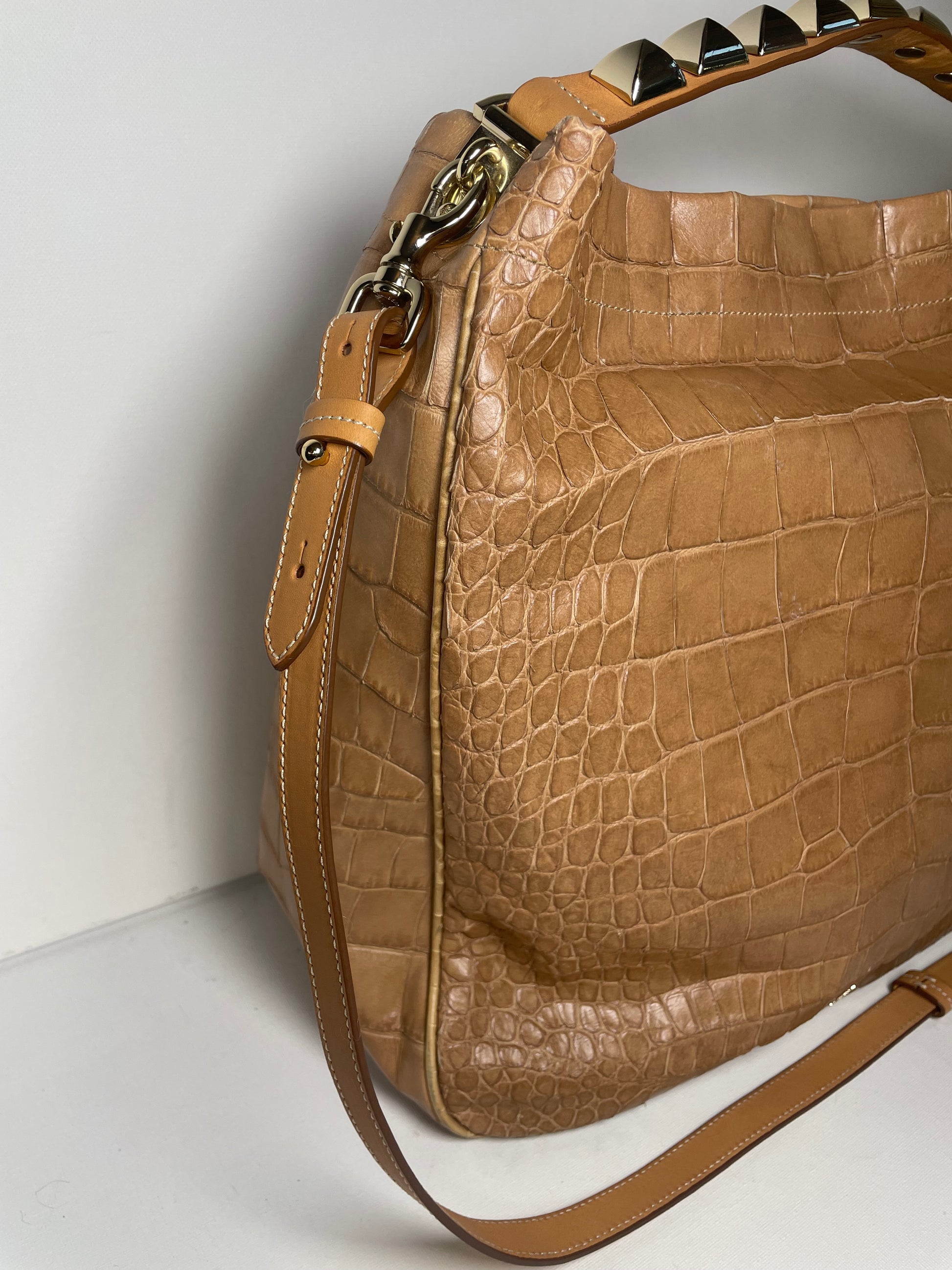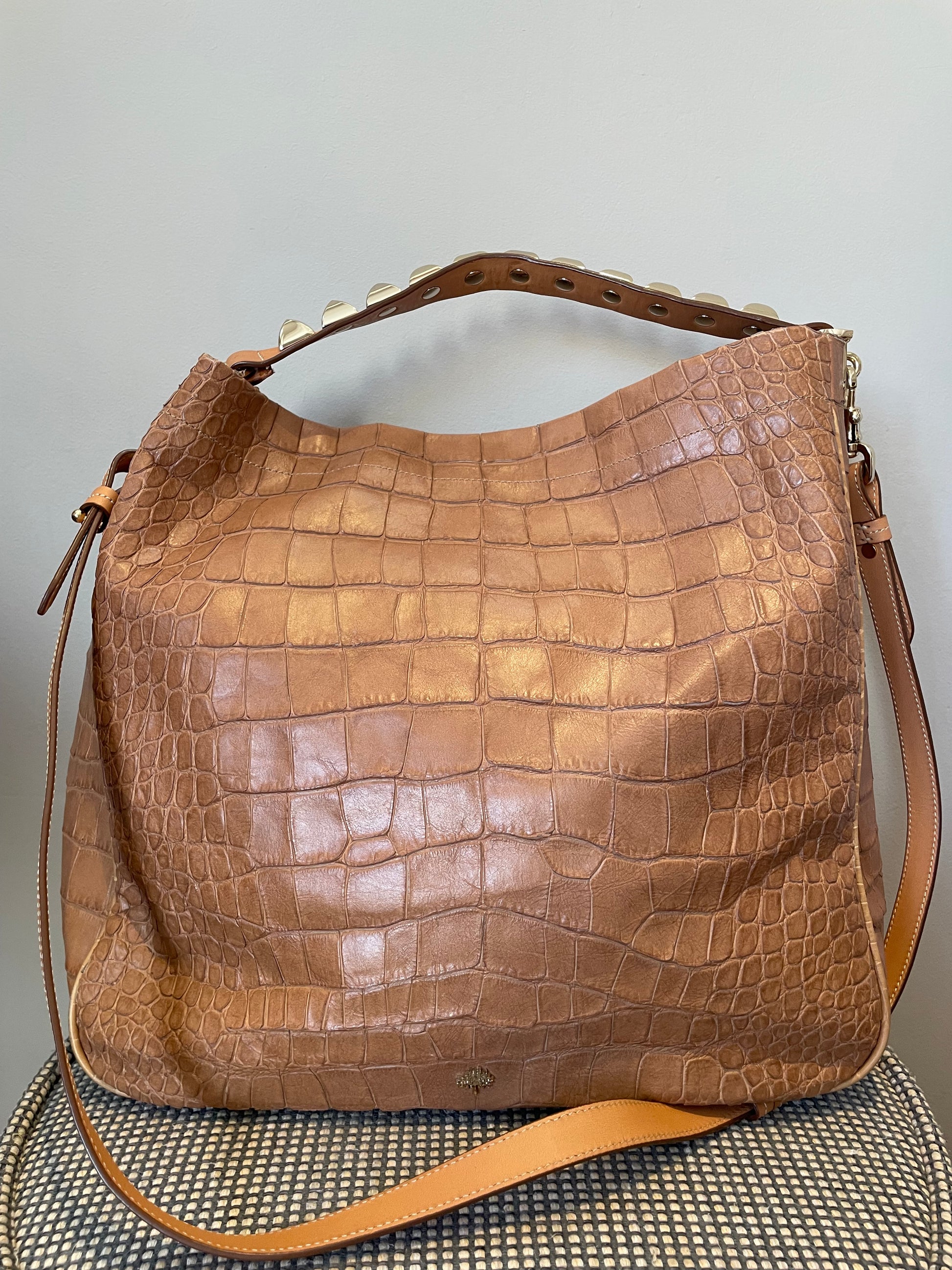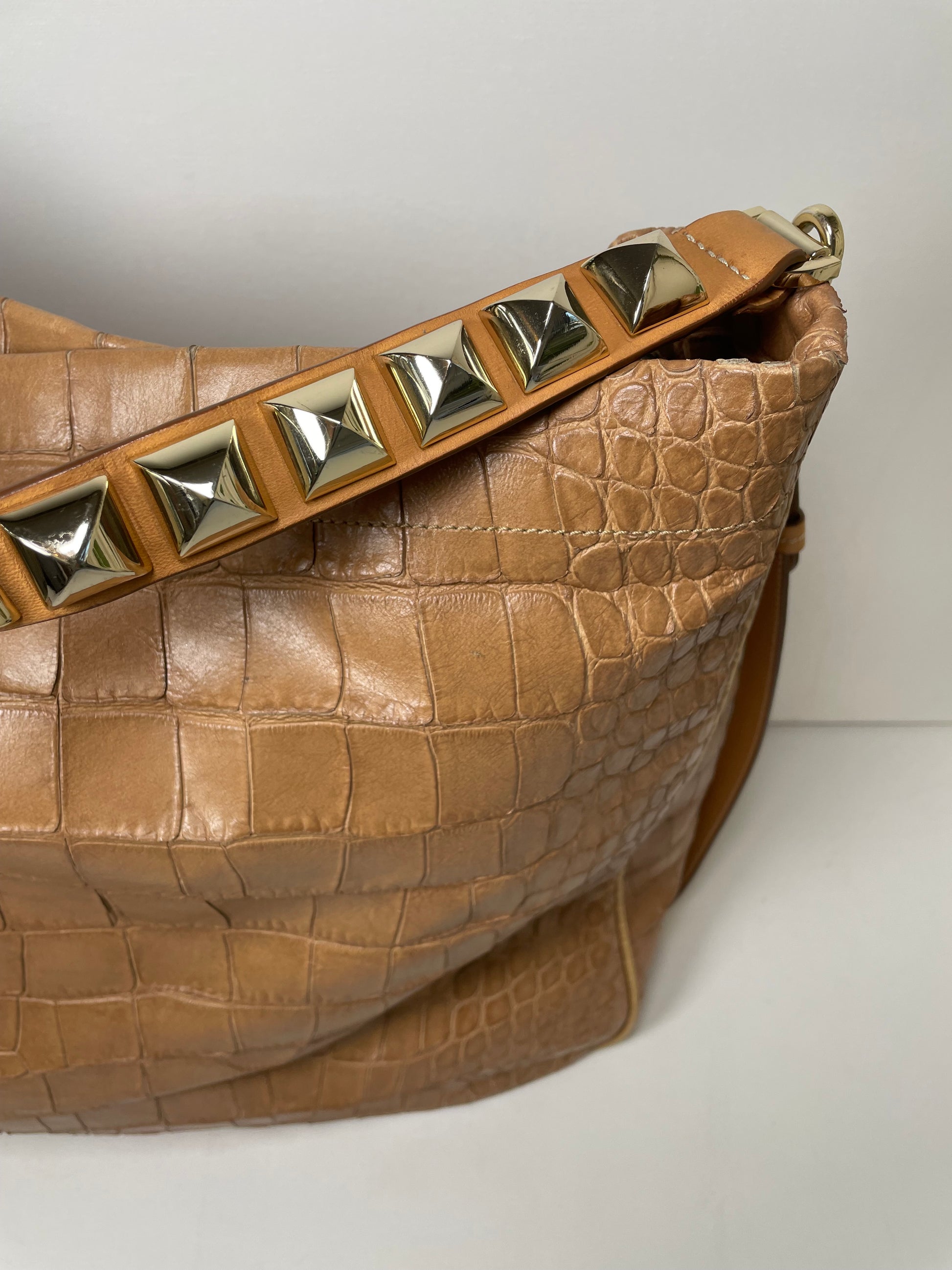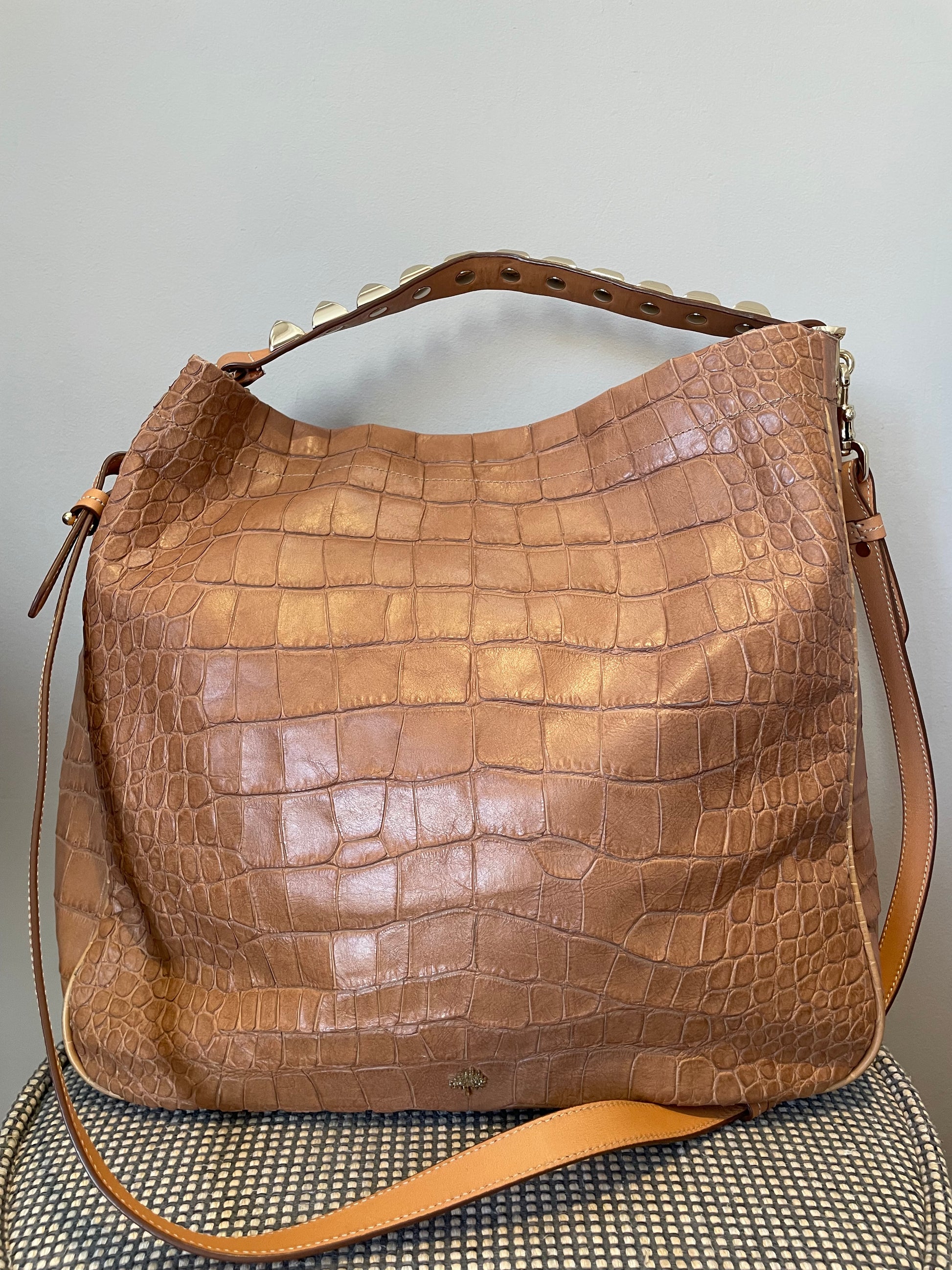 The Mulberry Eliza Hobo bag is both elegant and easy to use. The soft, slouchy moc croc leather, combined with the detailing of pyramid stud hardware creates a modern and edgy look. The Eliza bag can be carried by hand or in the nook of your arm via the studded top handle, the long removable carry strap allows you to wear it longer on the body or even crossbody for hands free convenience. Inside there is a main compartment and a secure zip close pocket and open slip pocket.