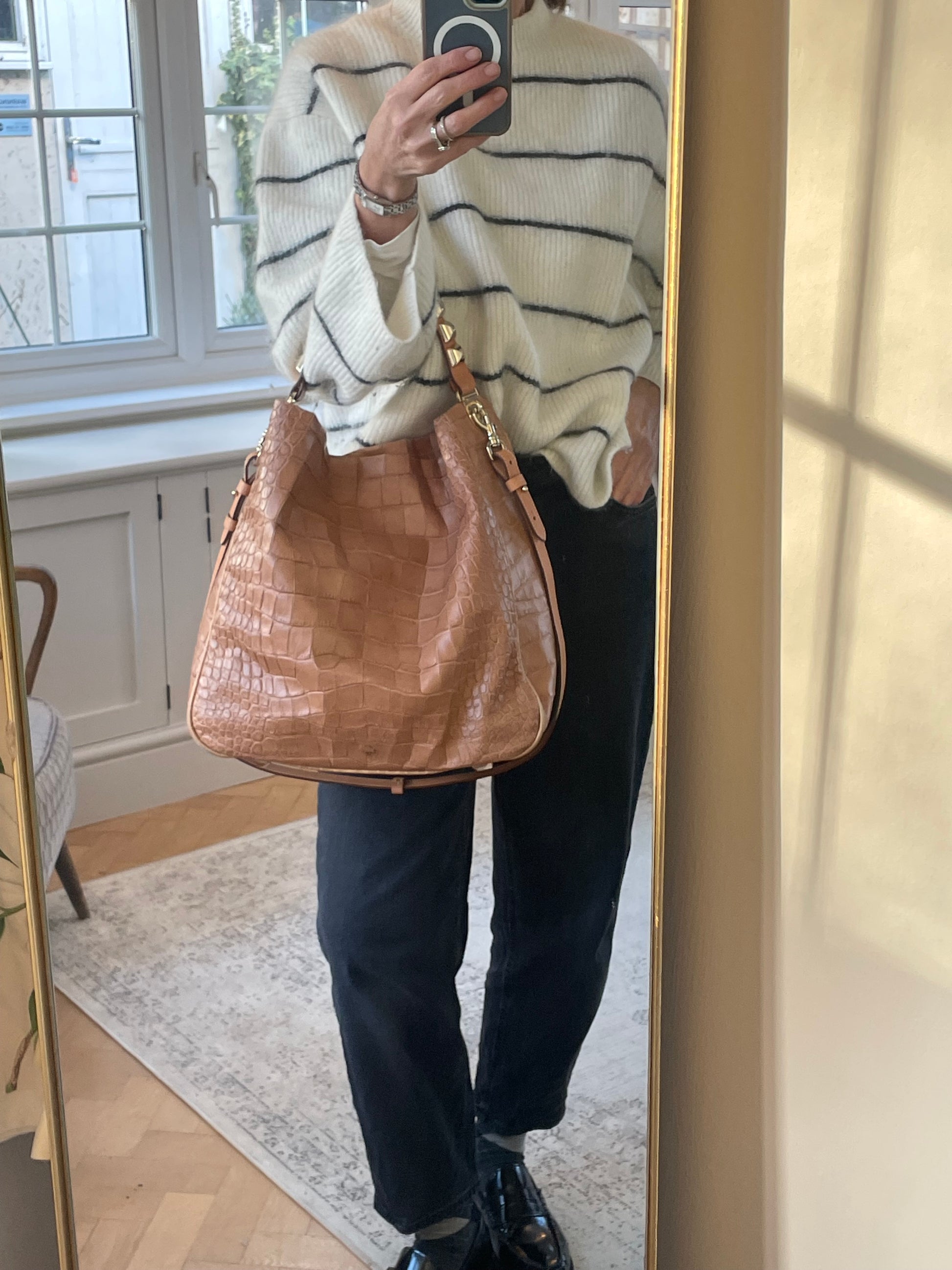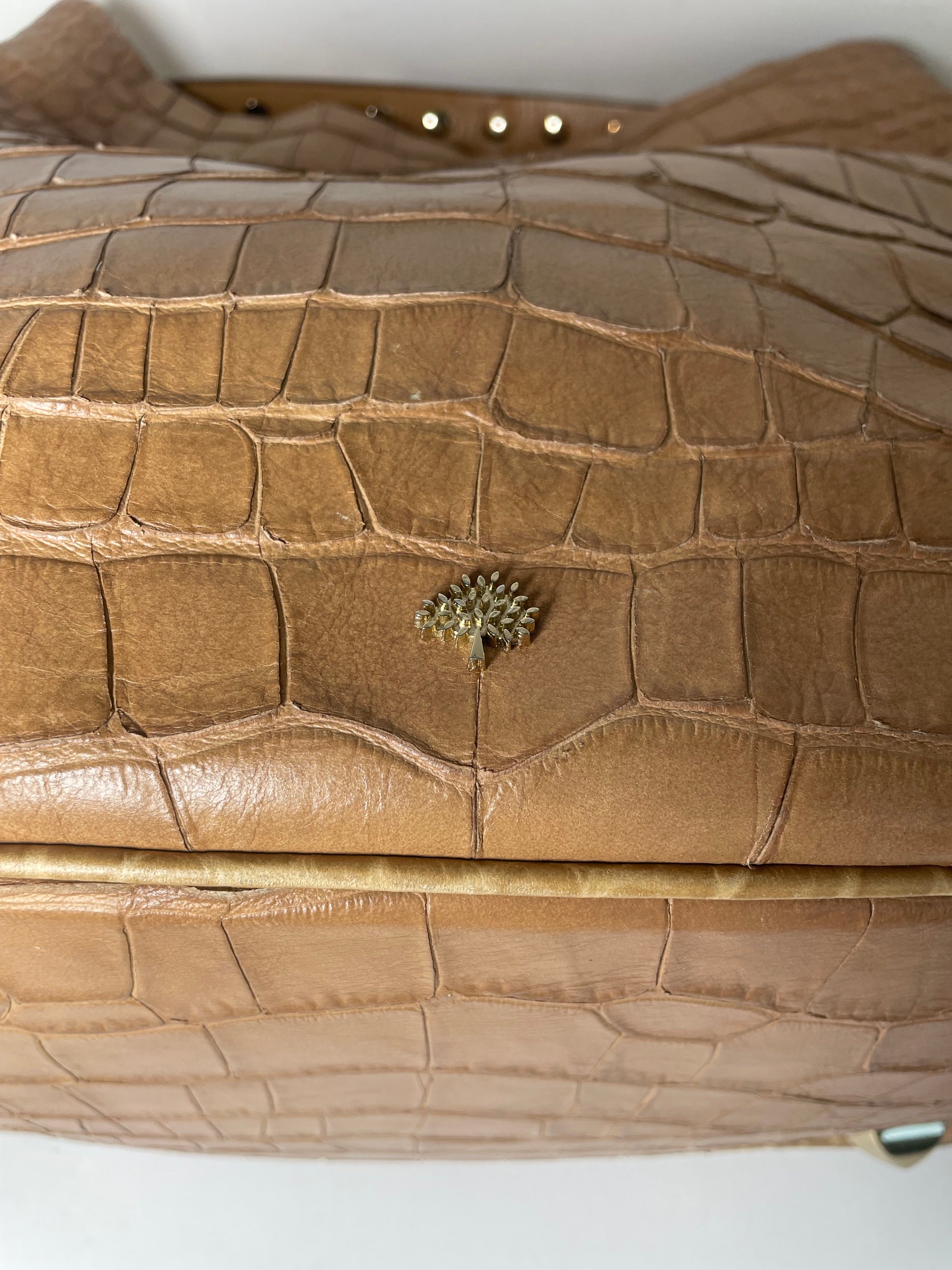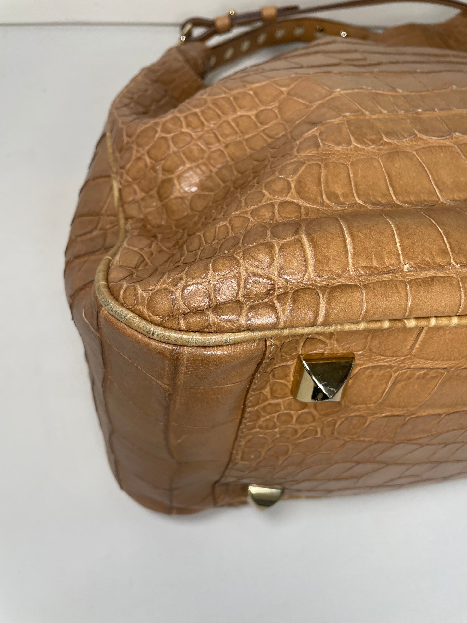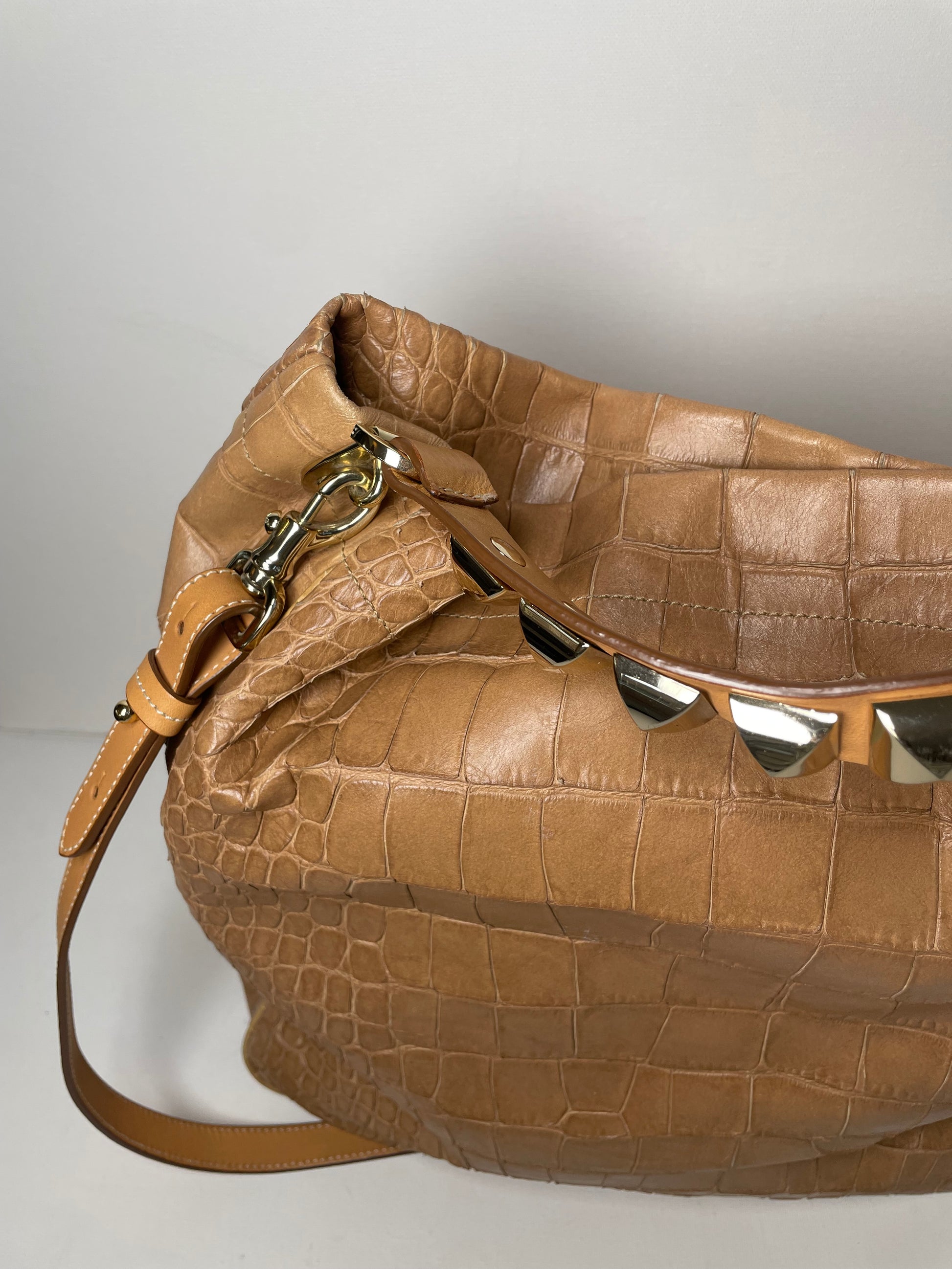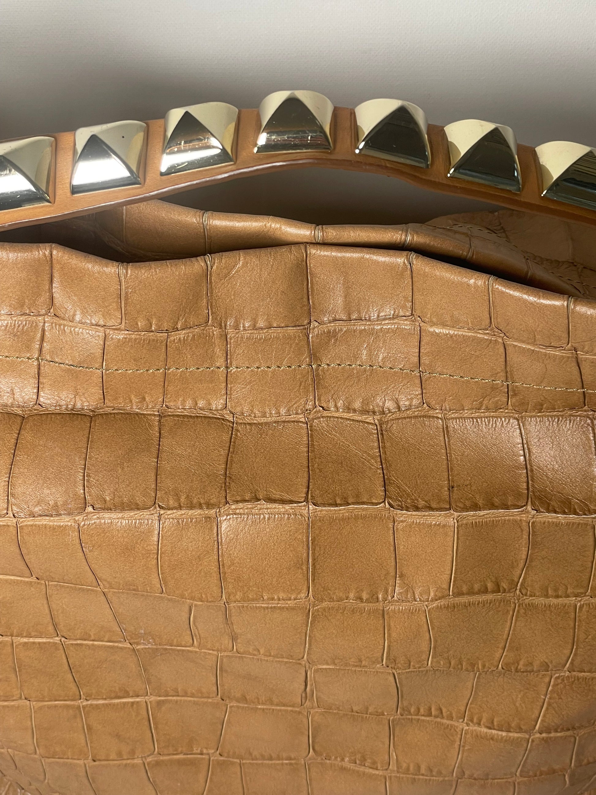 The Mulberry Eliza Hobo bag is both elegant and easy to use. The soft, slouchy moc croc leather, combined with the detailing of pyramid stud hardware creates a modern and edgy look. The Eliza bag can be carried by hand or in the nook of your arm via the studded top handle, the long removable carry strap allows you to wear it longer on the body or even crossbody for hands free convenience. Inside there is a main compartment and a secure zip close pocket and open slip pocket.