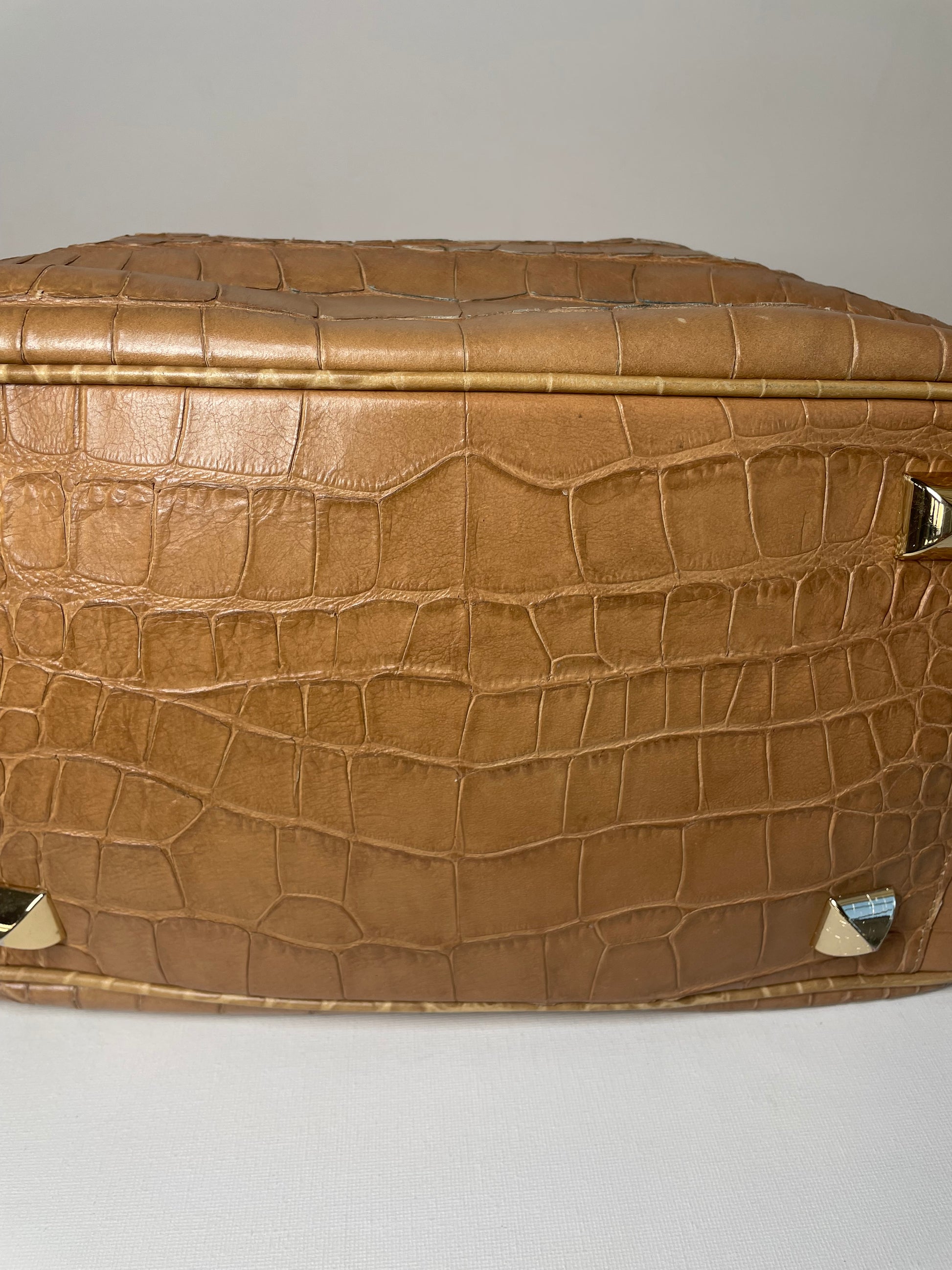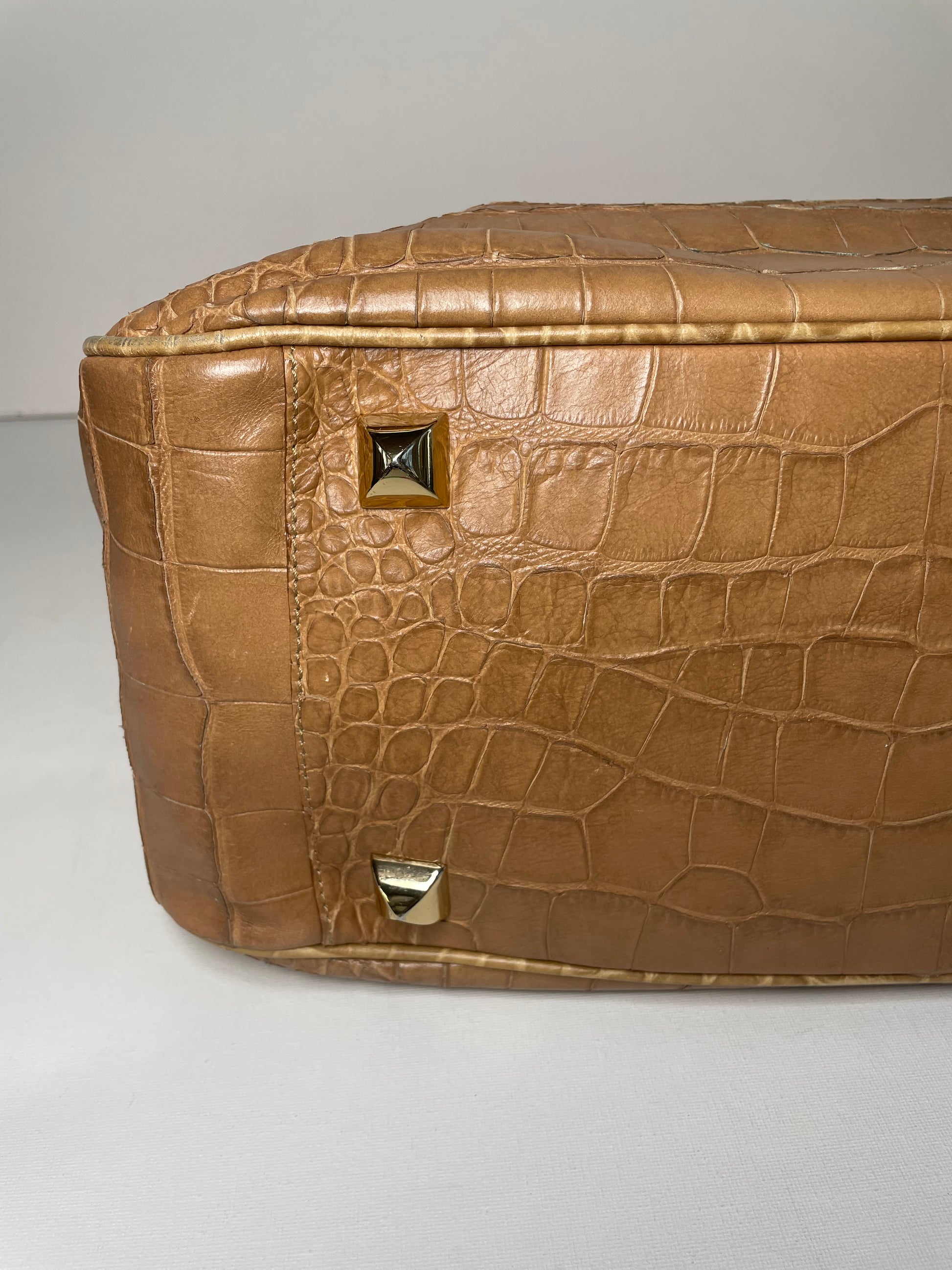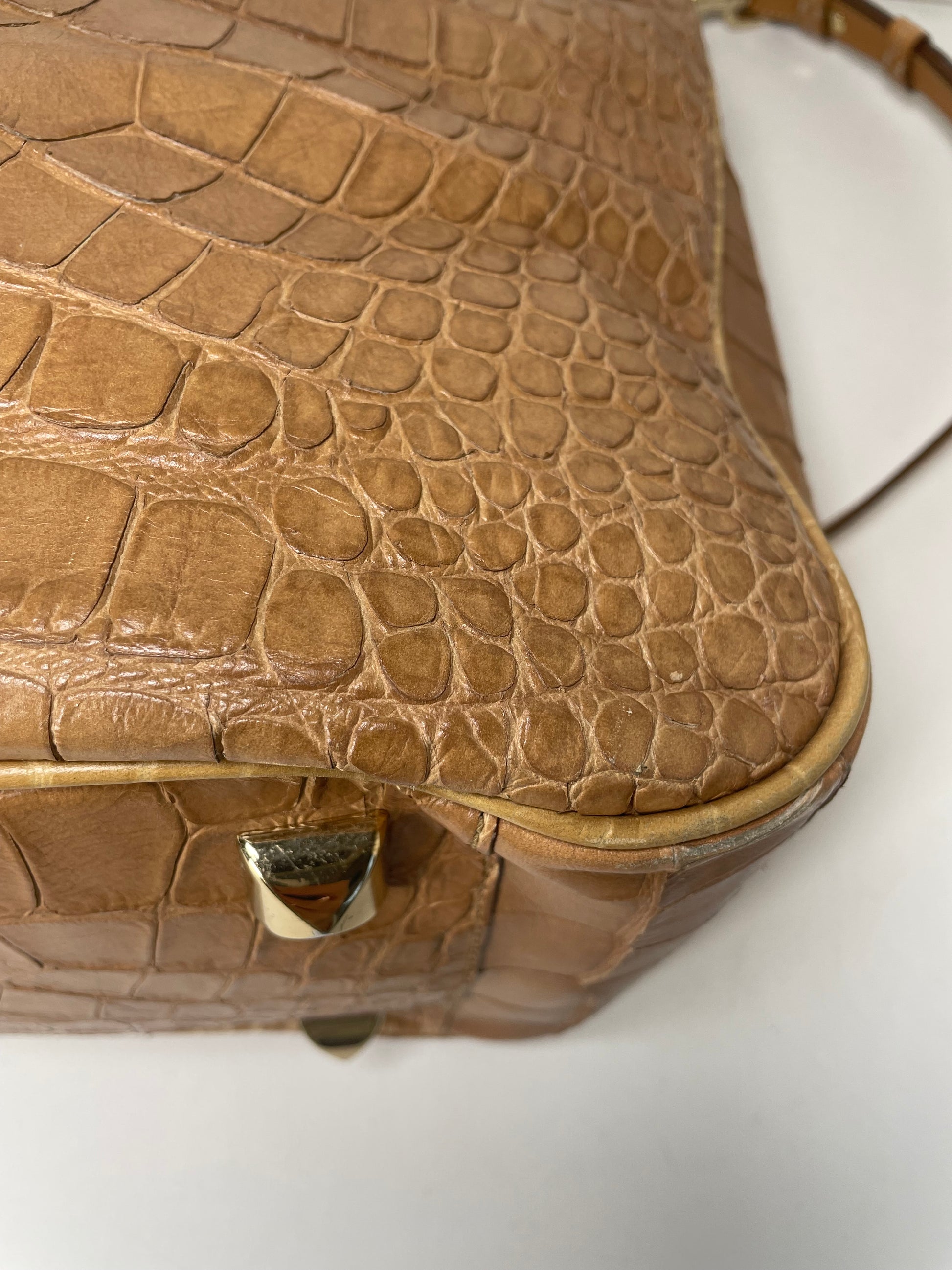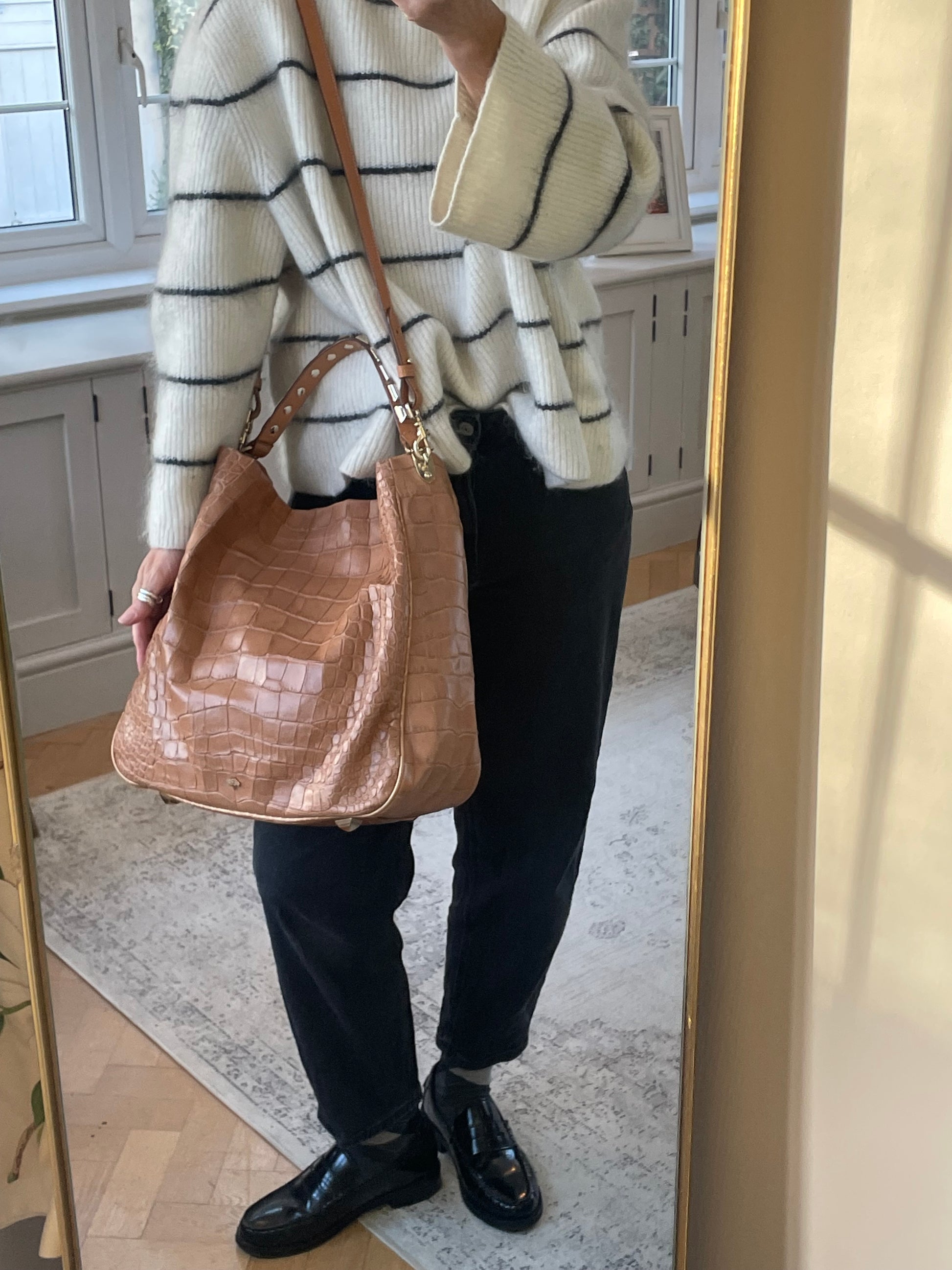 The Mulberry Eliza Hobo bag is both elegant and easy to use. The soft, slouchy moc croc leather, combined with the detailing of pyramid stud hardware creates a modern and edgy look. The Eliza bag can be carried by hand or in the nook of your arm via the studded top handle, the long removable carry strap allows you to wear it longer on the body or even crossbody for hands free convenience. Inside there is a main compartment and a secure zip close pocket and open slip pocket.