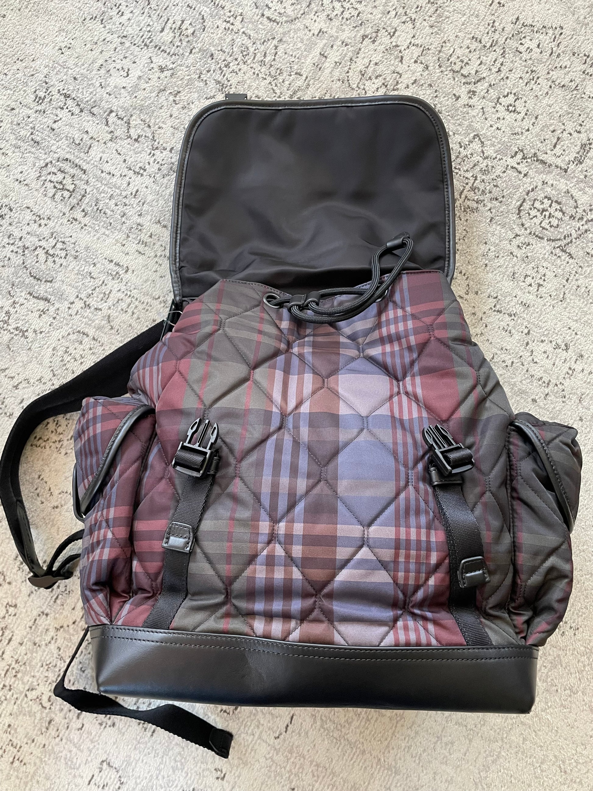 This is a beautiful Mulberry multicolour Heritage backpack in the iconic Heritage check. This quilted nylon backpack is beautifully light with black leather trim and base panels which means it will last. The bag features a buckle fastening, embossed logo to the front, two padded adjustable shoulder straps and side pockets, along with a top grab handle. The pull cord closure is perfect for keeping everything safe inside. Internally there is a back zip close pocket.