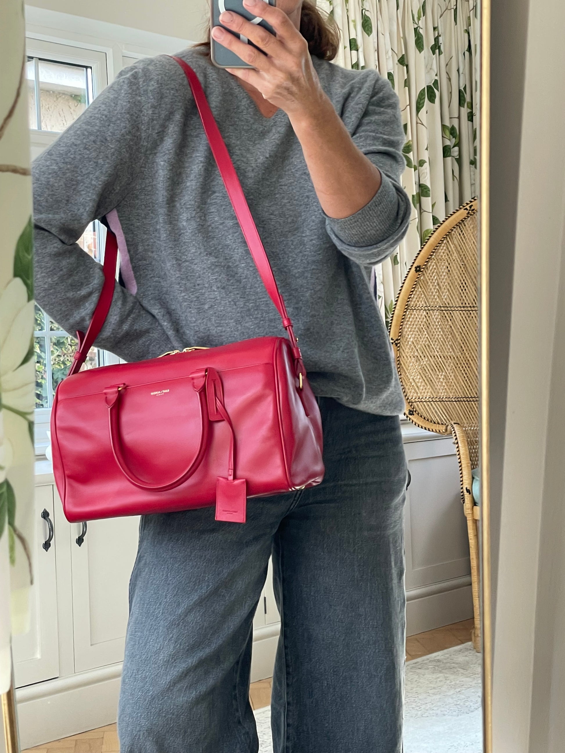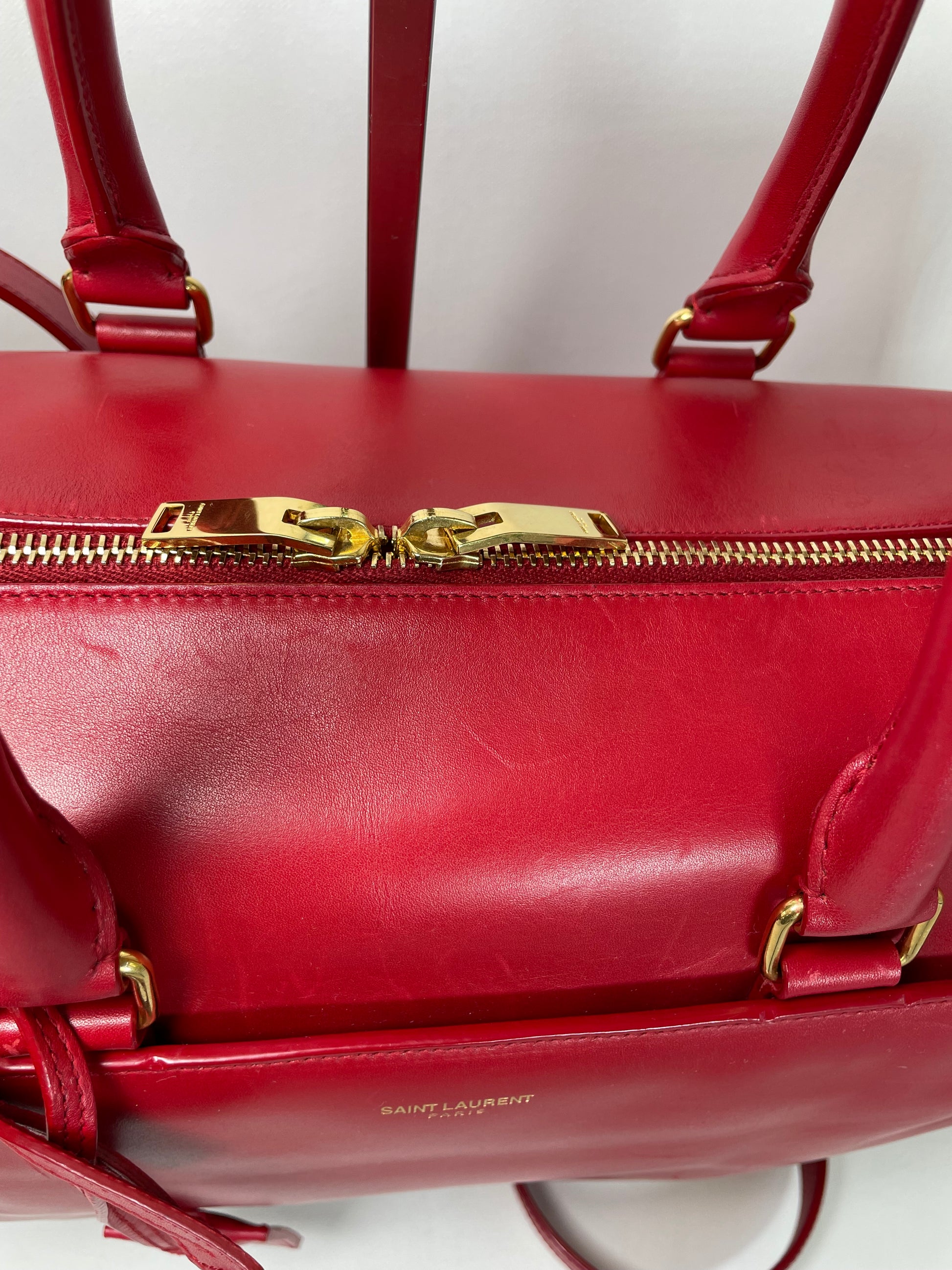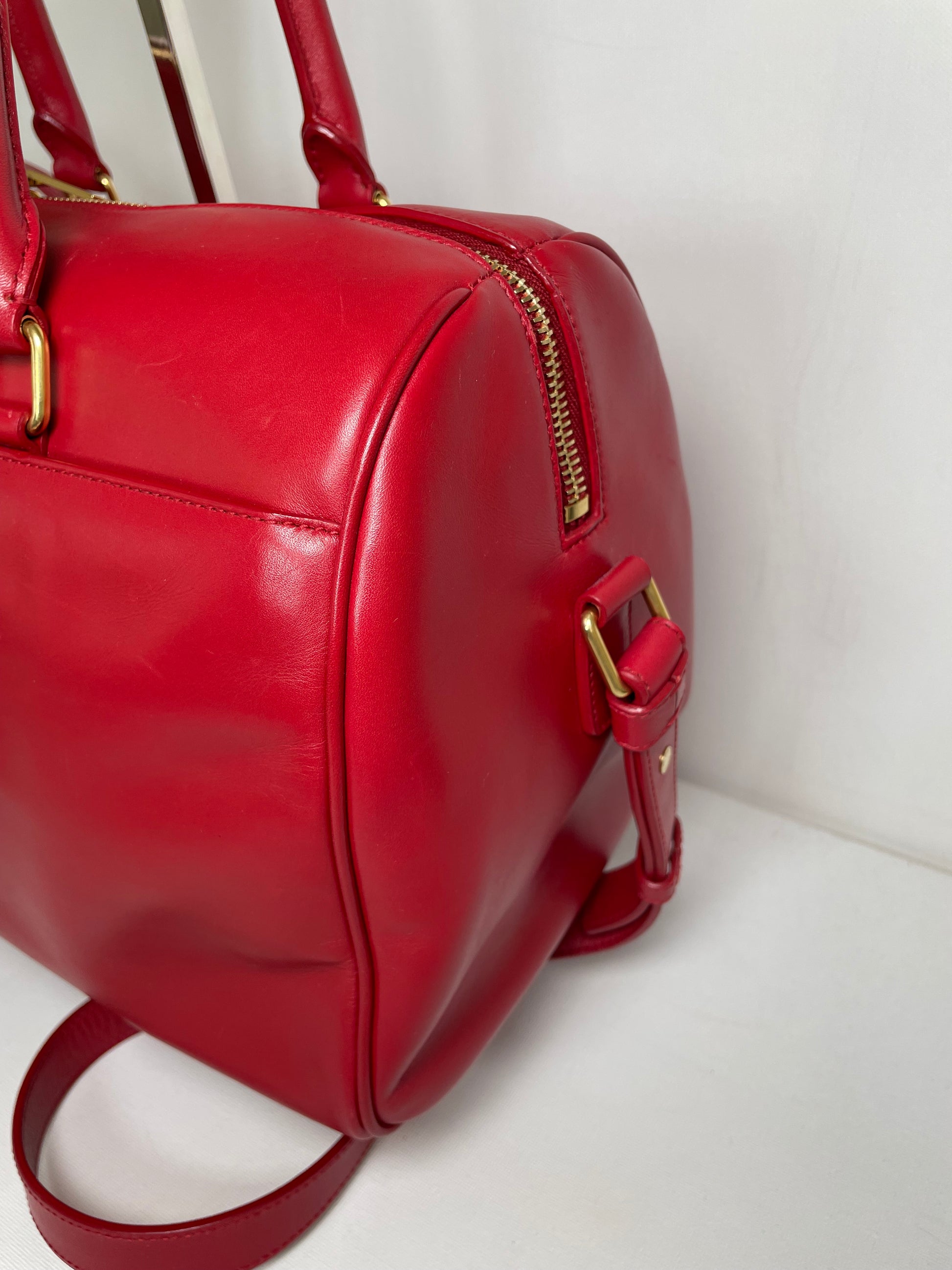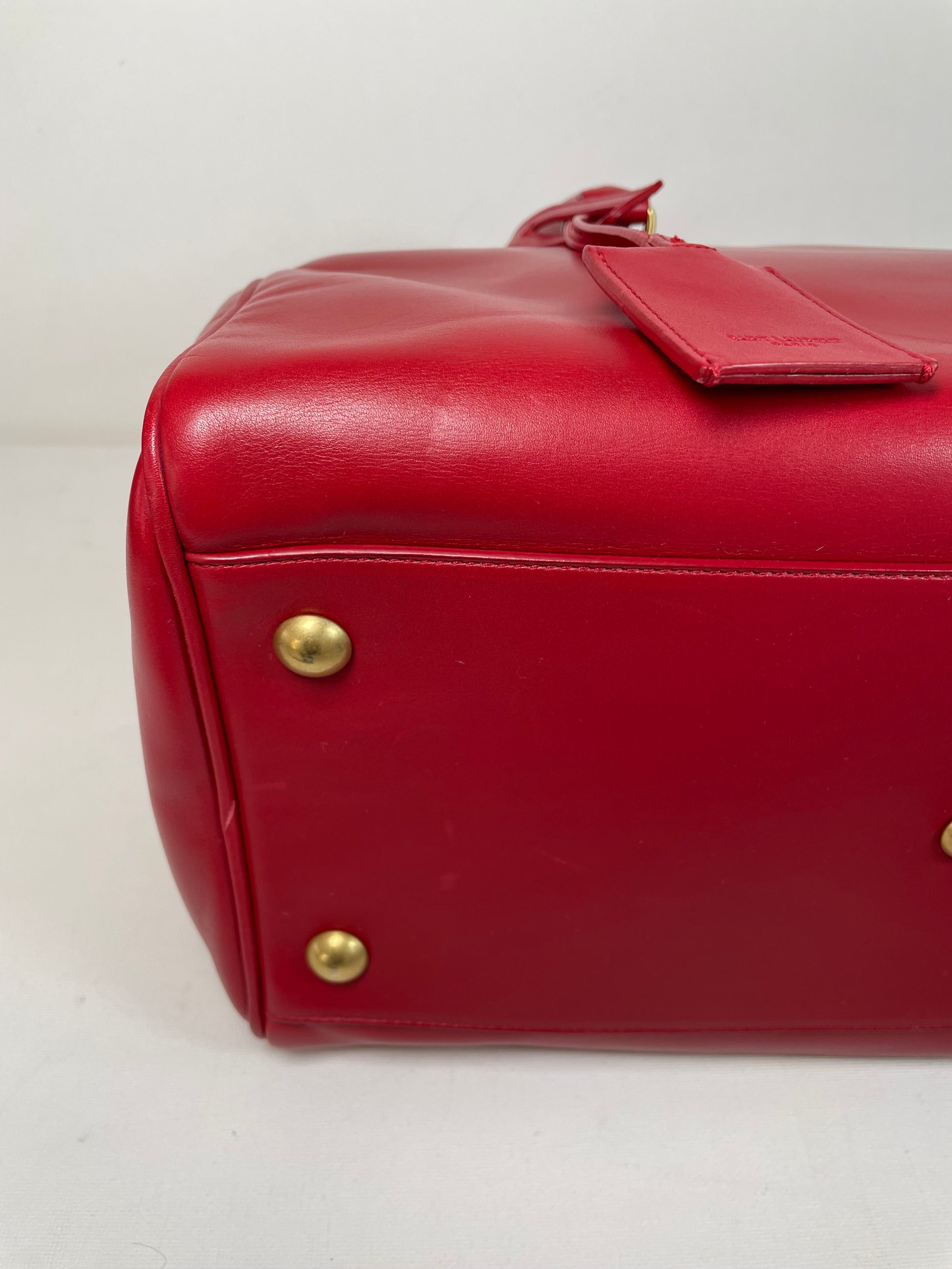 This Saint Laurent Duffle 6 Bag has clean lines, a simple design and luxurious finish and is modern and classic at the same time. The colour is a vibrant Cherry Red. The Duffle features a leather body, rolled leather handles, a detachable flat strap, a top zip closure, and an interior slip pocket as well as an exterior slip pocket.