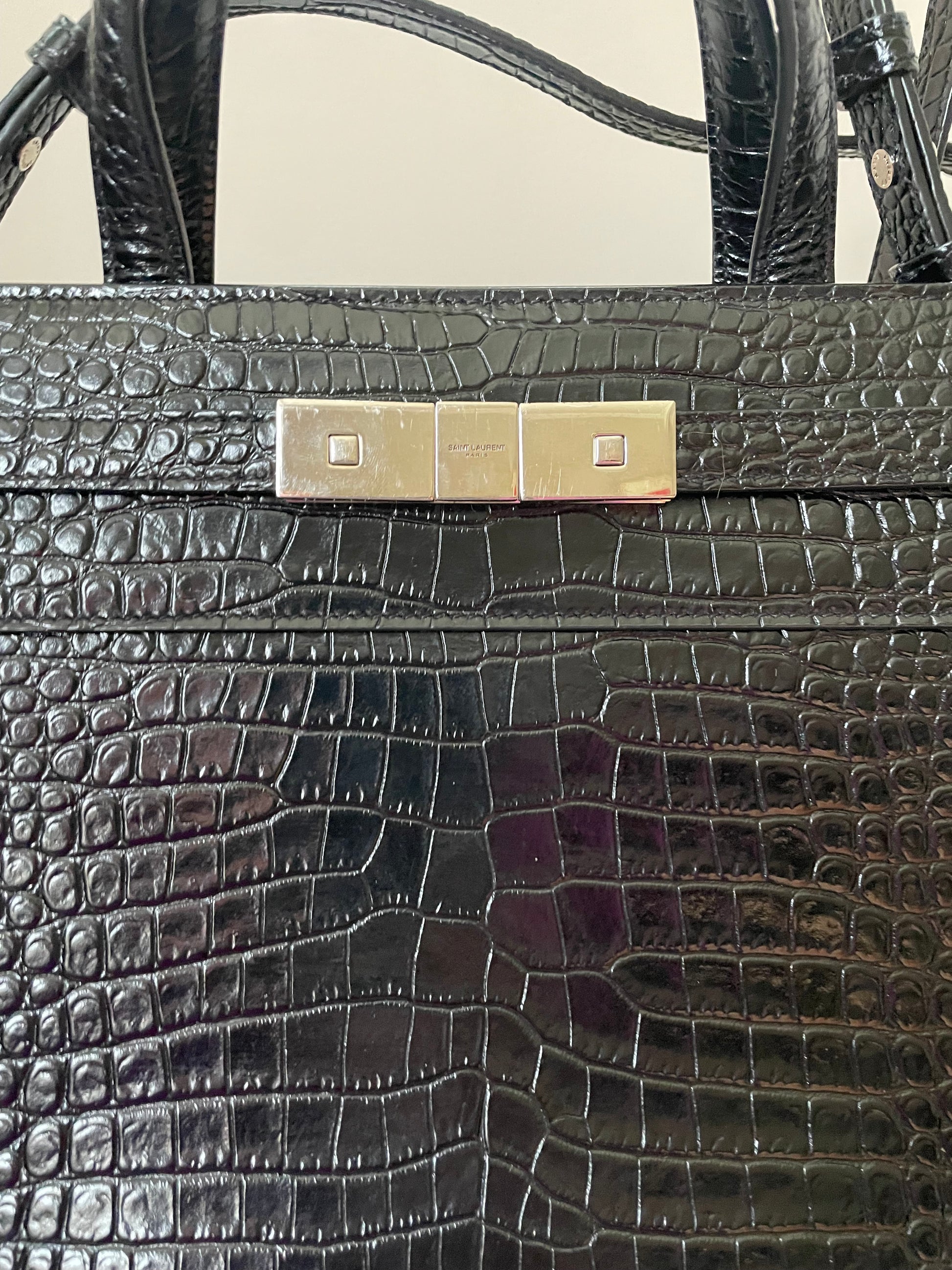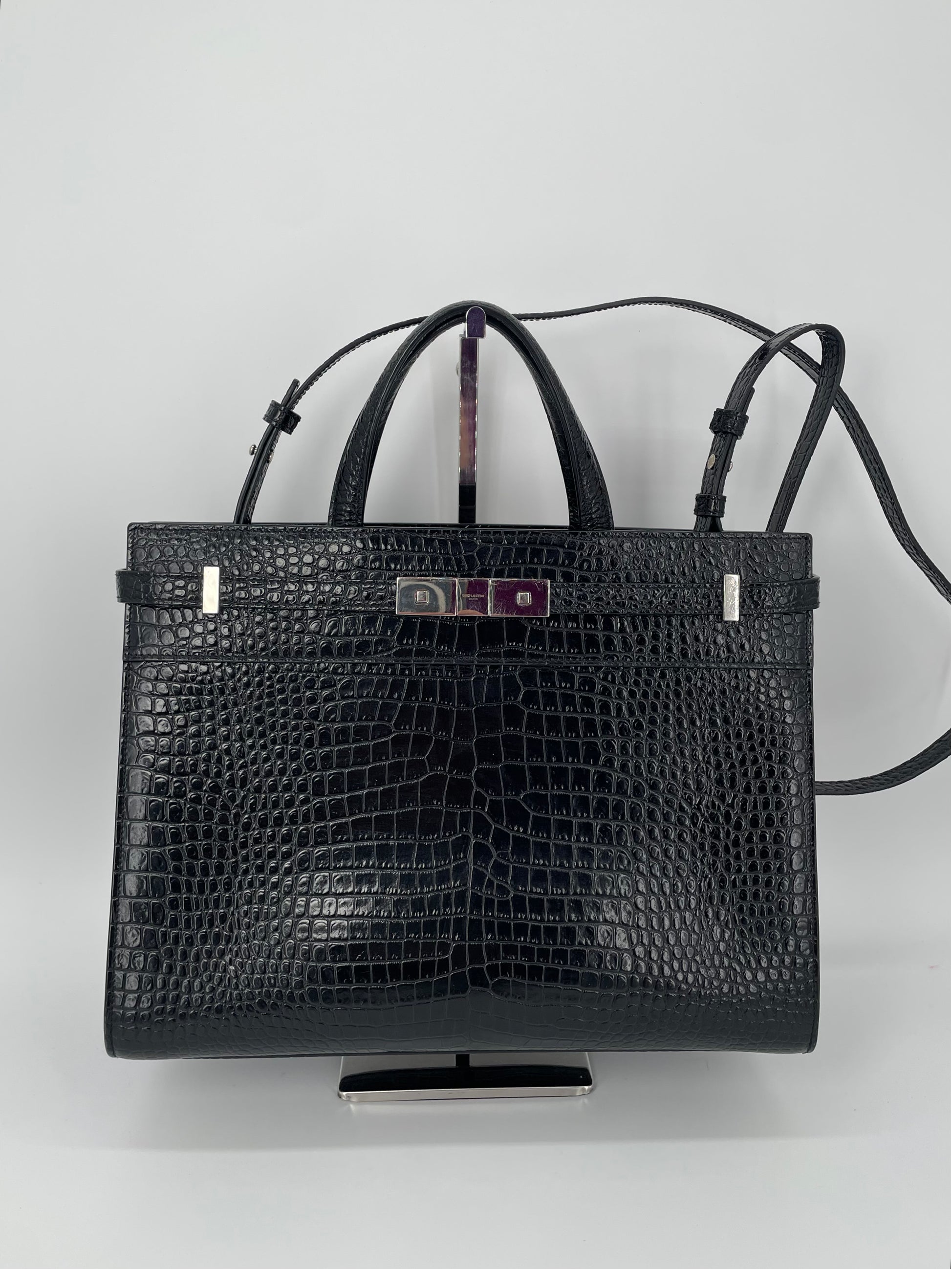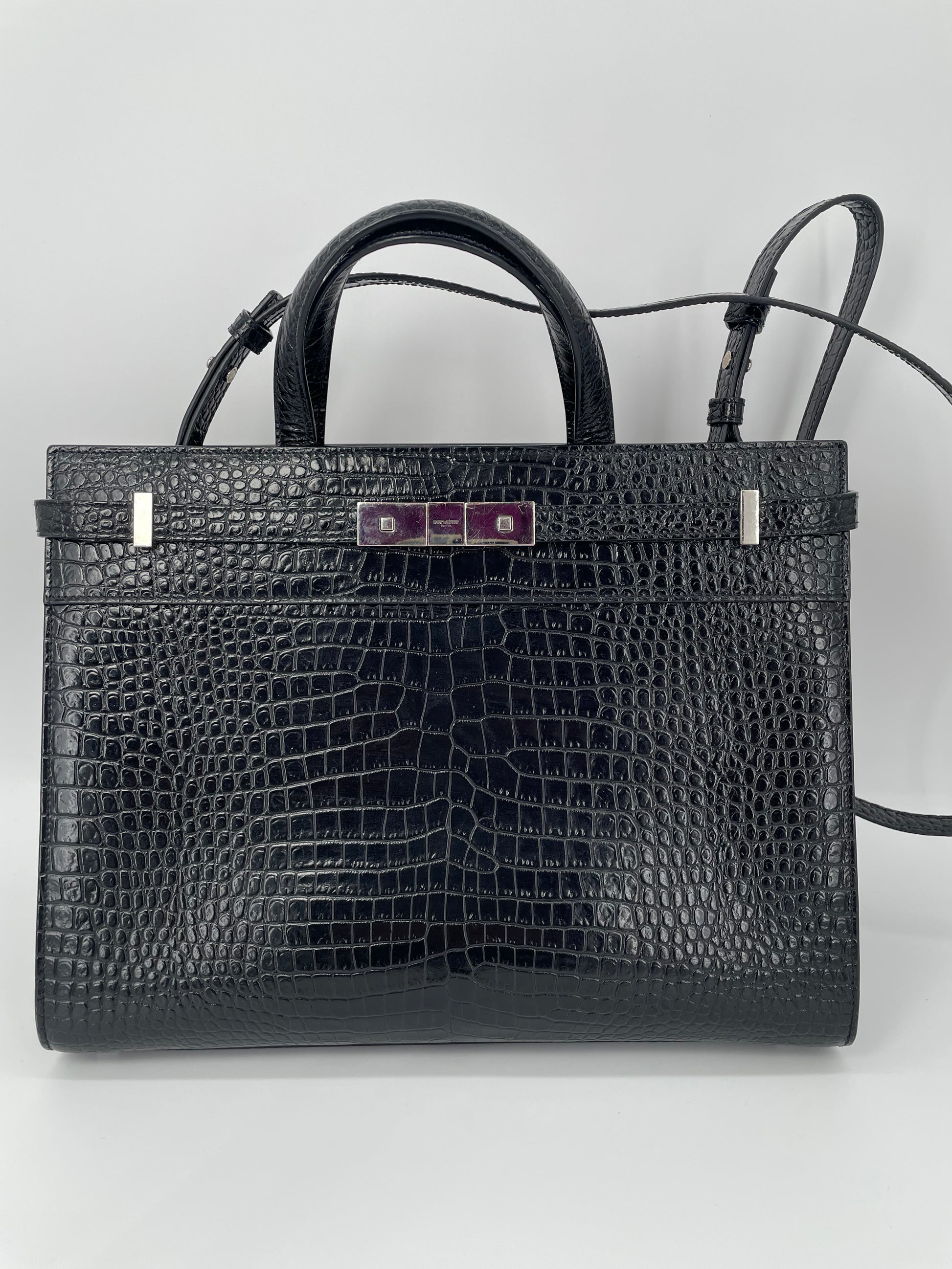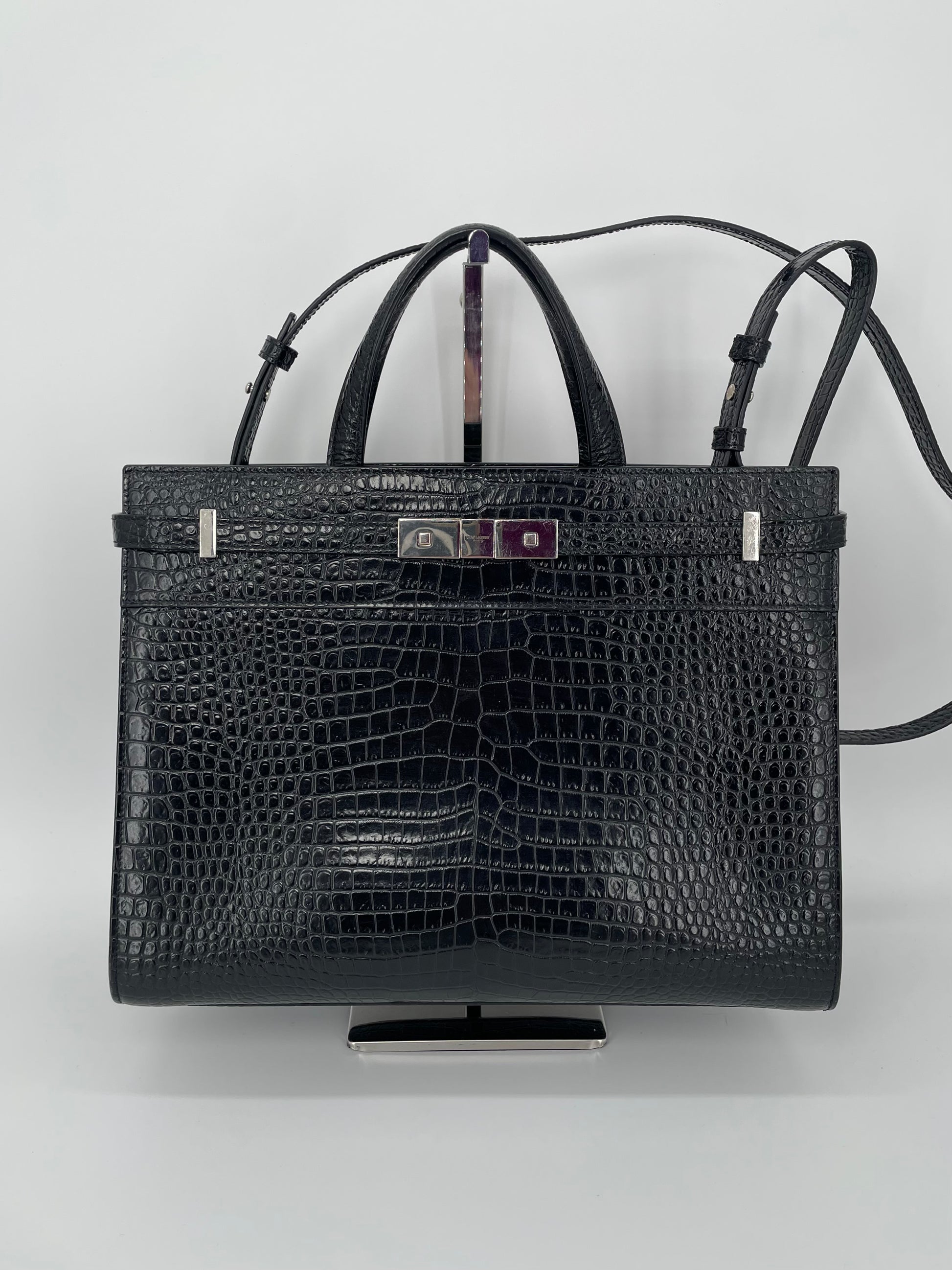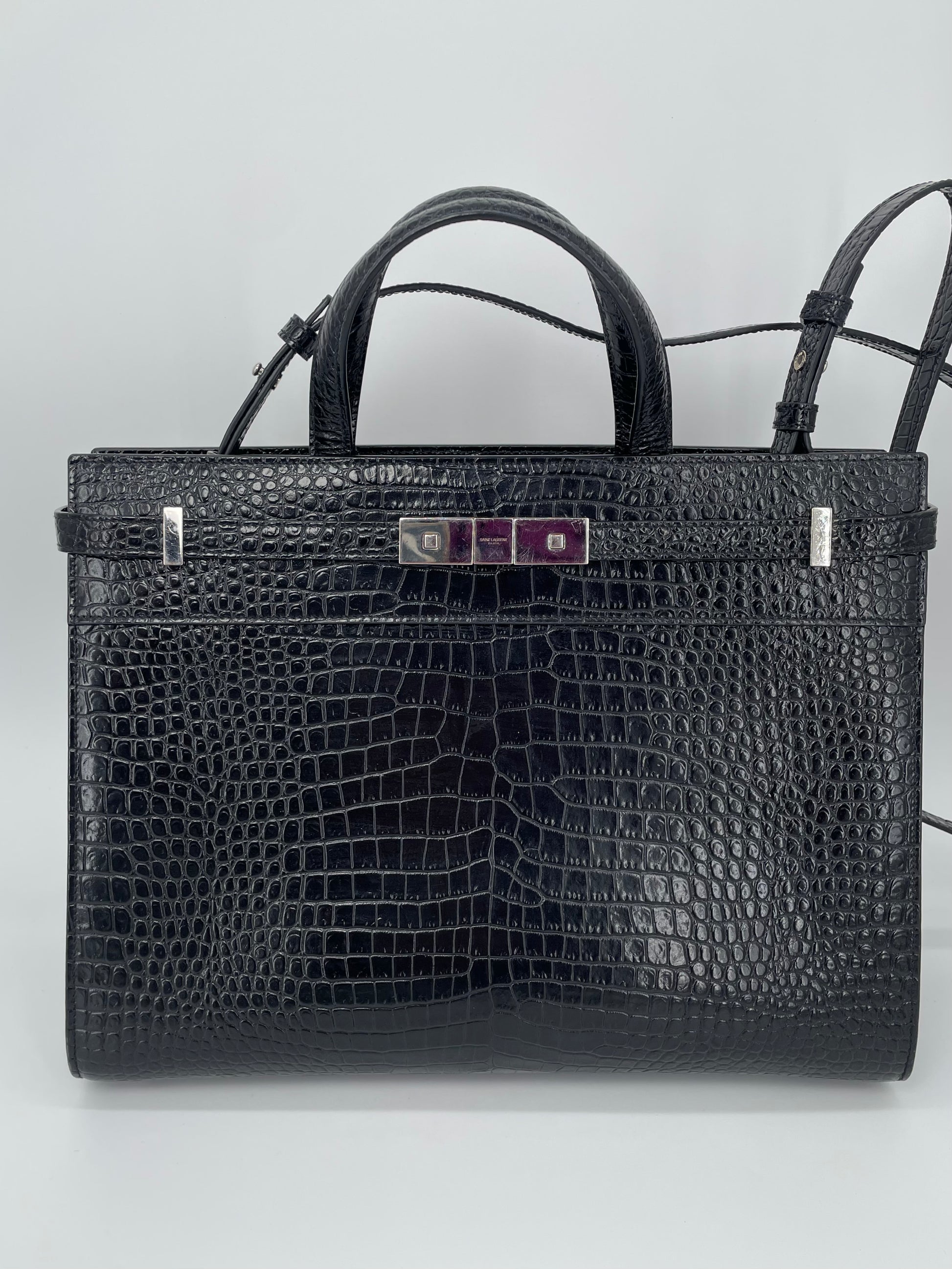 This is a stunning Saint Laurent Manhattan tote bag in sleek, textured, Moc Croc black leather and silvertone hardware. The brand is known for creating modern and edgy designs and this sleek and structured Manhattan Tote is perfect for the sophisticated woman. The combination of top handles and a detachable long strap allows the bag to be truly versatile. This bag has plenty of space for your daily essentials, whilst the zip close internal pocket allows you to keep your belongings secure. It's a structured piece so creates a polished finish to any look.