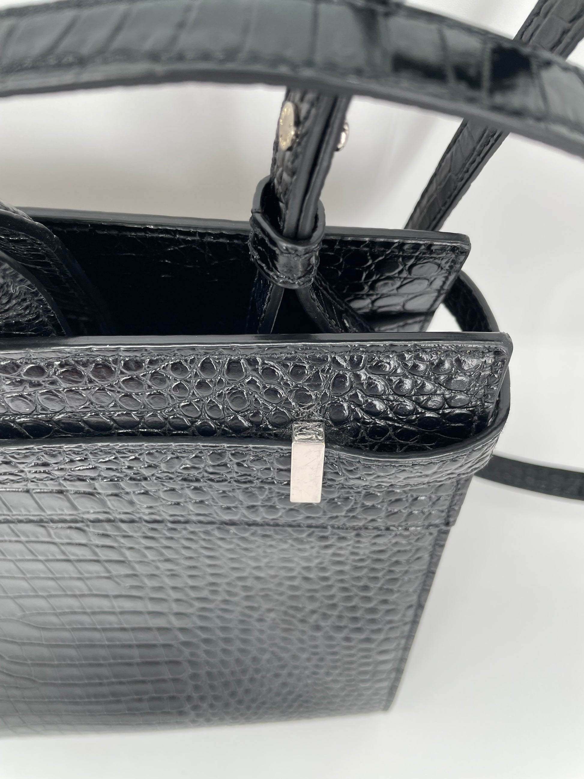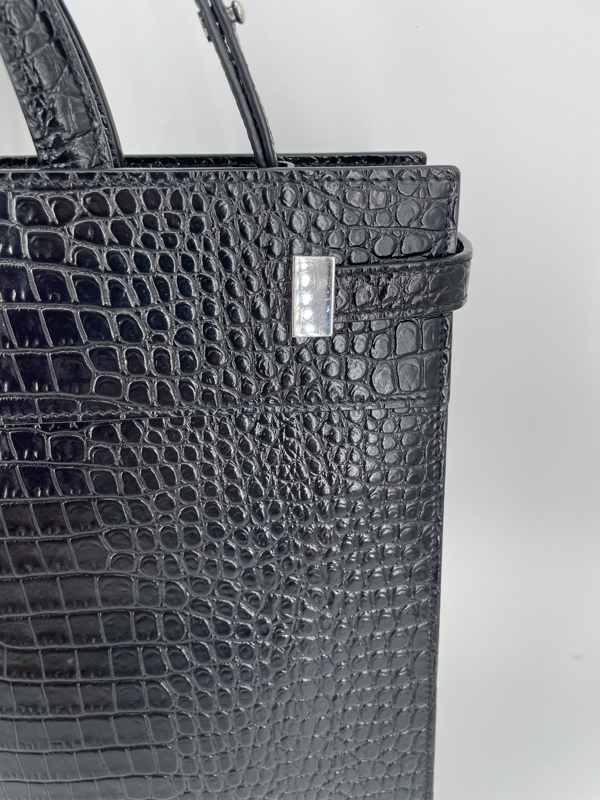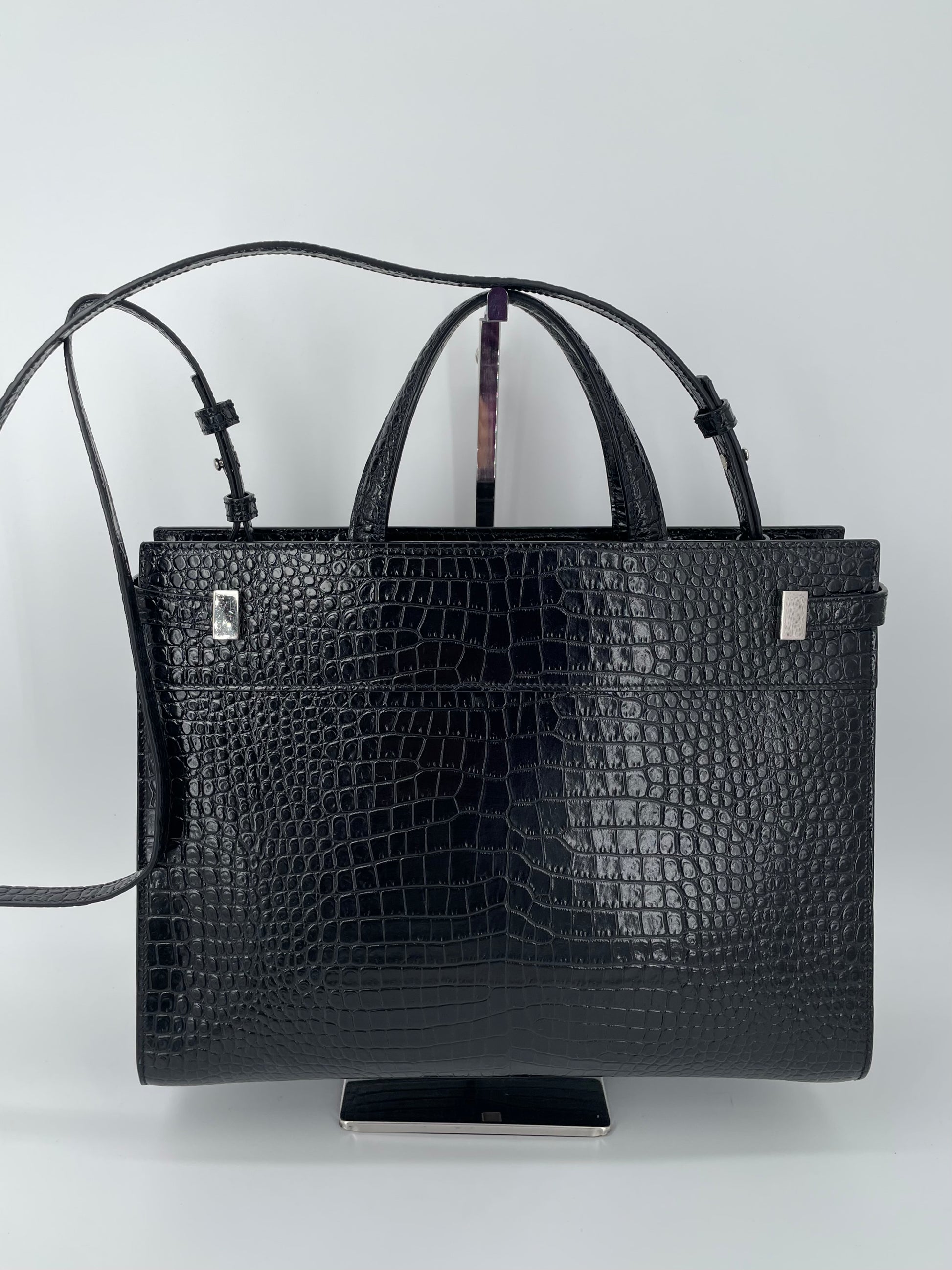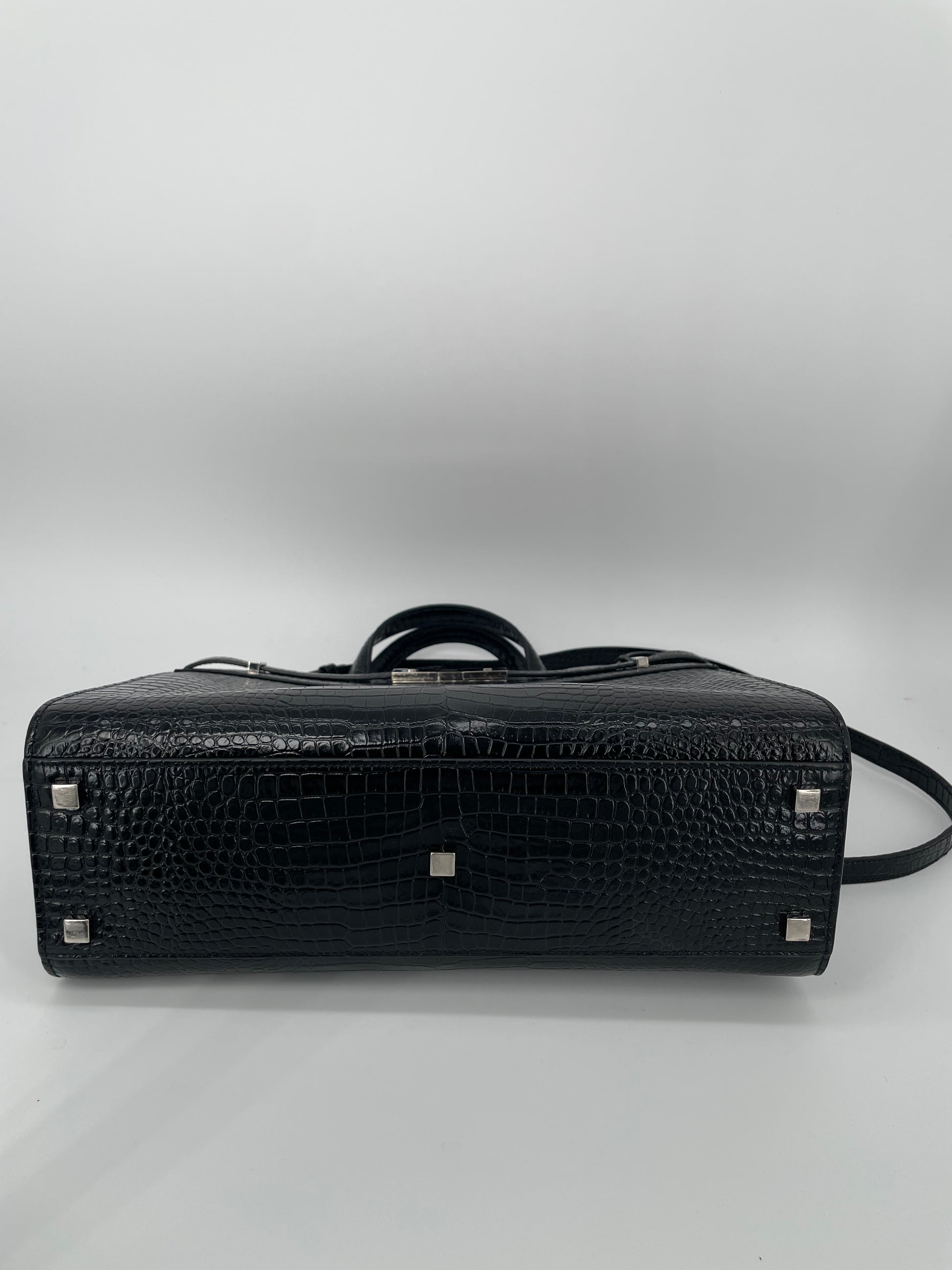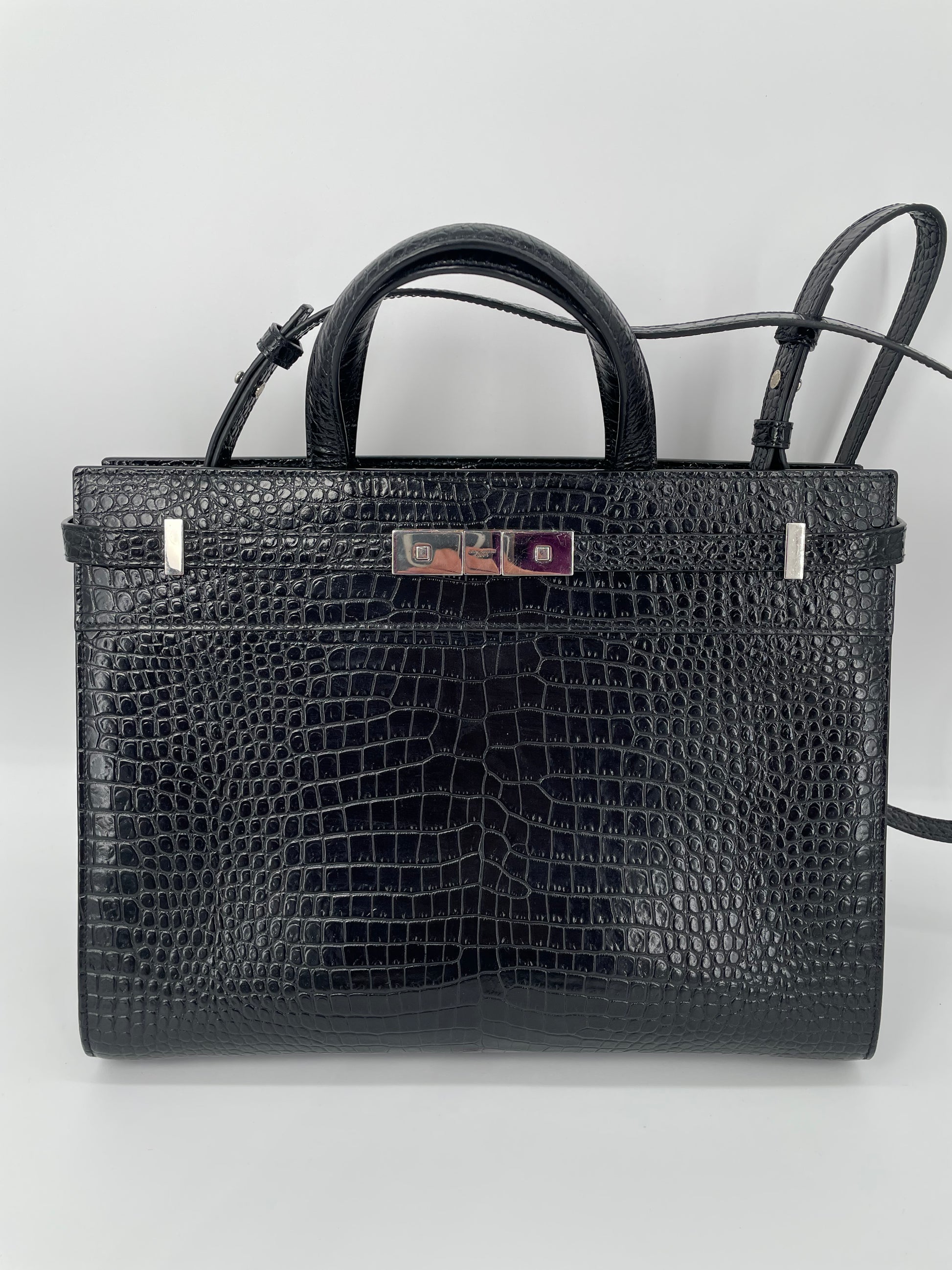 This is a stunning Saint Laurent Manhattan tote bag in sleek, textured, Moc Croc black leather and silvertone hardware. The brand is known for creating modern and edgy designs and this sleek and structured Manhattan Tote is perfect for the sophisticated woman. The combination of top handles and a detachable long strap allows the bag to be truly versatile. This bag has plenty of space for your daily essentials, whilst the zip close internal pocket allows you to keep your belongings secure. It's a structured piece so creates a polished finish to any look.