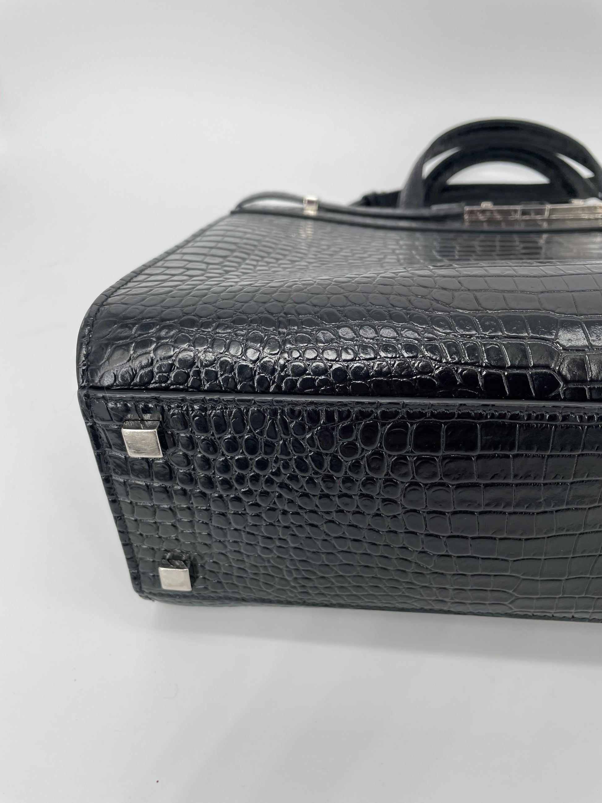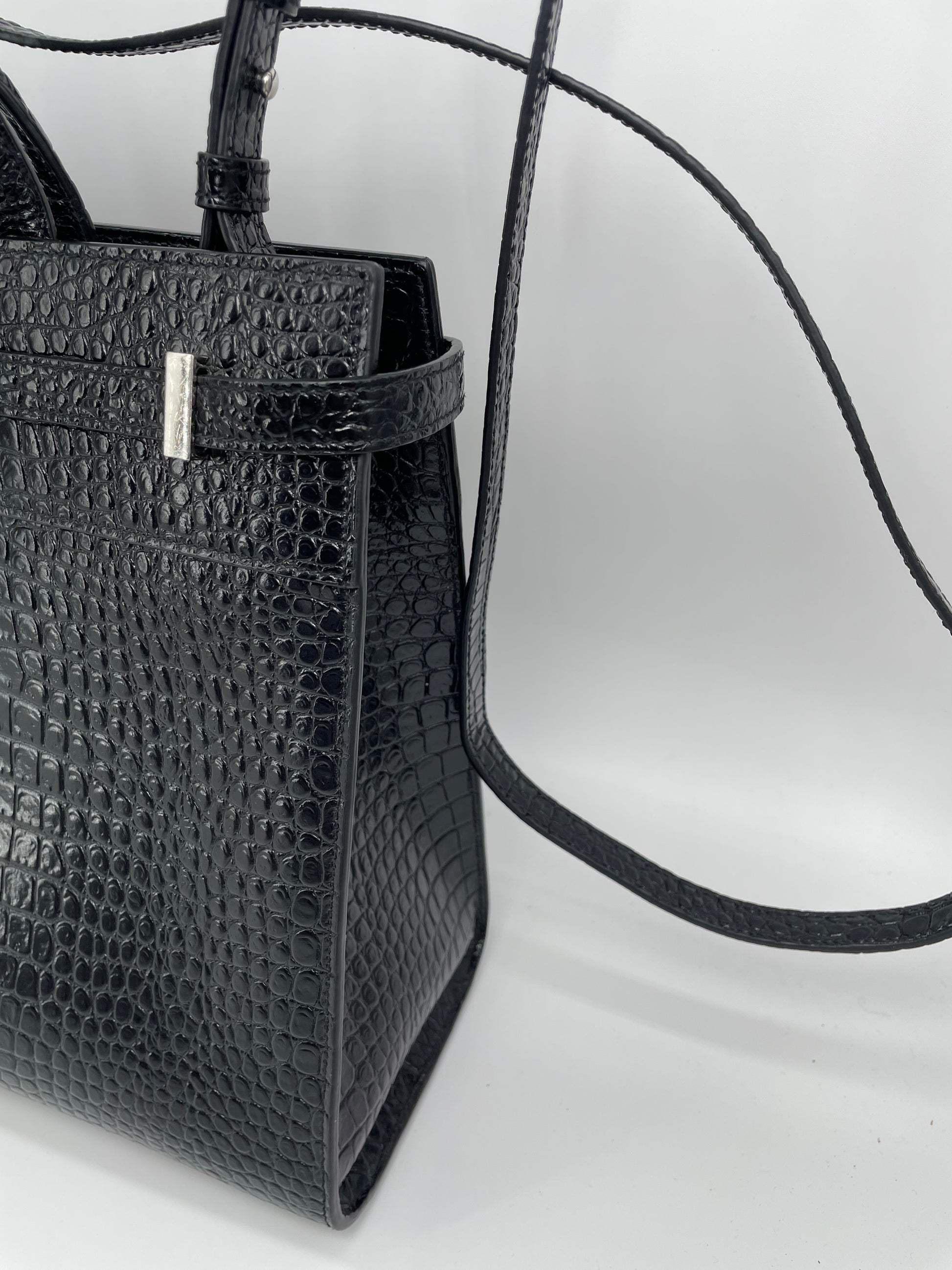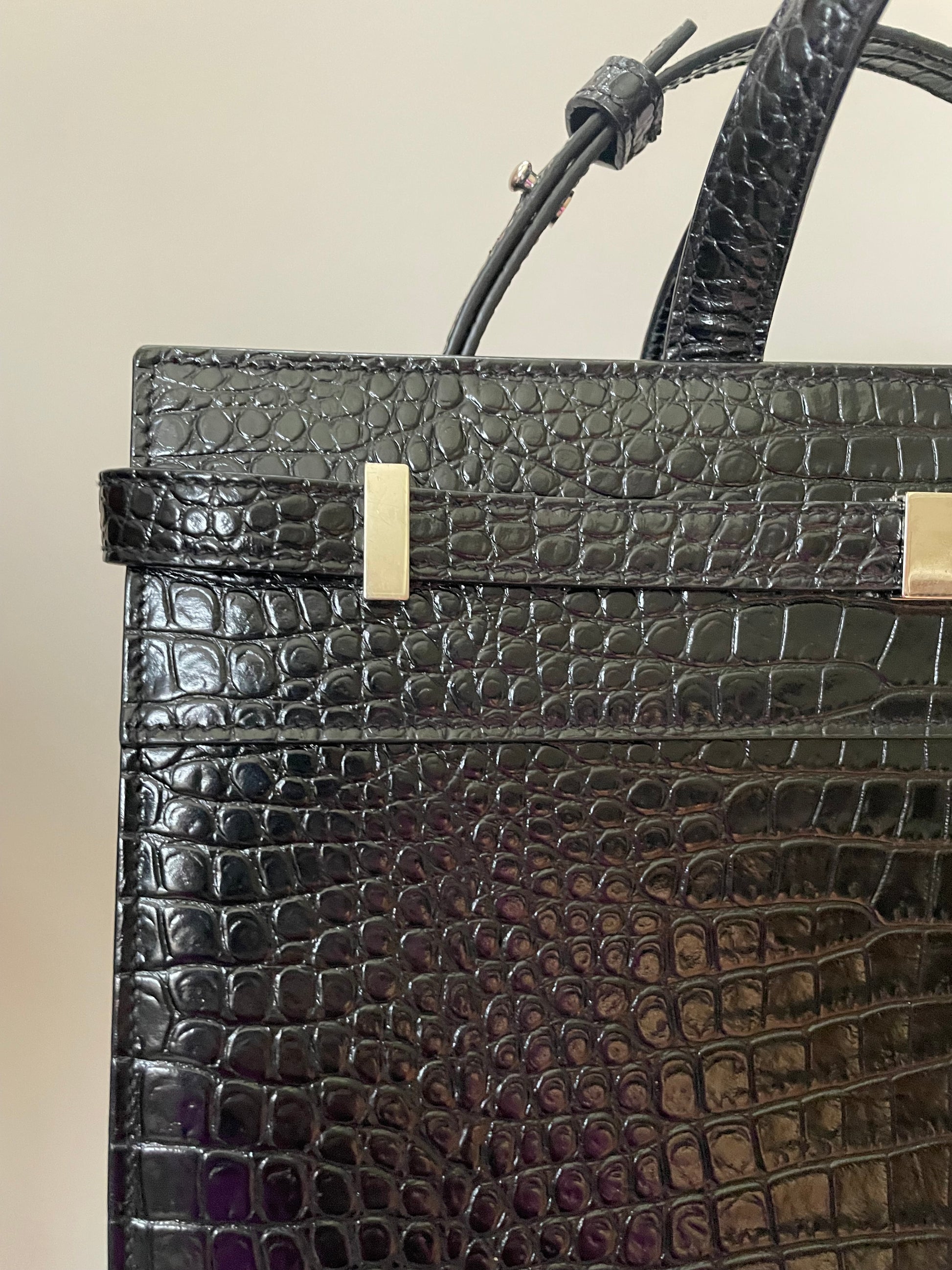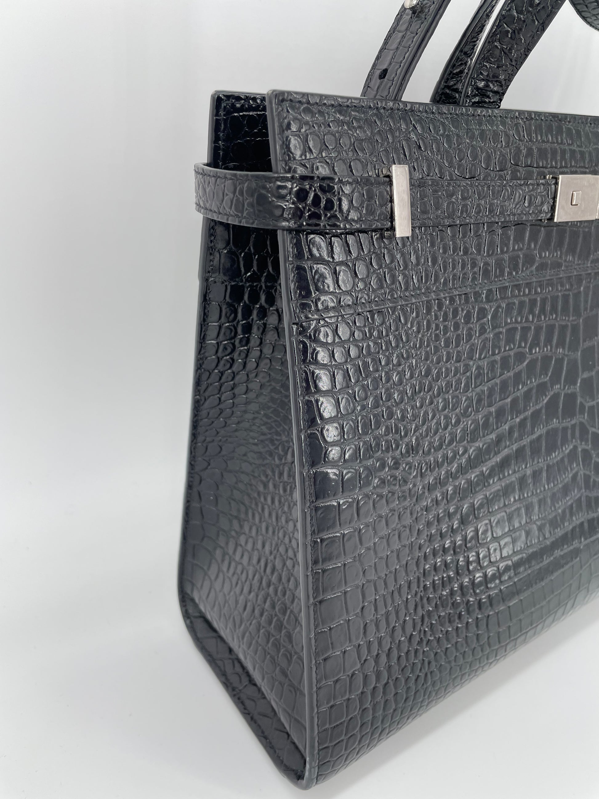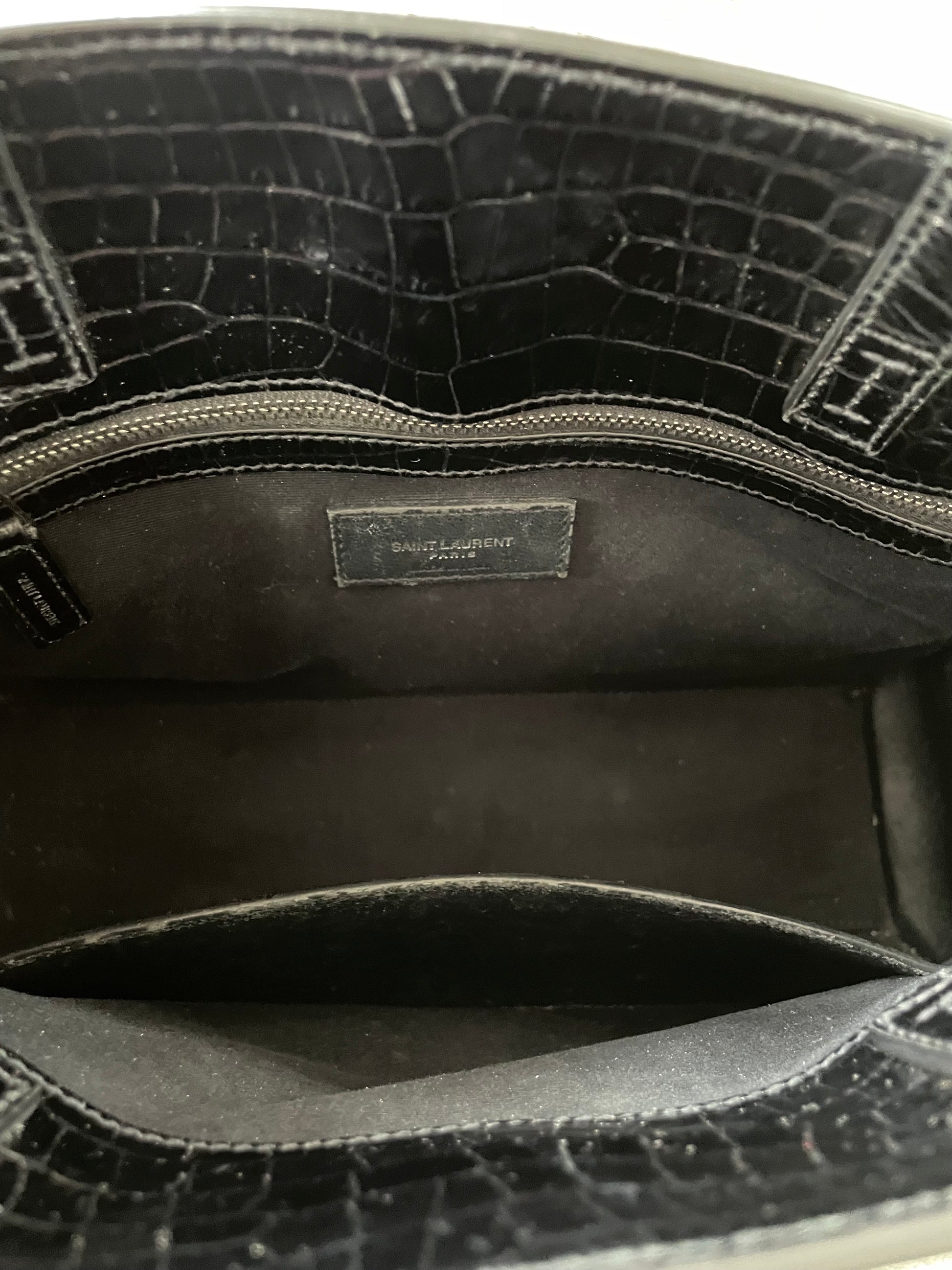 This is a stunning Saint Laurent Manhattan tote bag in sleek, textured, Moc Croc black leather and silvertone hardware. The brand is known for creating modern and edgy designs and this sleek and structured Manhattan Tote is perfect for the sophisticated woman. The combination of top handles and a detachable long strap allows the bag to be truly versatile. This bag has plenty of space for your daily essentials, whilst the zip close internal pocket allows you to keep your belongings secure. It's a structured piece so creates a polished finish to any look.