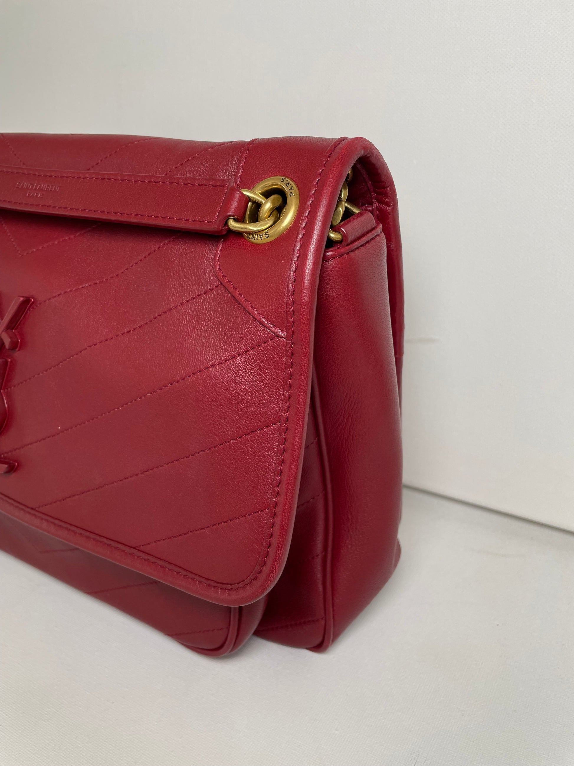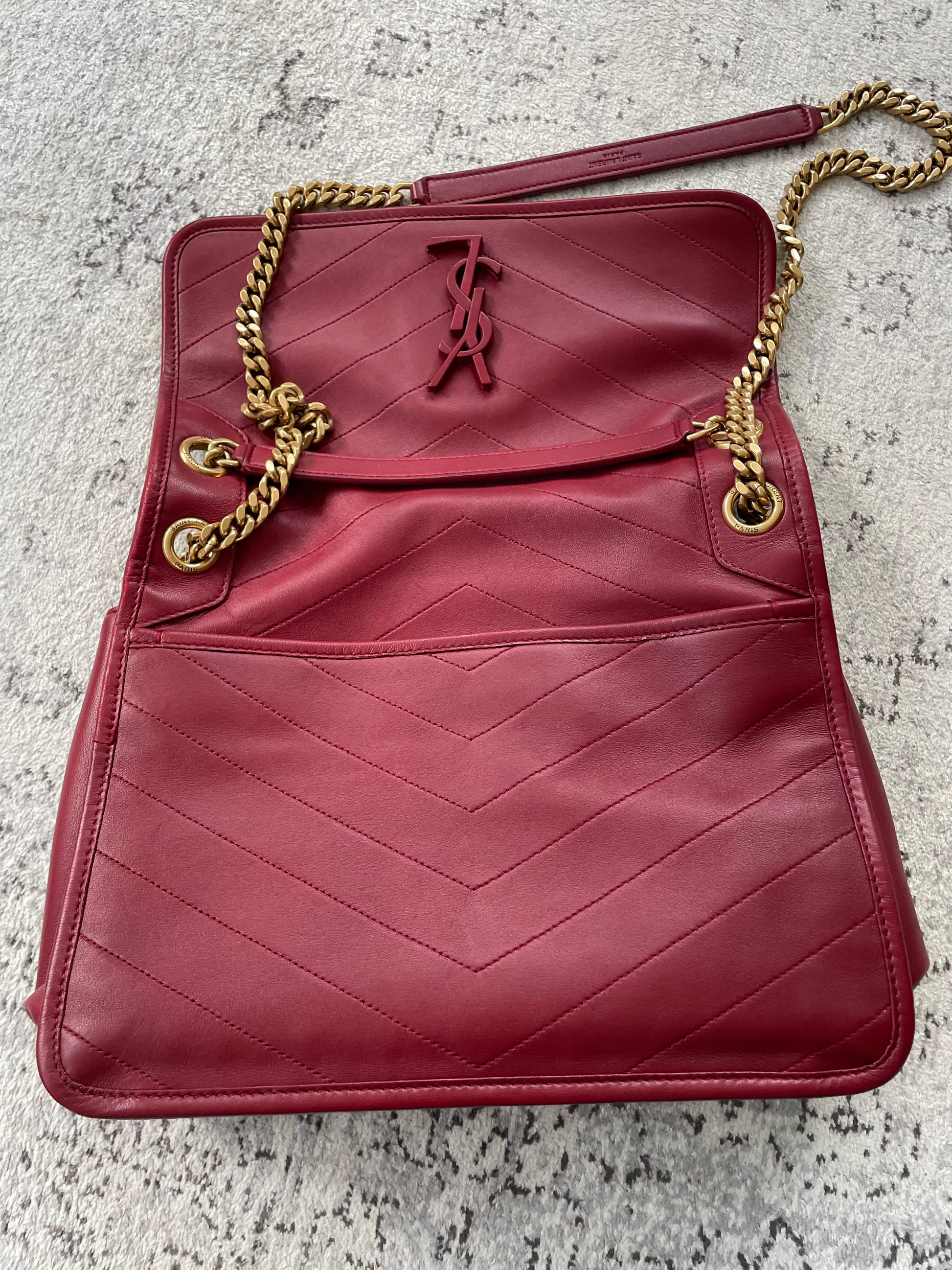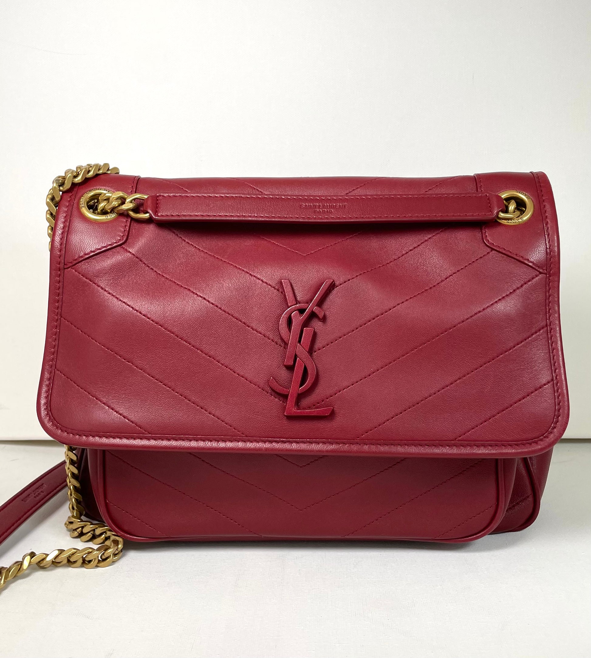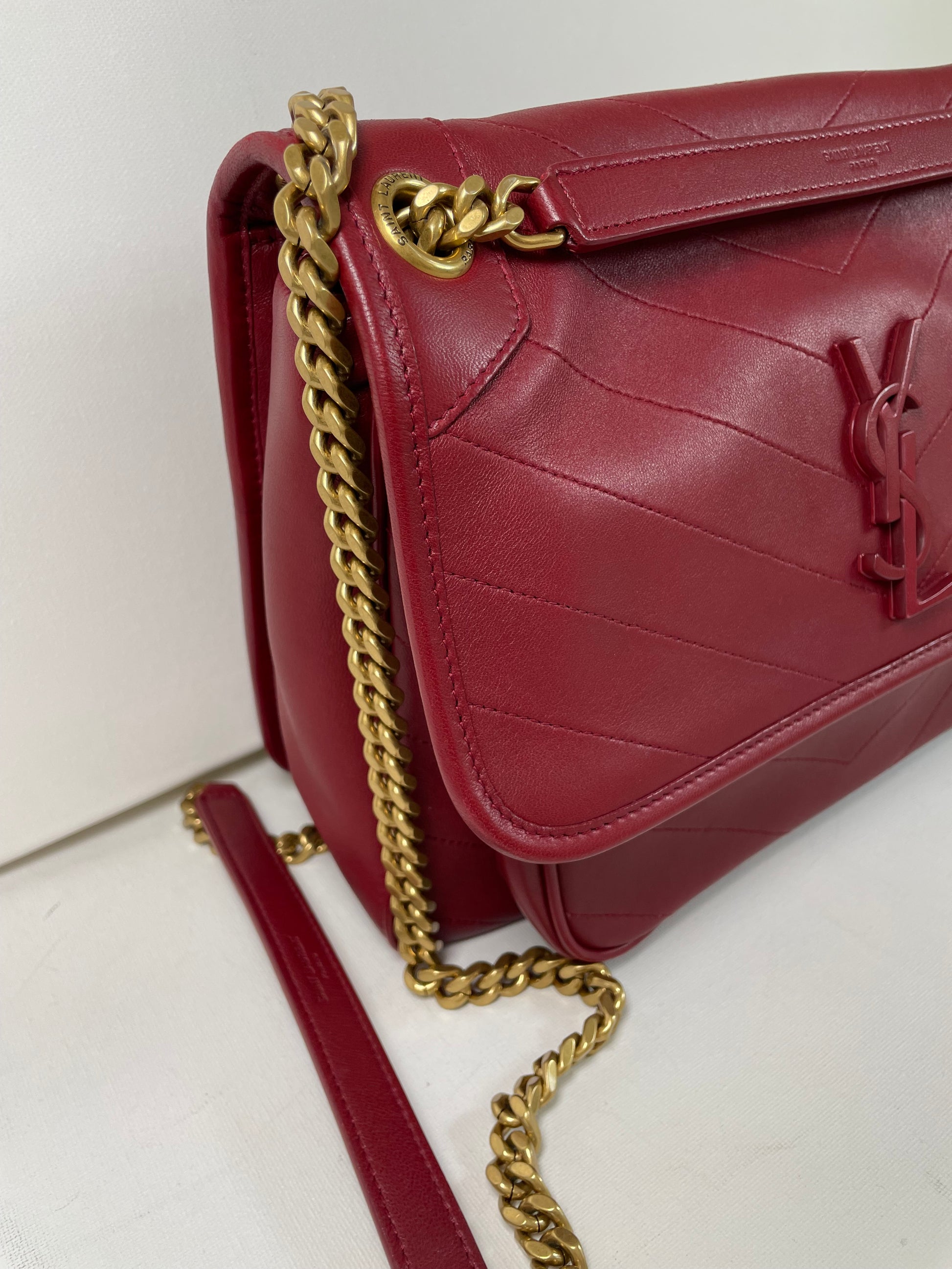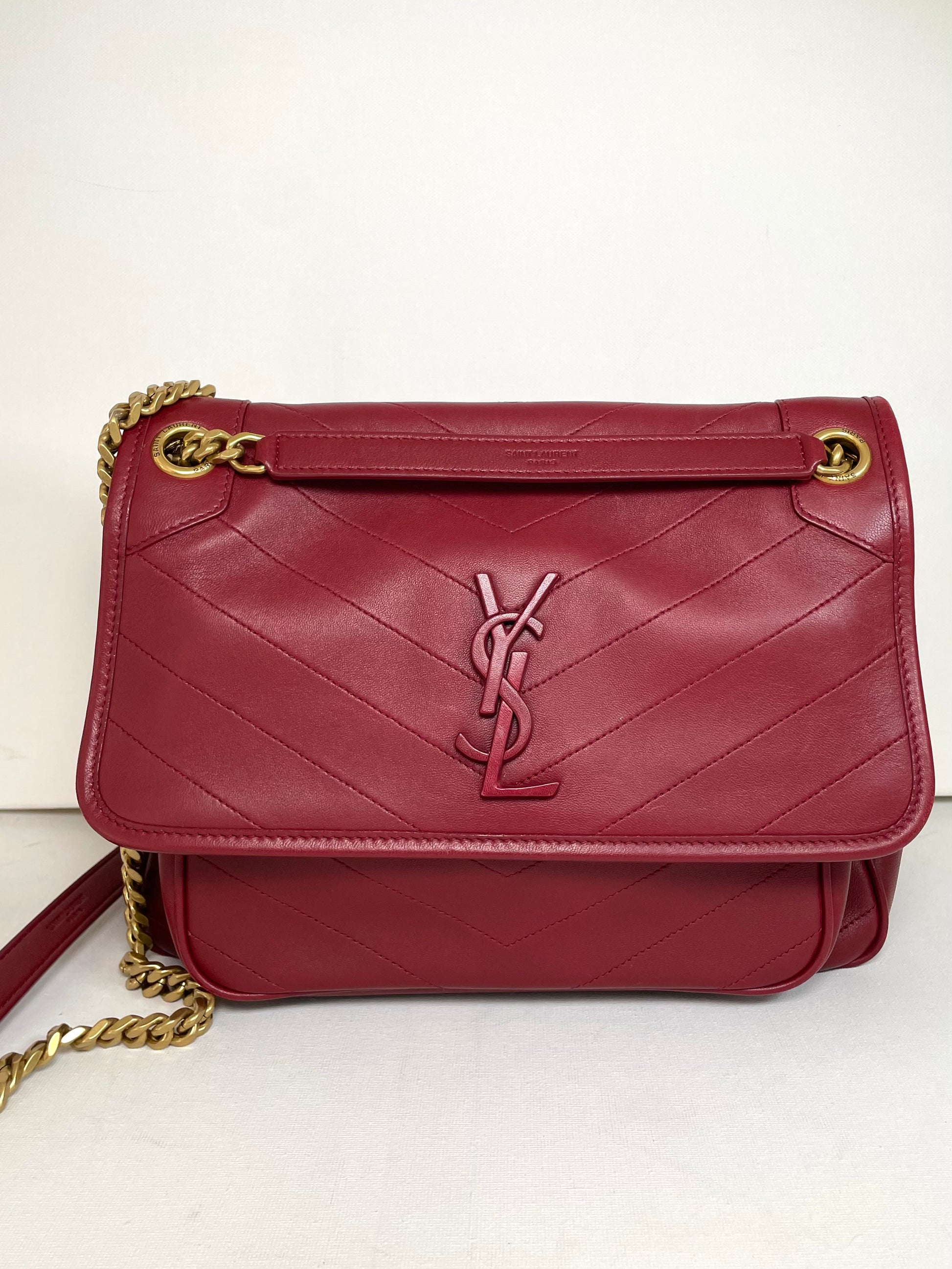 This is a stunning Medium Saint Laurent Quilted deep, red Leather Niki bag . It features super soft leather in a deep red and can be worn on the shoulder or crossbody. The iconic initials in raised coated metal sit in the centre on the front. The warm goldtone chain strap can be carried long or doubled to sit on the shoulder. The interior is large enough to fit all your essentials. Under the opening flap Is a small open pocket and behind that is the main compartment, a large zip pocket to the back and a small slip pocket.