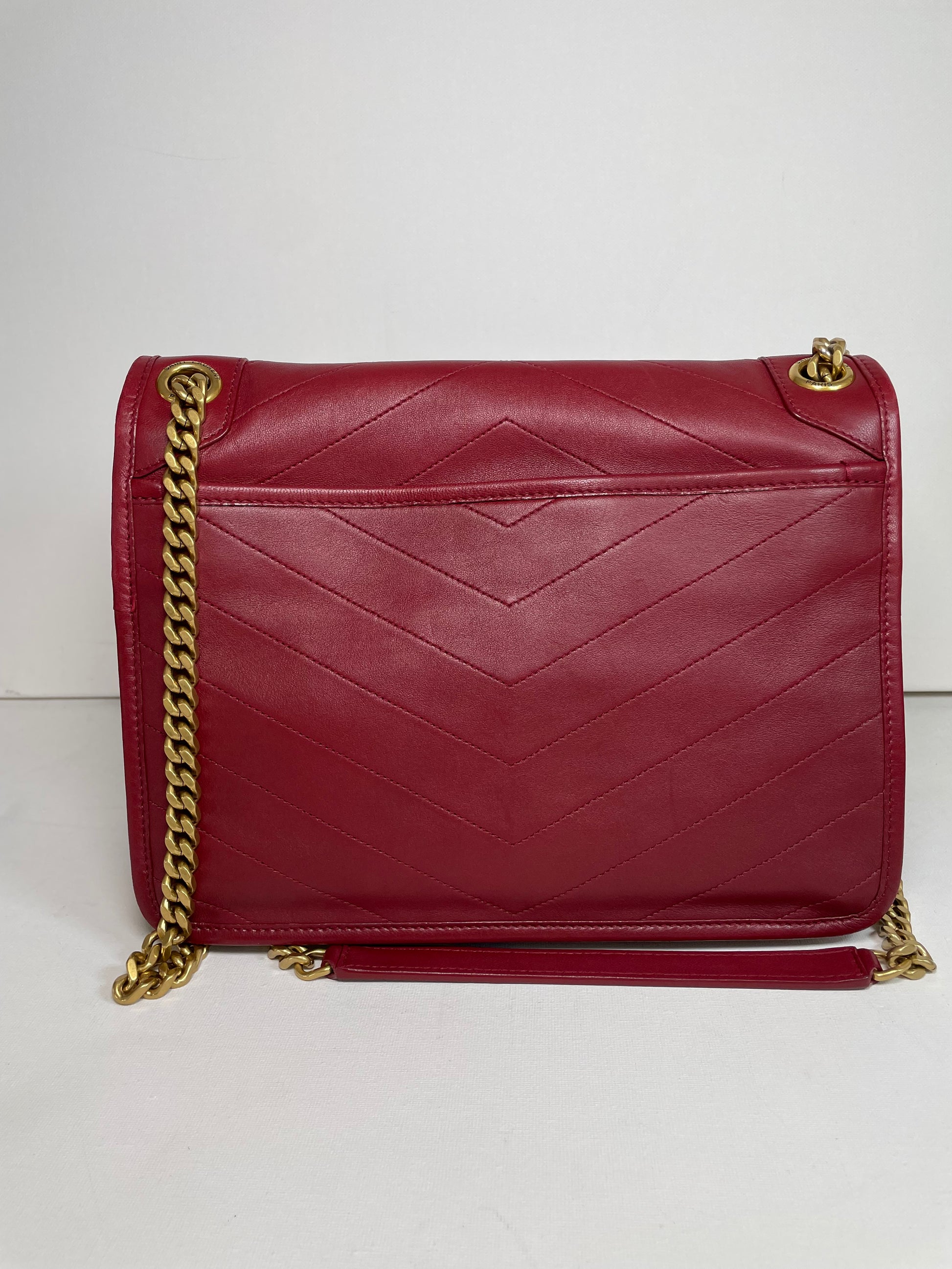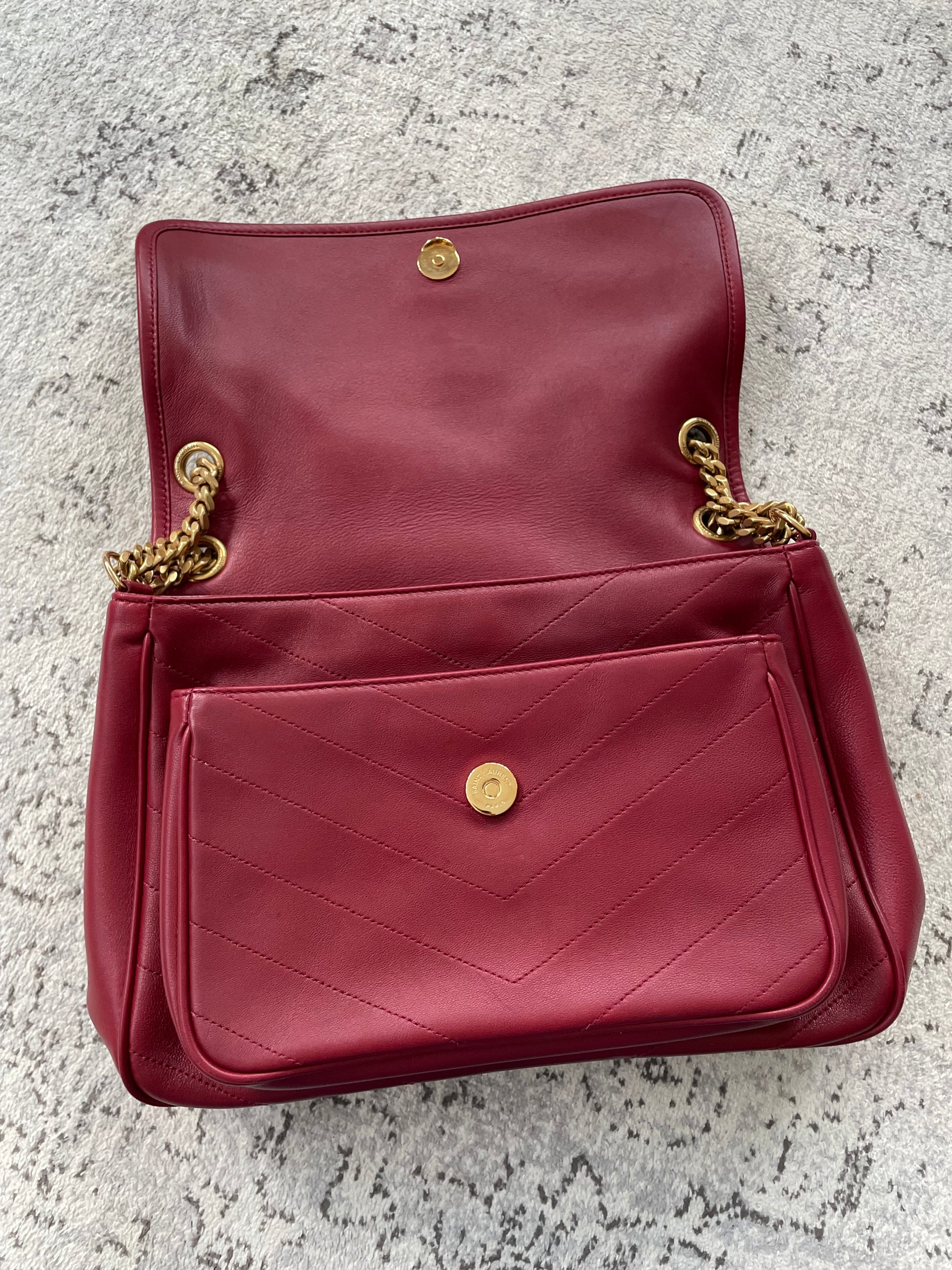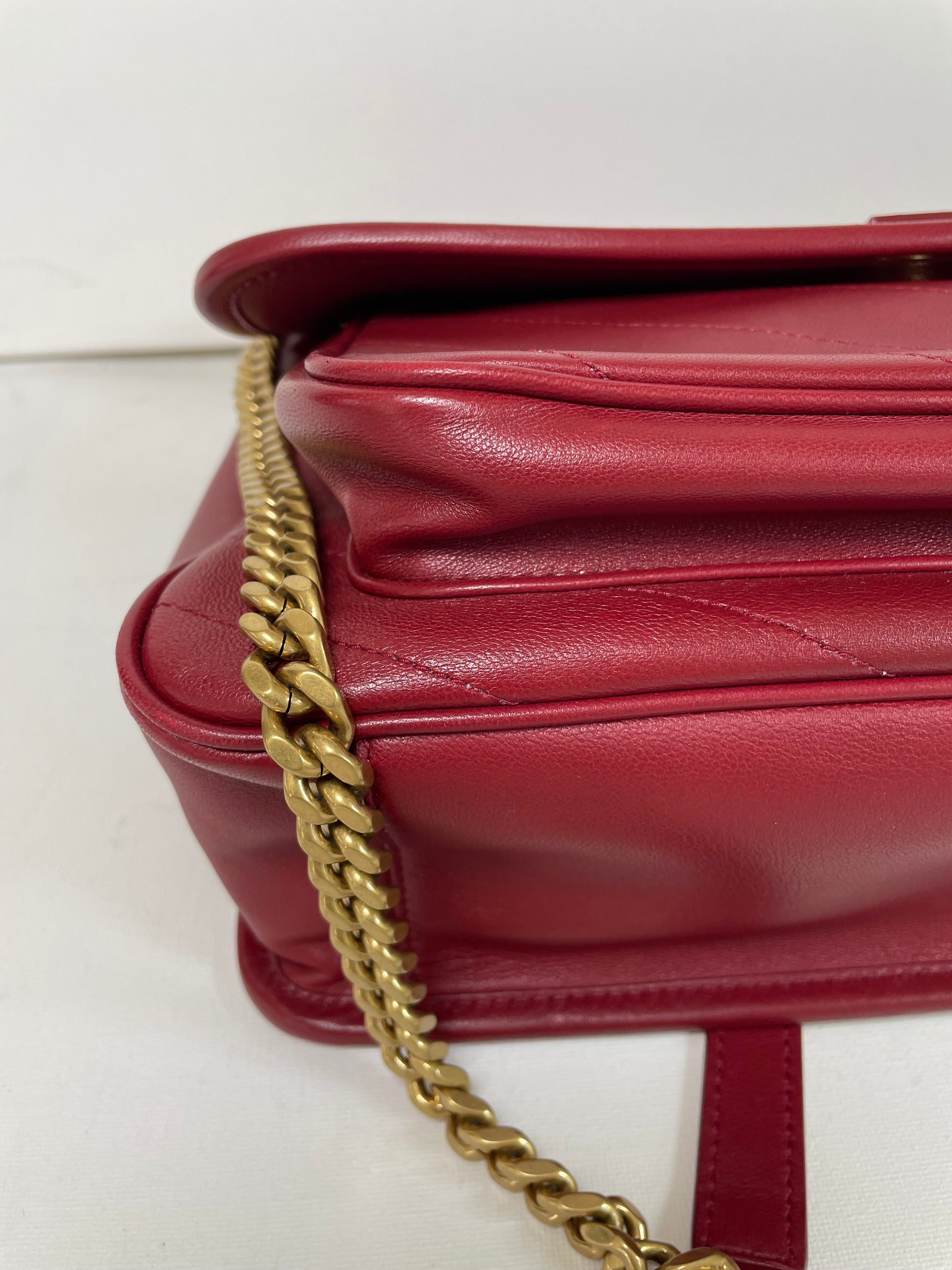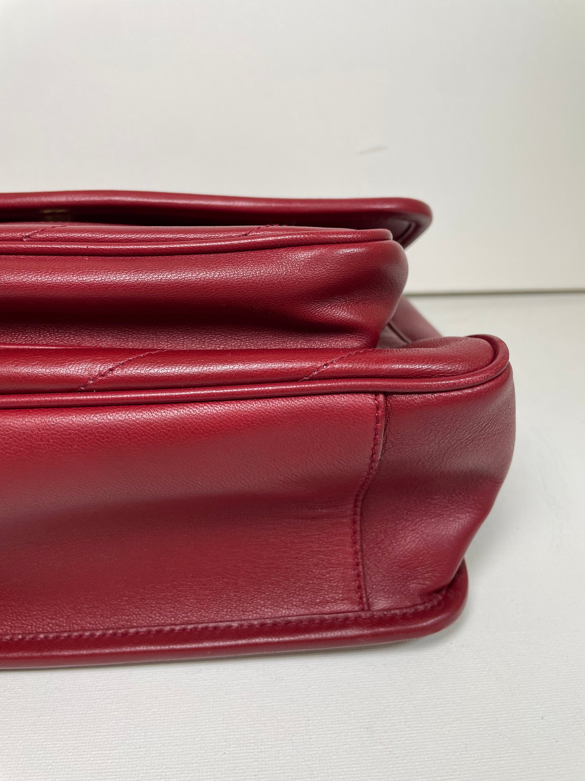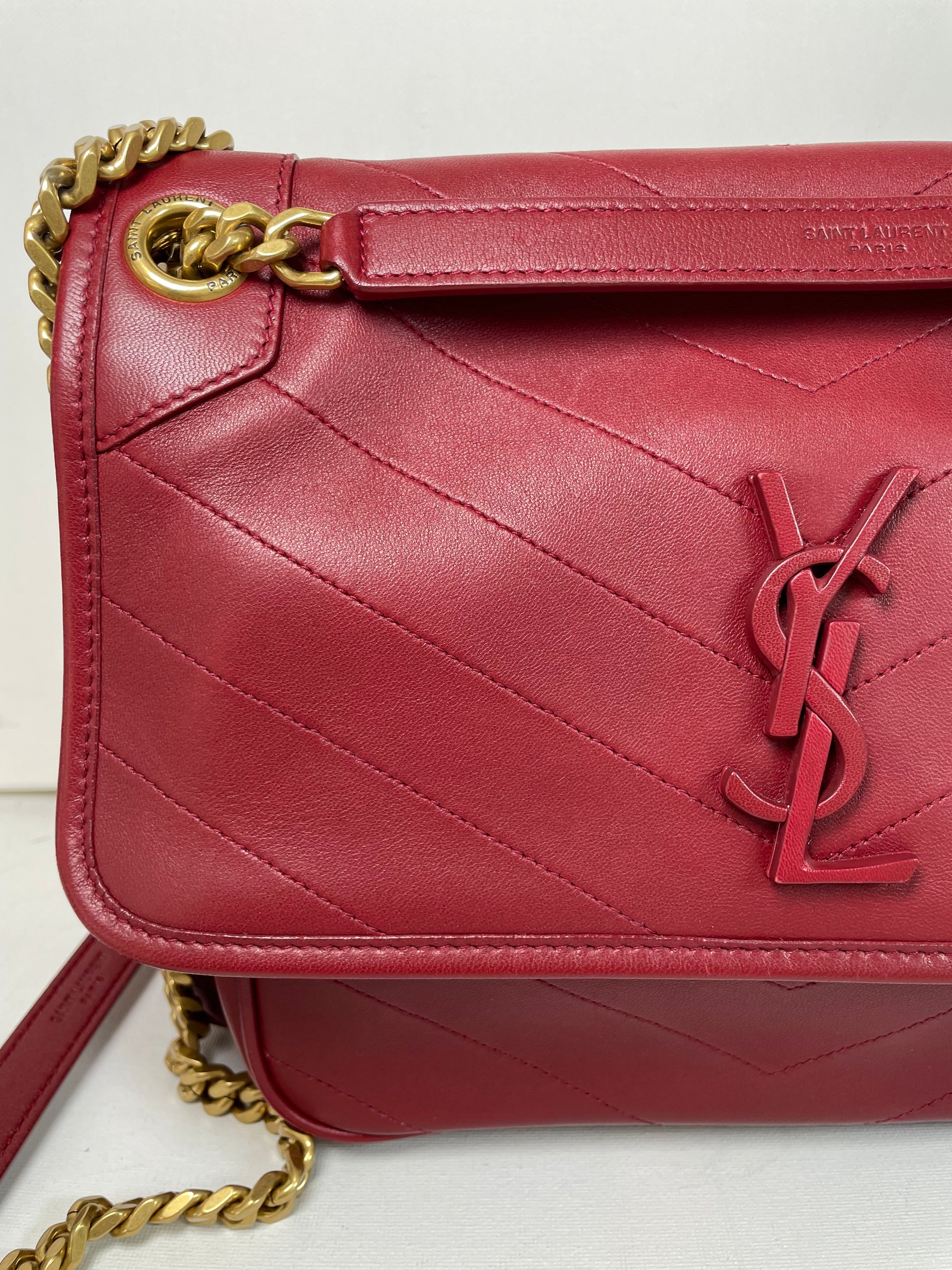 This is a stunning Medium Saint Laurent Quilted deep, red Leather Niki bag . It features super soft leather in a deep red and can be worn on the shoulder or crossbody. The iconic initials in raised coated metal sit in the centre on the front. The warm goldtone chain strap can be carried long or doubled to sit on the shoulder. The interior is large enough to fit all your essentials. Under the opening flap Is a small open pocket and behind that is the main compartment, a large zip pocket to the back and a small slip pocket.