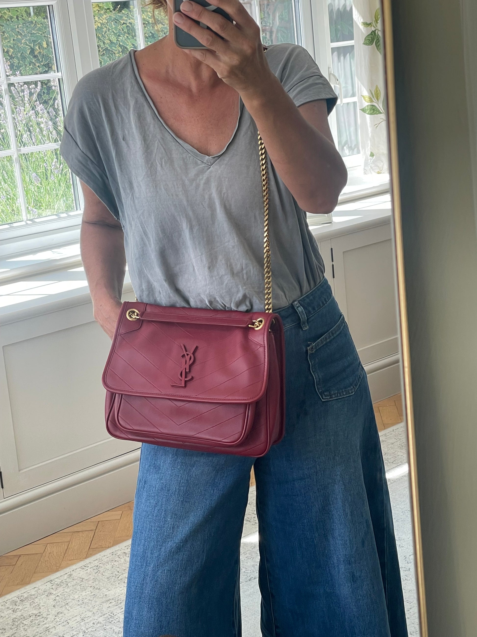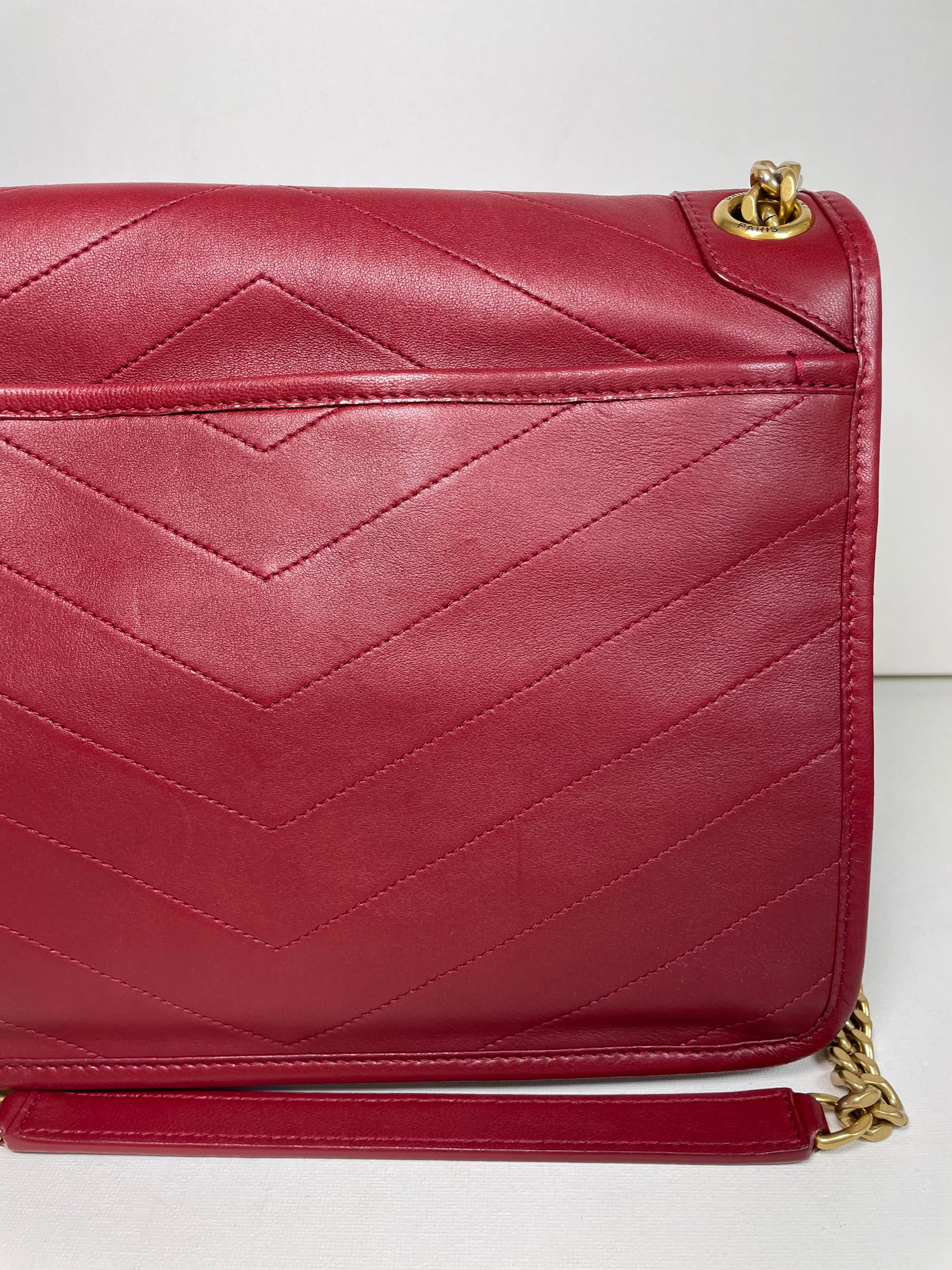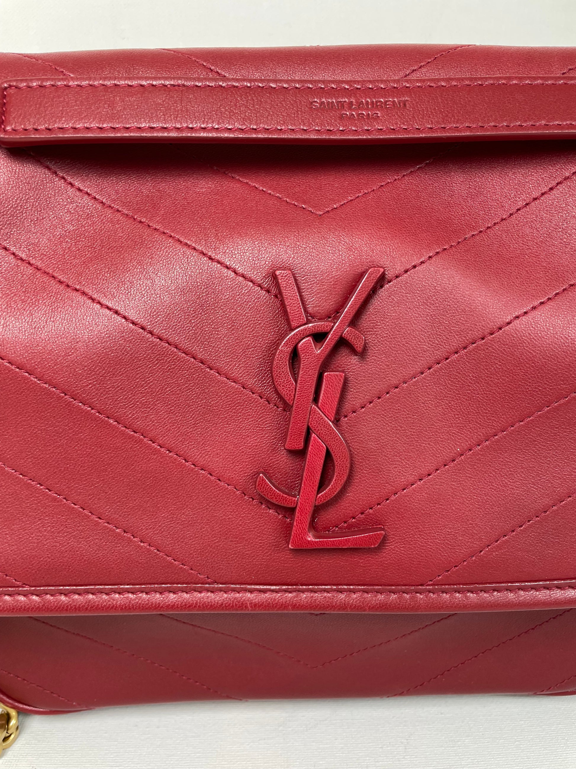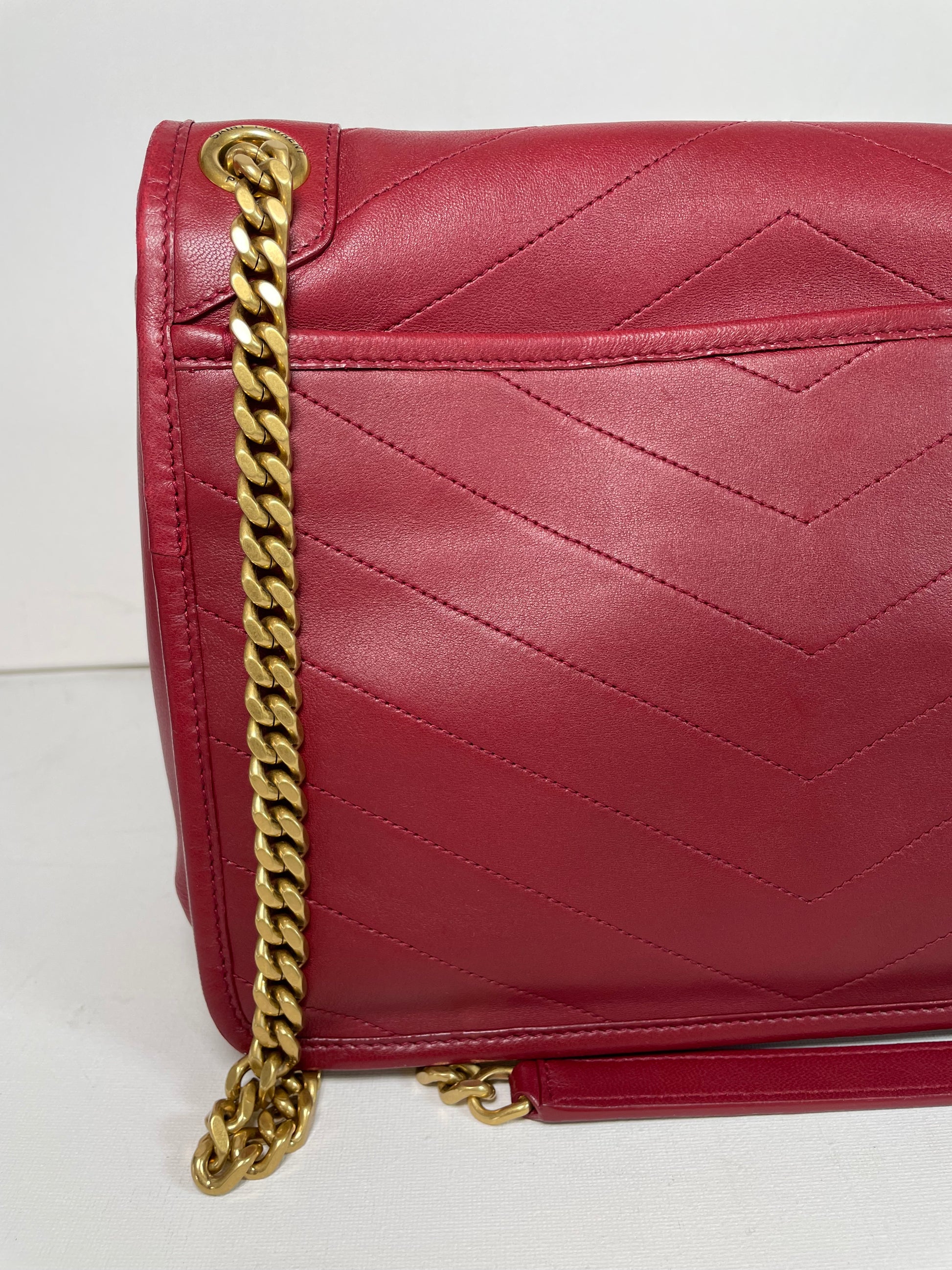 This is a stunning Medium Saint Laurent Quilted deep, red Leather Niki bag . It features super soft leather in a deep red and can be worn on the shoulder or crossbody. The iconic initials in raised coated metal sit in the centre on the front. The warm goldtone chain strap can be carried long or doubled to sit on the shoulder. The interior is large enough to fit all your essentials. Under the opening flap Is a small open pocket and behind that is the main compartment, a large zip pocket to the back and a small slip pocket.