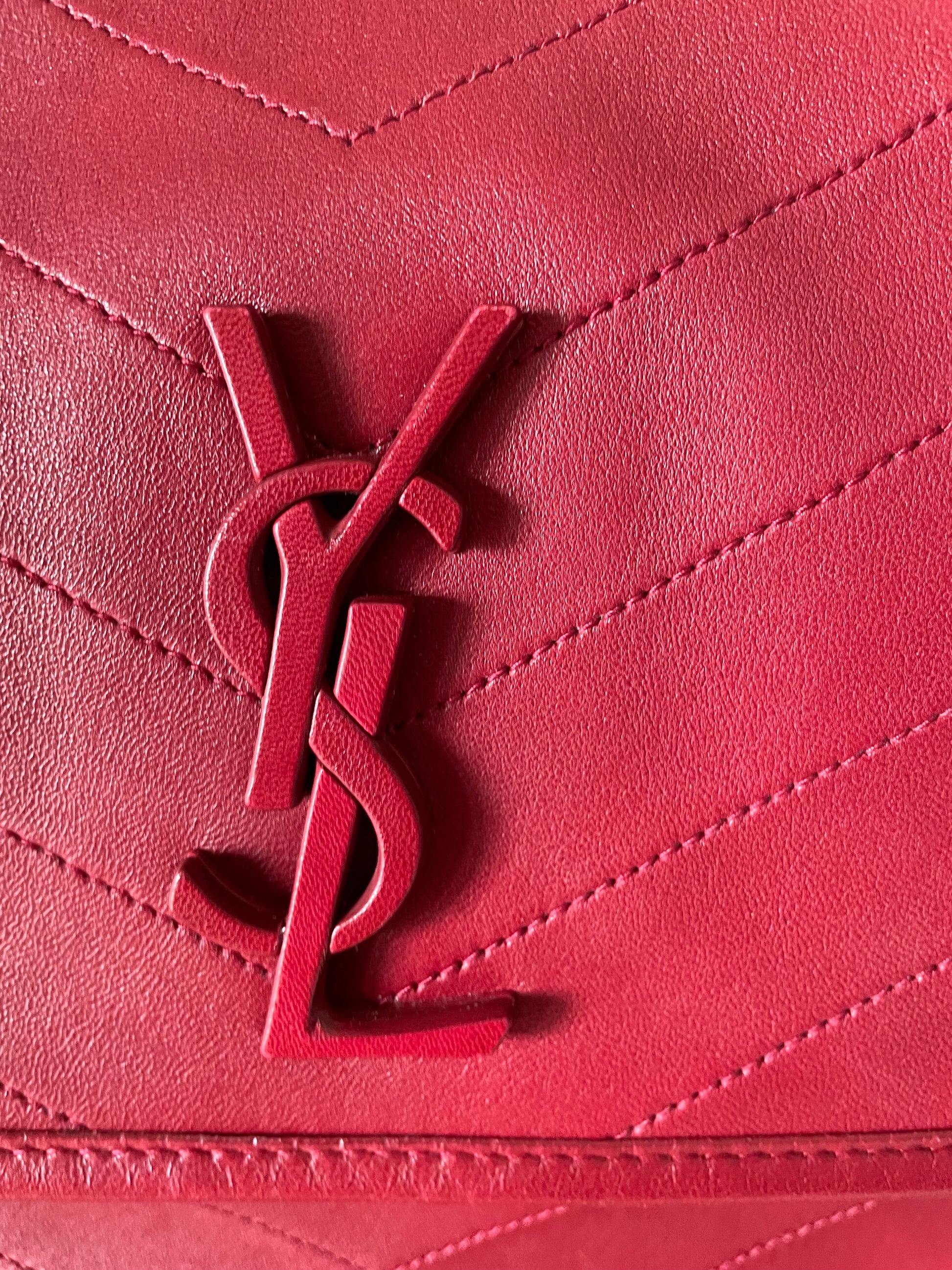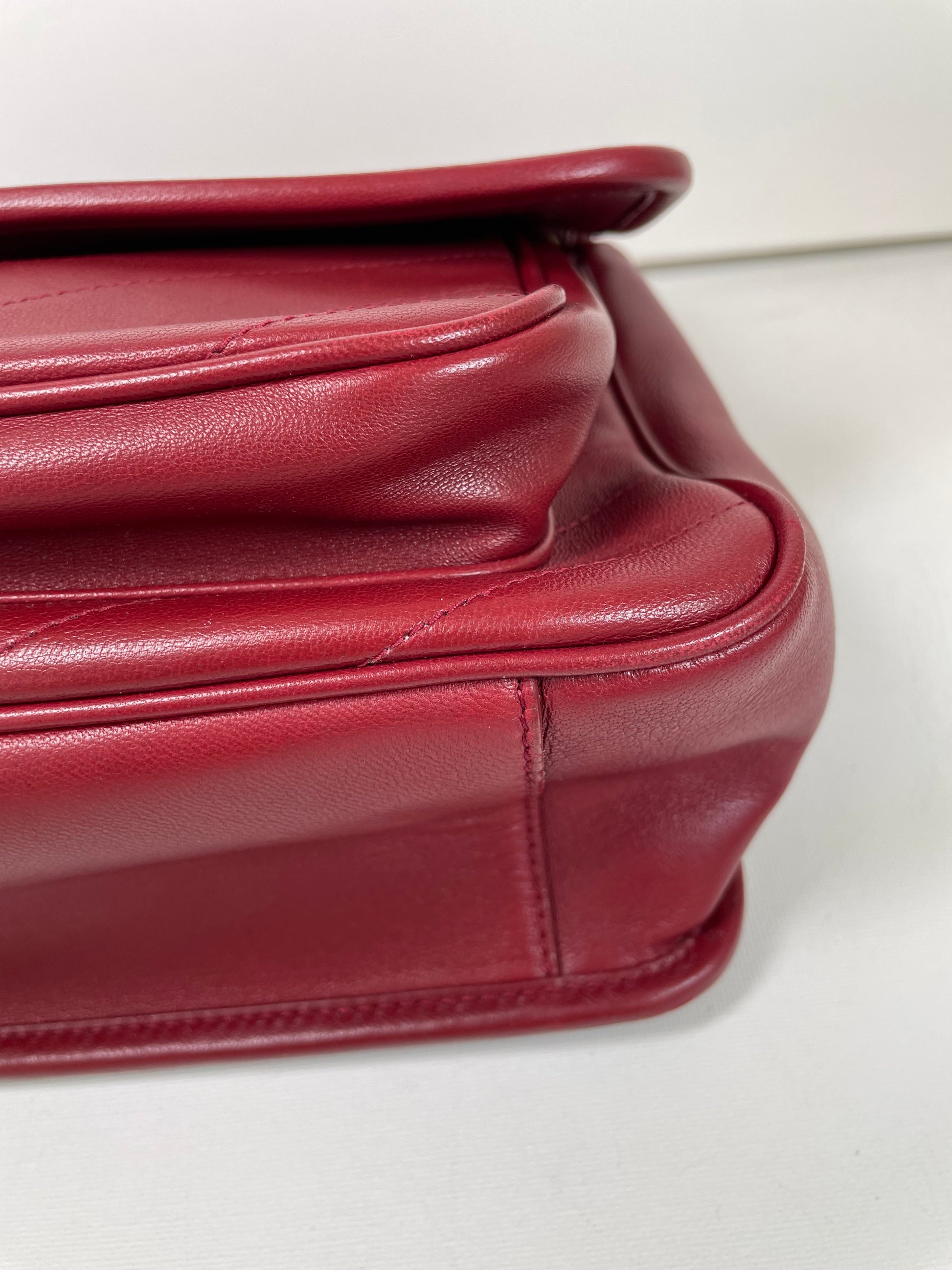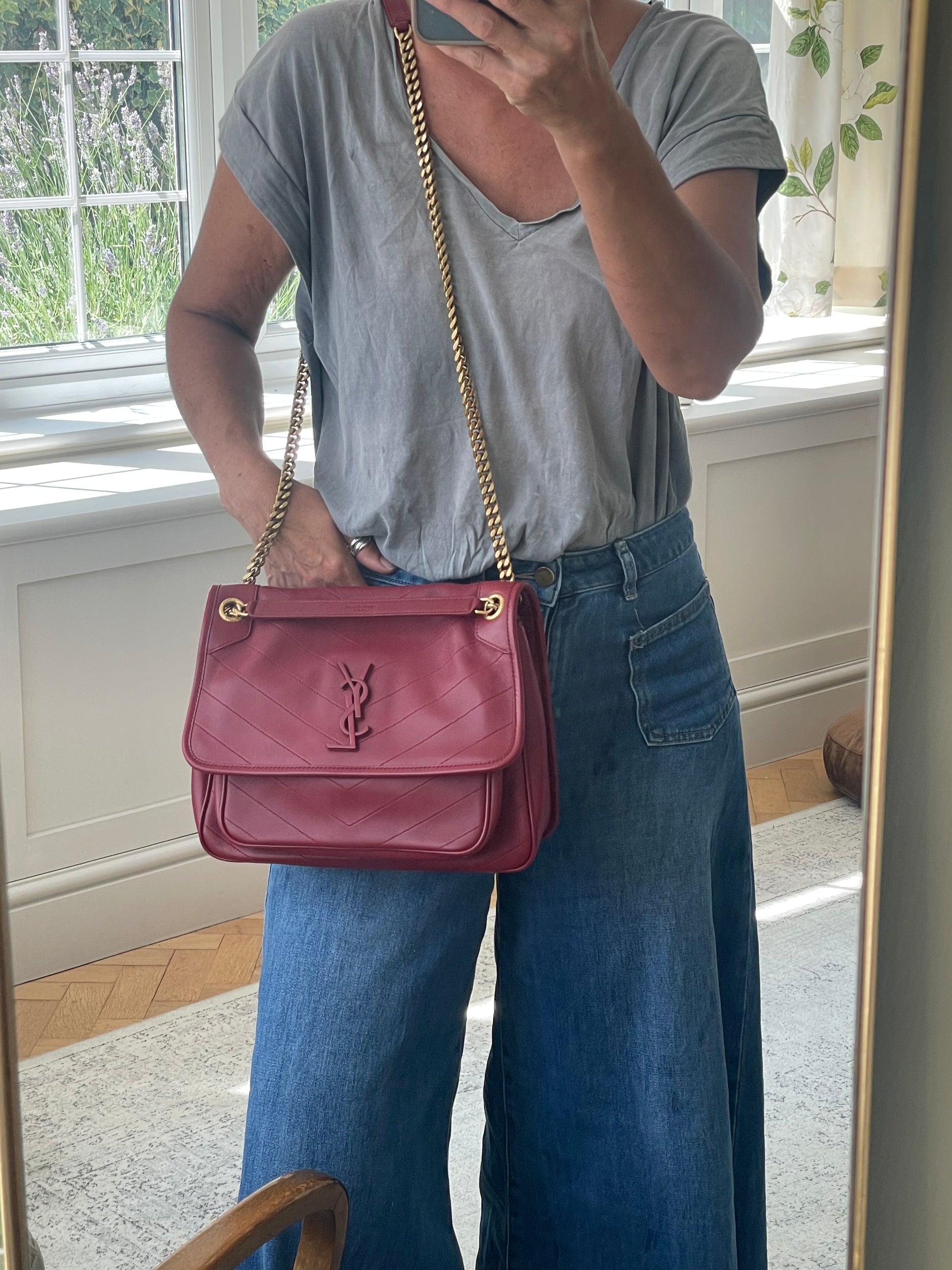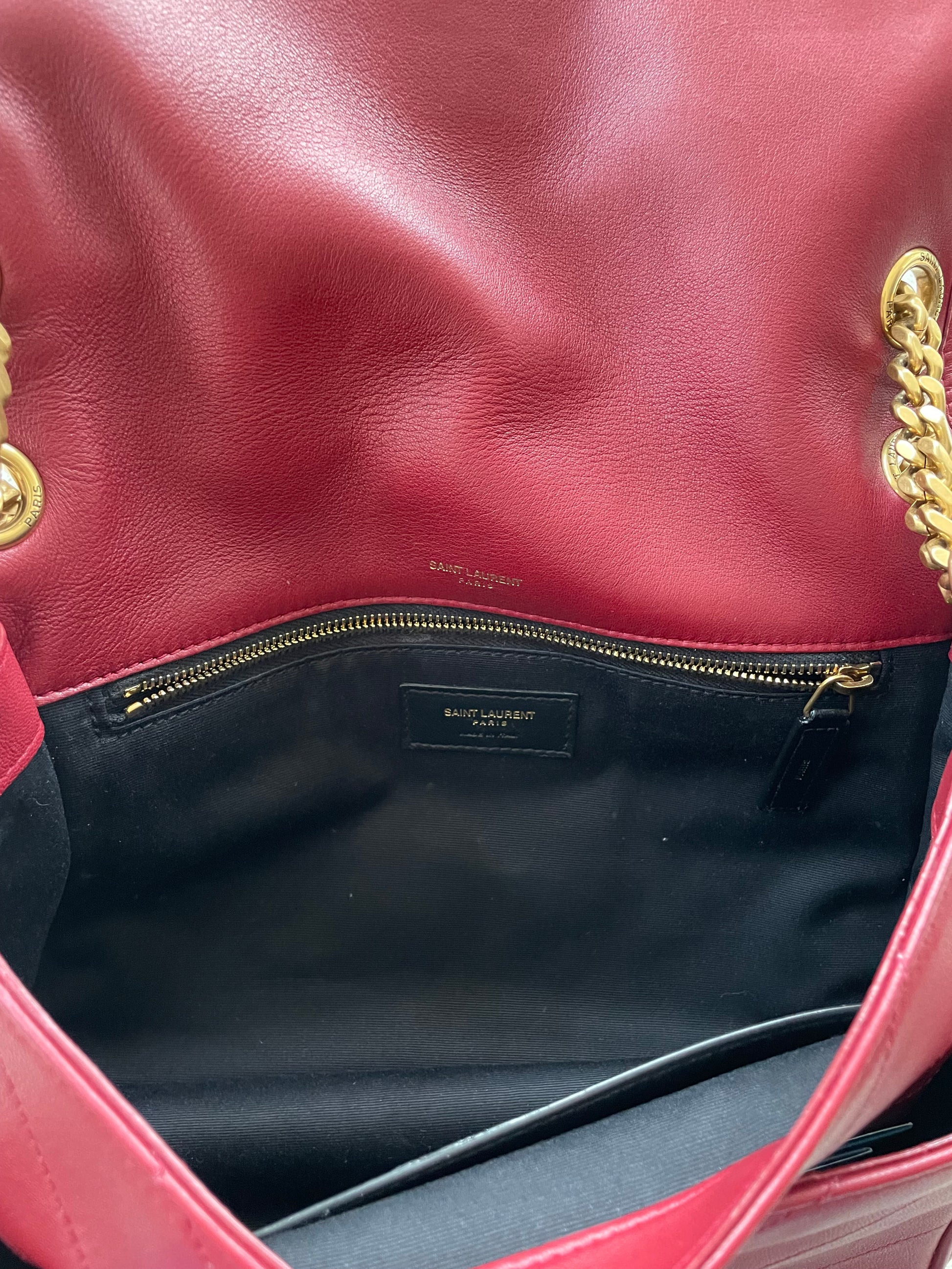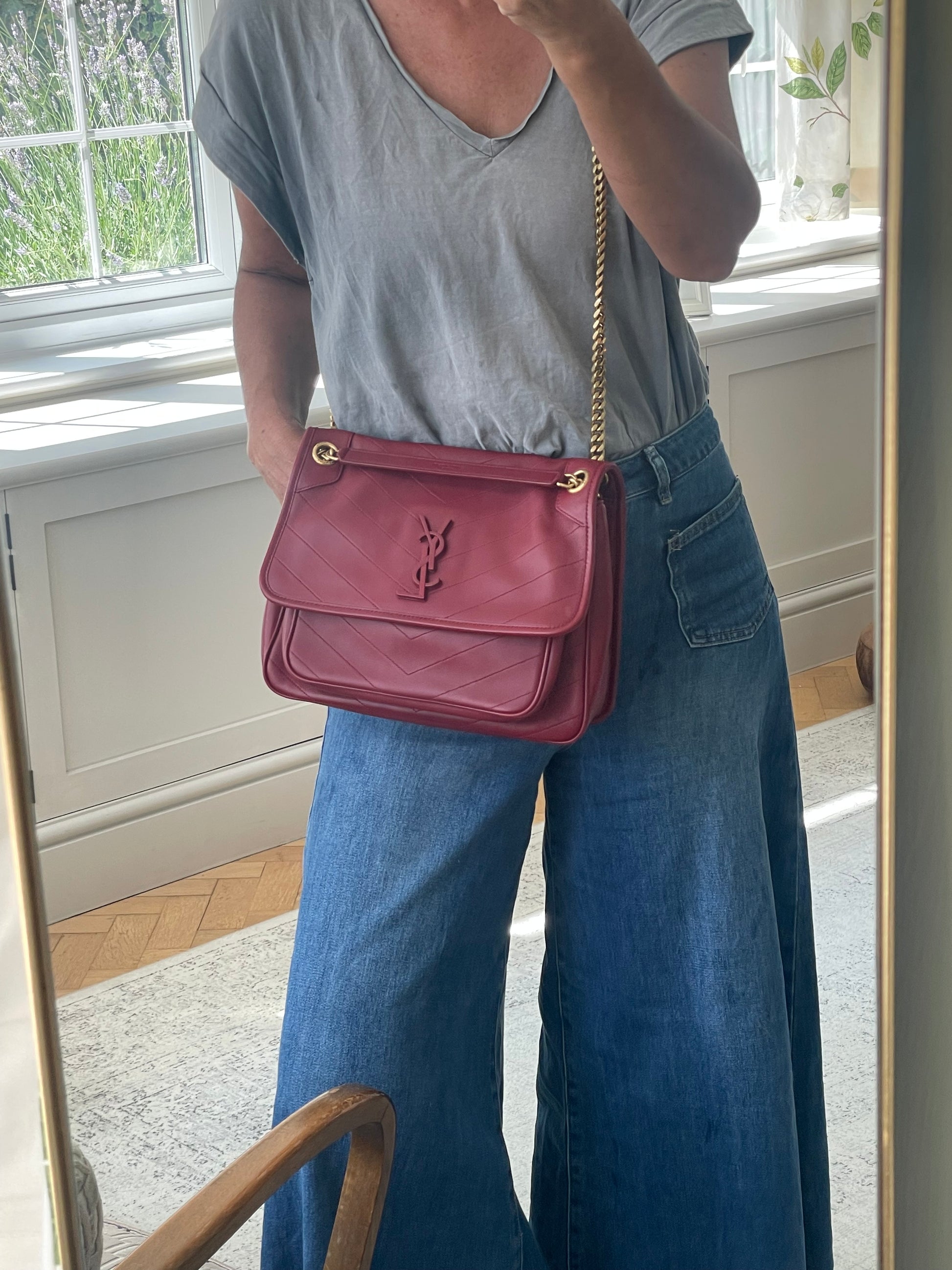This is a stunning Medium Saint Laurent Quilted deep, red Leather Niki bag . It features super soft leather in a deep red and can be worn on the shoulder or crossbody. The iconic initials in raised coated metal sit in the centre on the front. The warm goldtone chain strap can be carried long or doubled to sit on the shoulder. The interior is large enough to fit all your essentials. Under the opening flap Is a small open pocket and behind that is the main compartment, a large zip pocket to the back and a small slip pocket.
