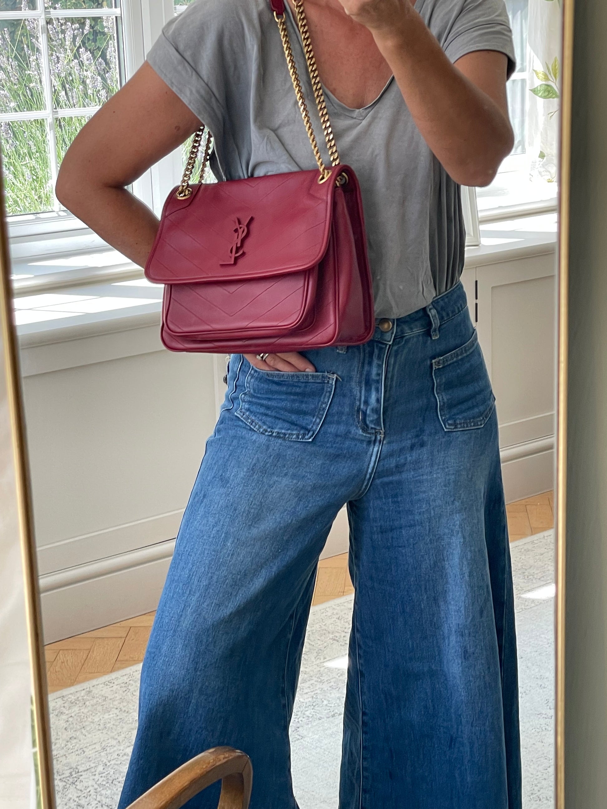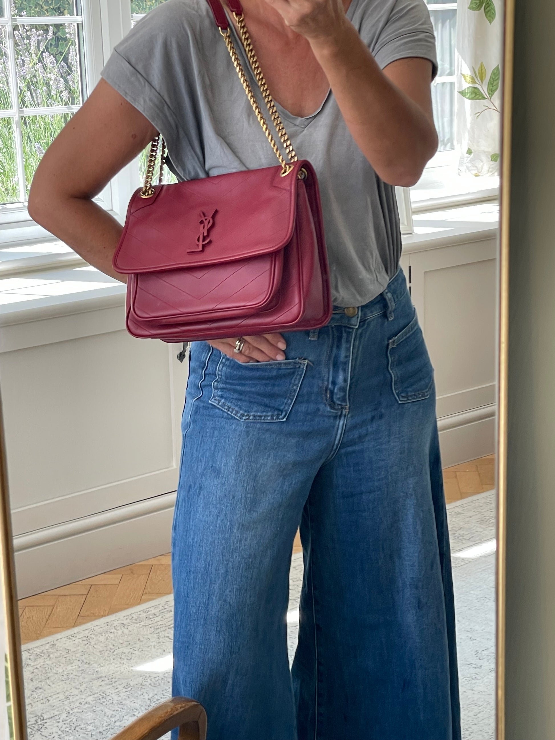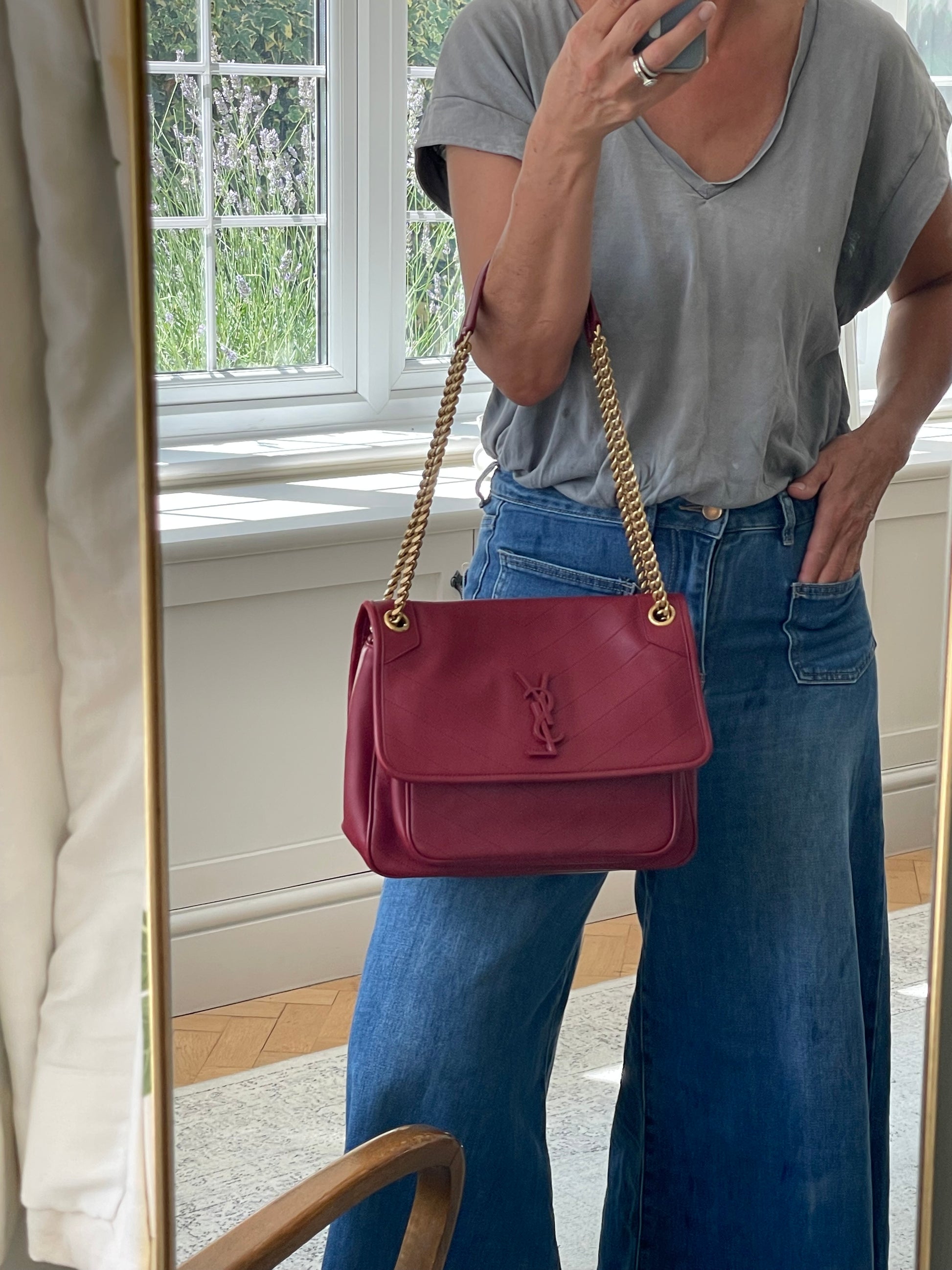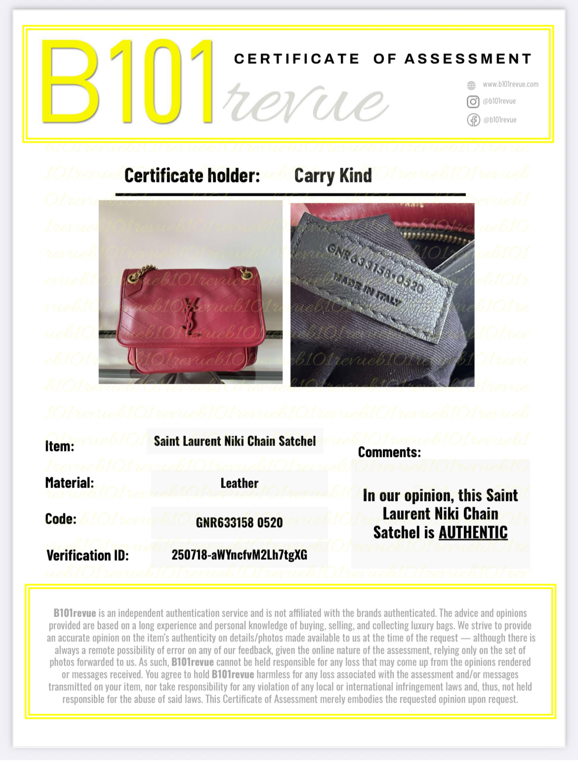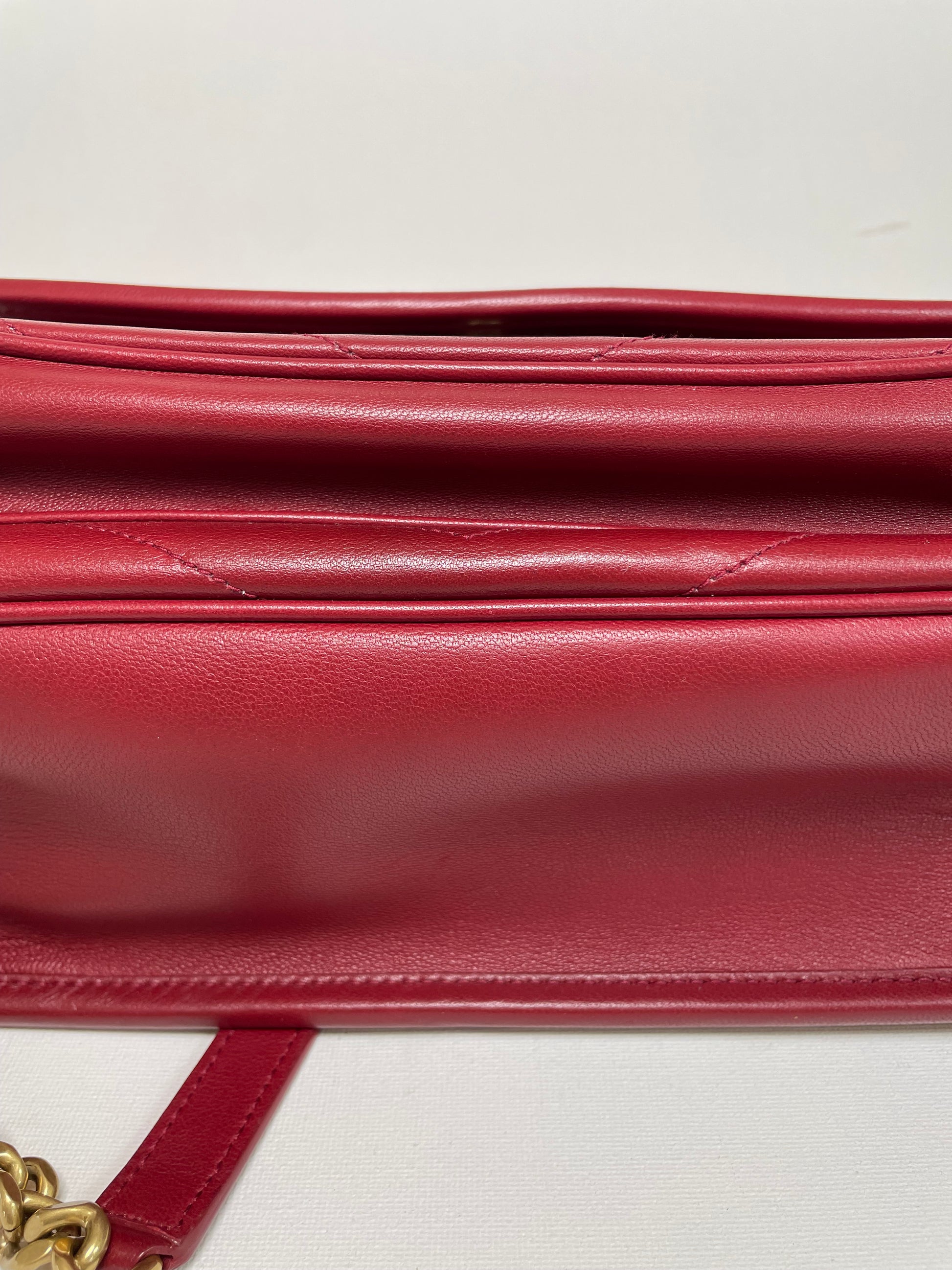 This is a stunning Medium Saint Laurent Quilted deep, red Leather Niki bag . It features super soft leather in a deep red and can be worn on the shoulder or crossbody. The iconic initials in raised coated metal sit in the centre on the front. The warm goldtone chain strap can be carried long or doubled to sit on the shoulder. The interior is large enough to fit all your essentials. Under the opening flap Is a small open pocket and behind that is the main compartment, a large zip pocket to the back and a small slip pocket.
