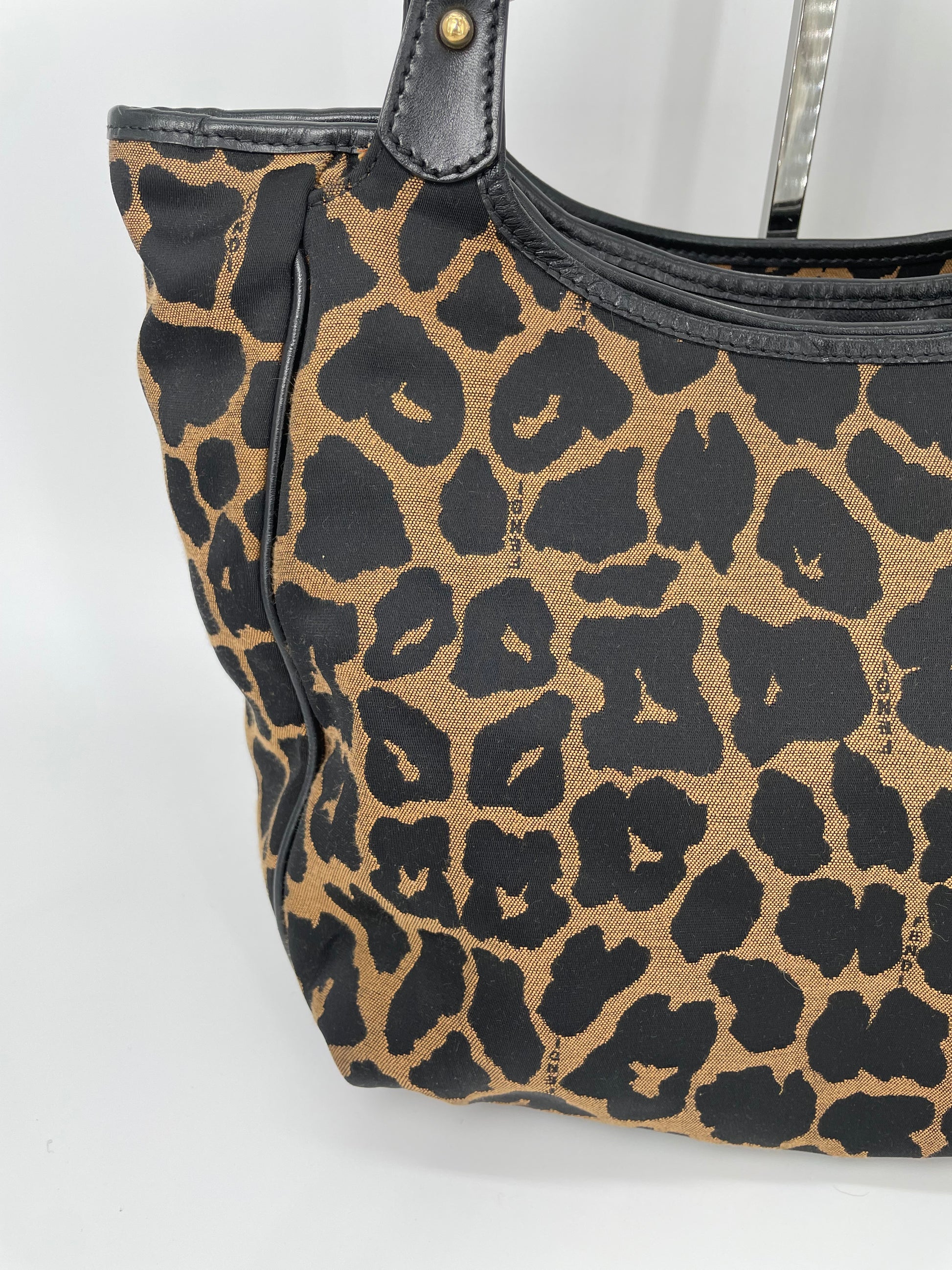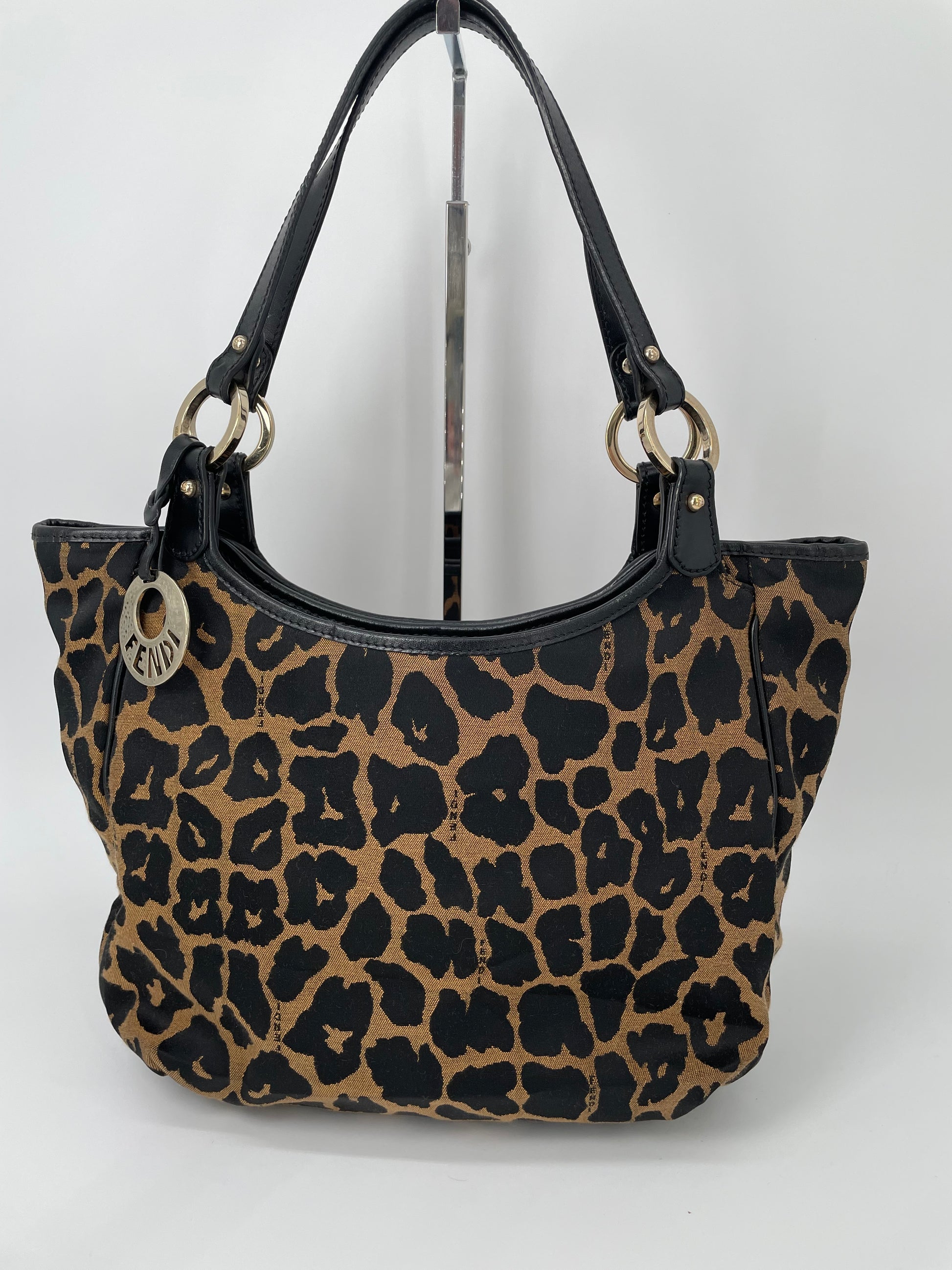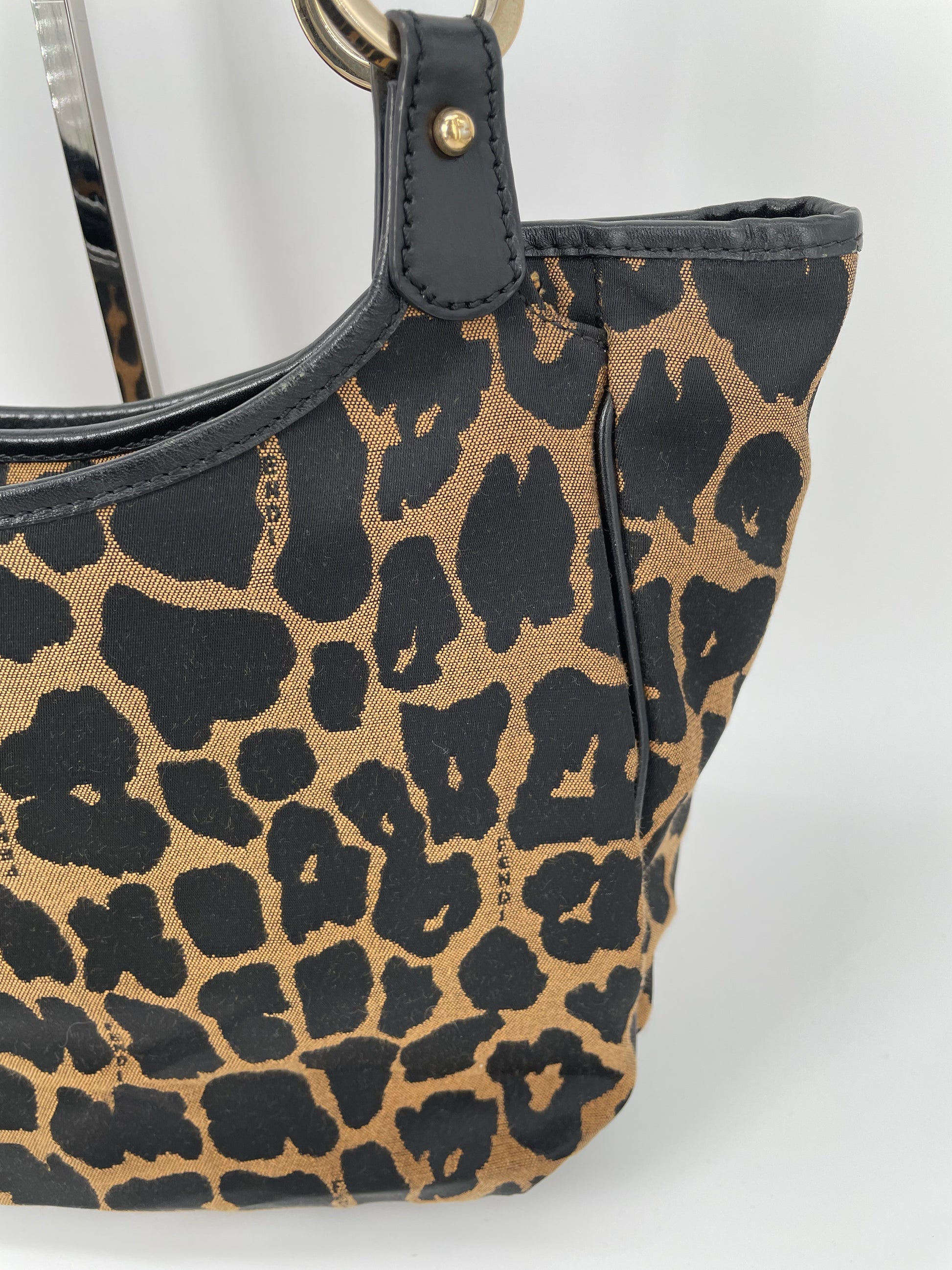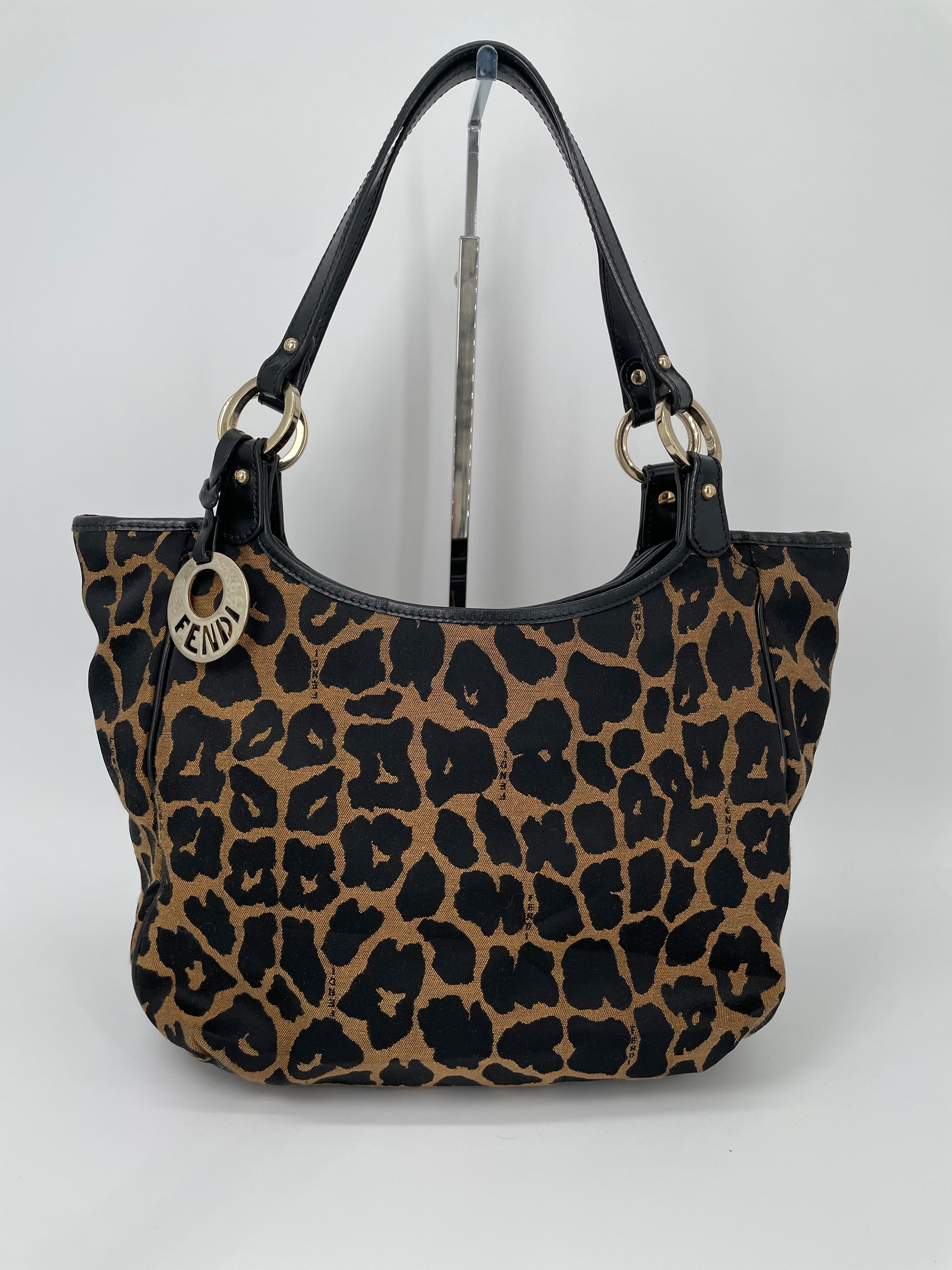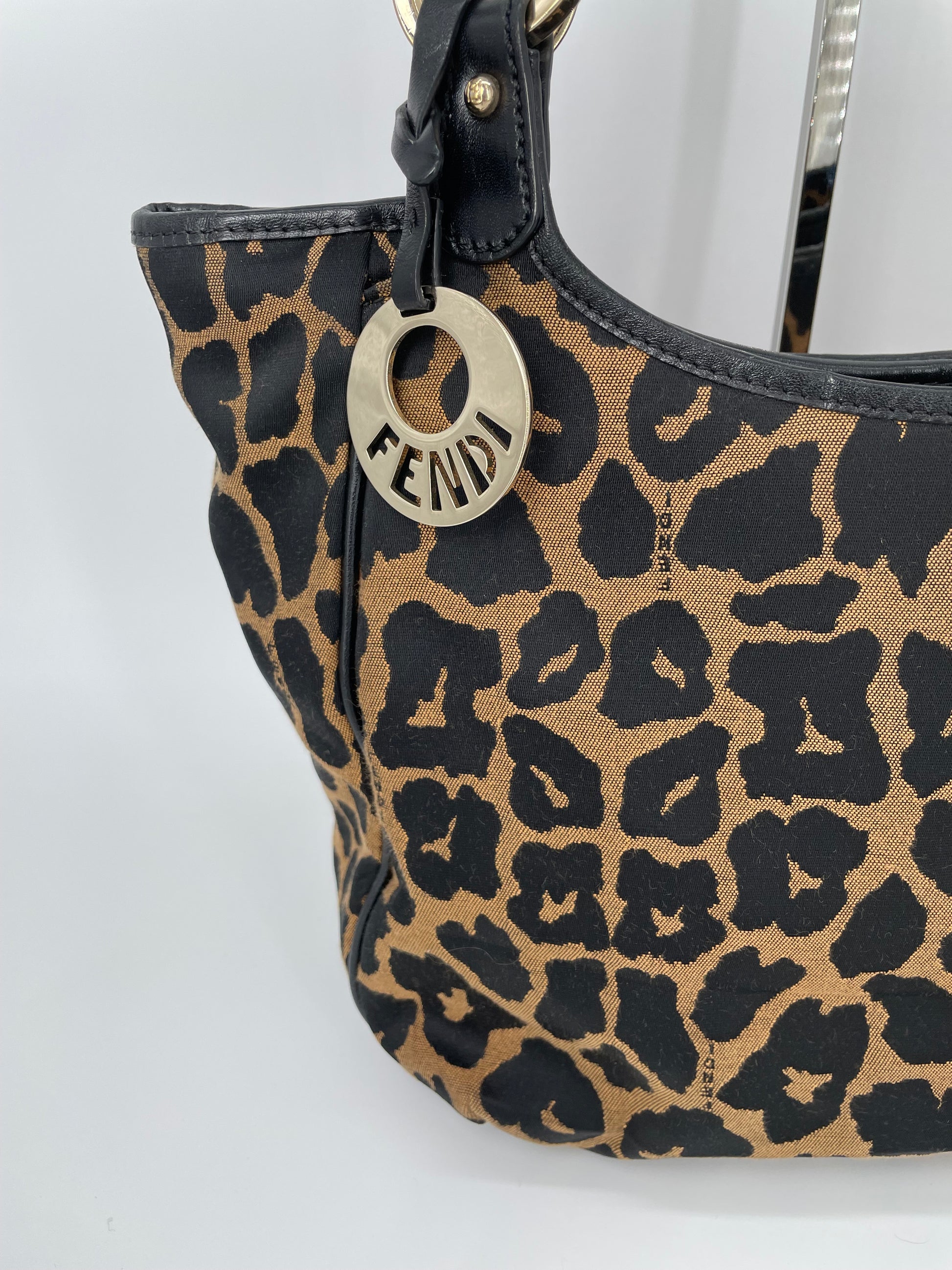 This is a vintage Fendi Leopard Print Chef Canvas tote bag. The bag features a brown and black leopard print canvas body with black leather handles and edging. The goldtone hardware, and removable Fendi logo charm finishes off this lightweight and easy to carry bag perfectly. The "Chef" style has a softly pleated body giving it a voluminous silhouette, a zip compartment to the centre and 2 side pockets means everything can be easily carried. There is also a small zip pocket for your important items.