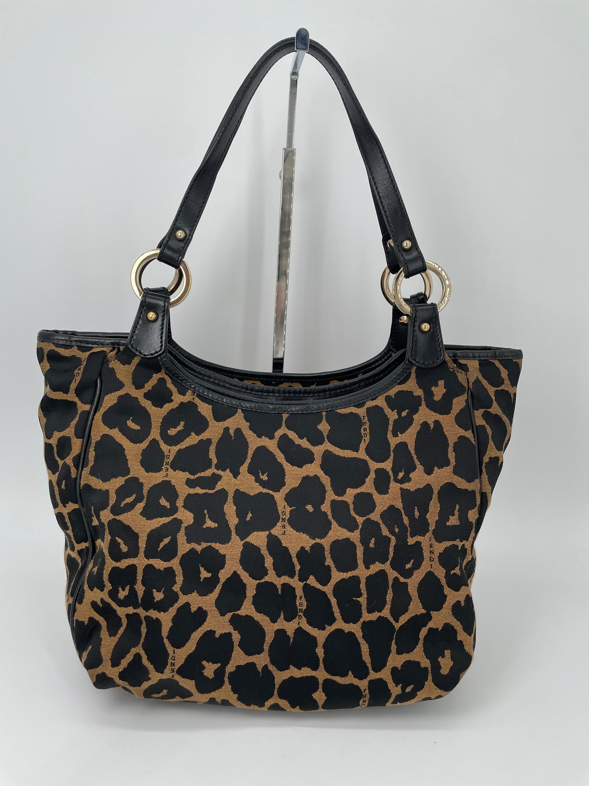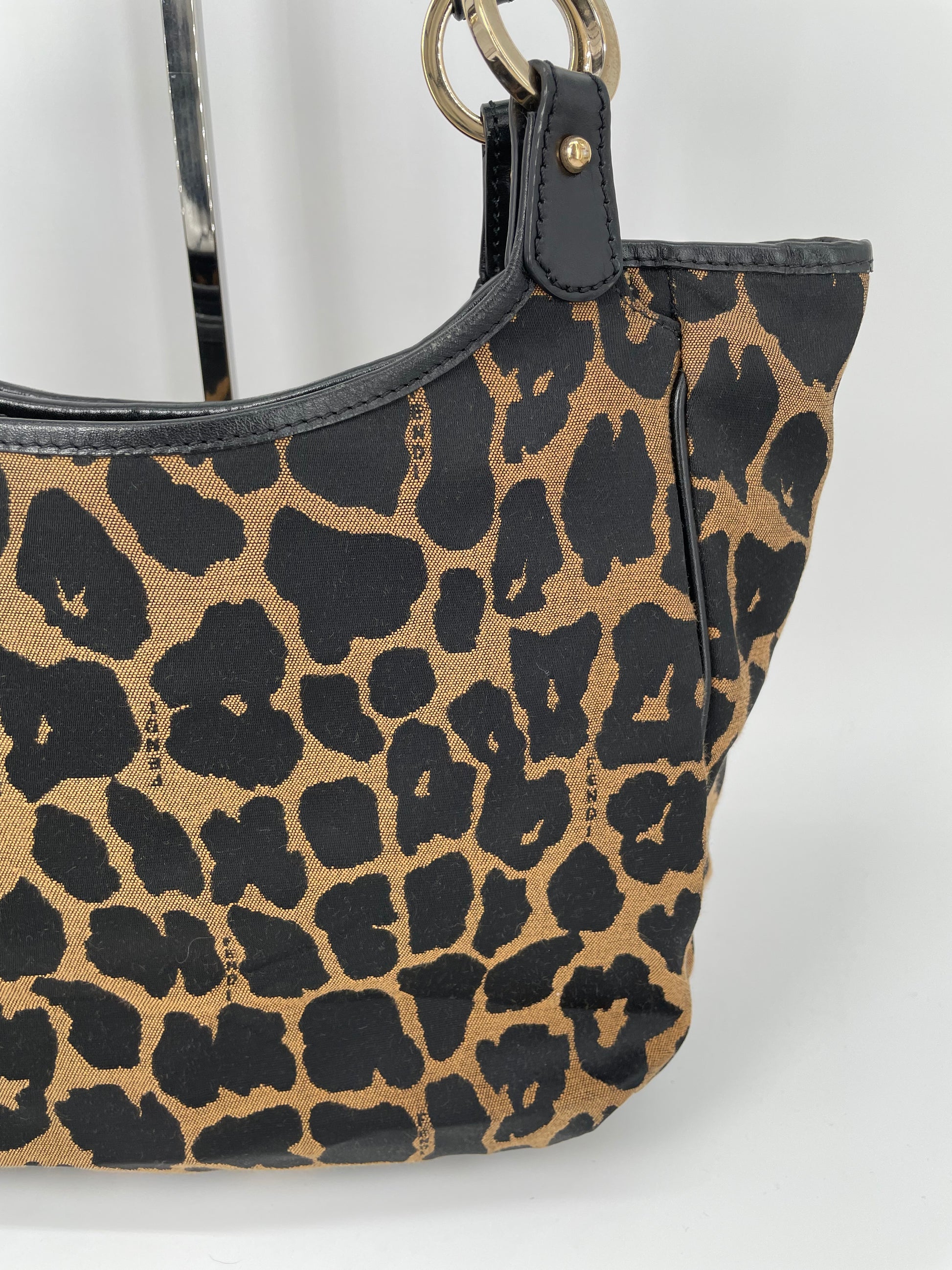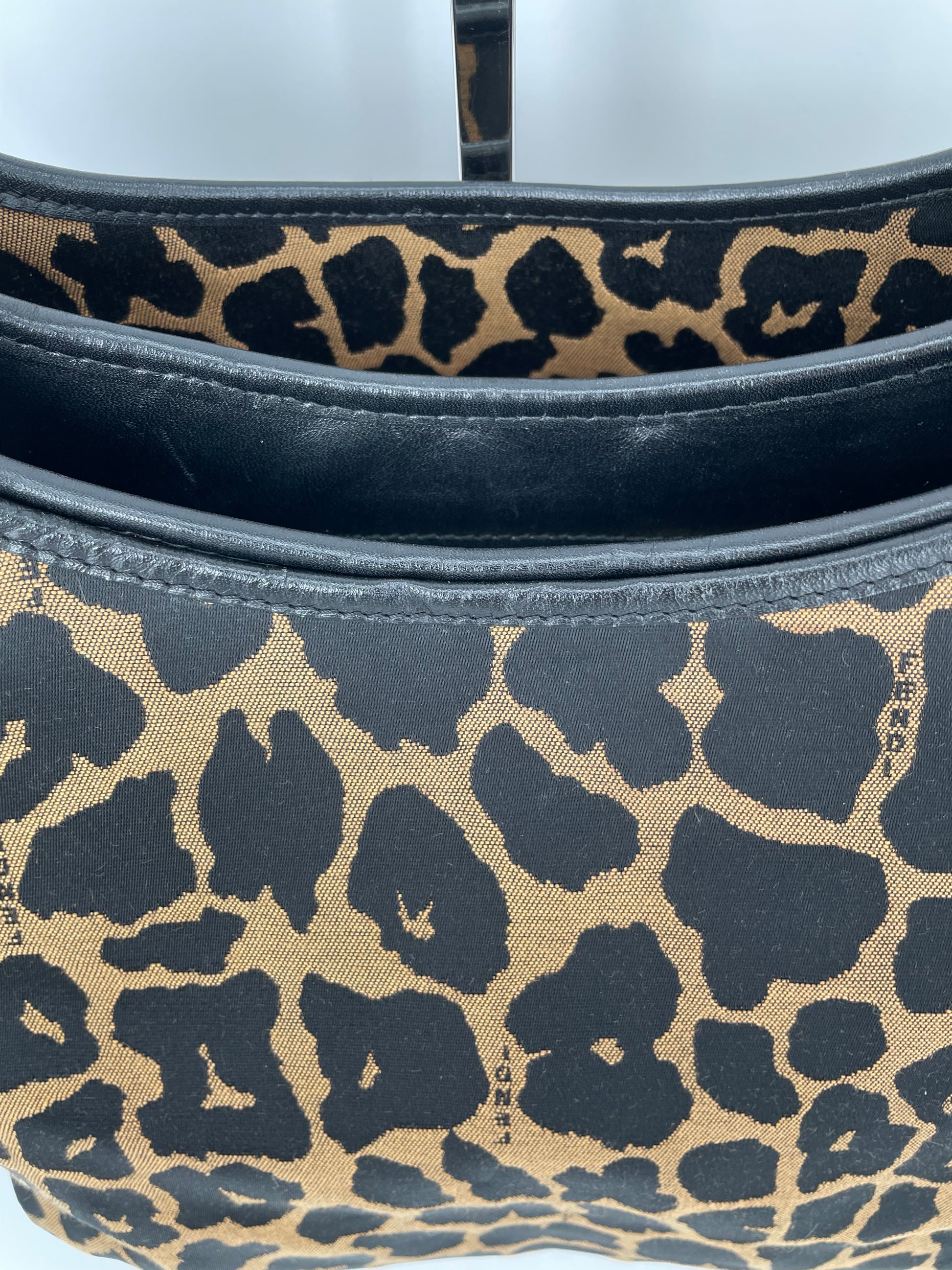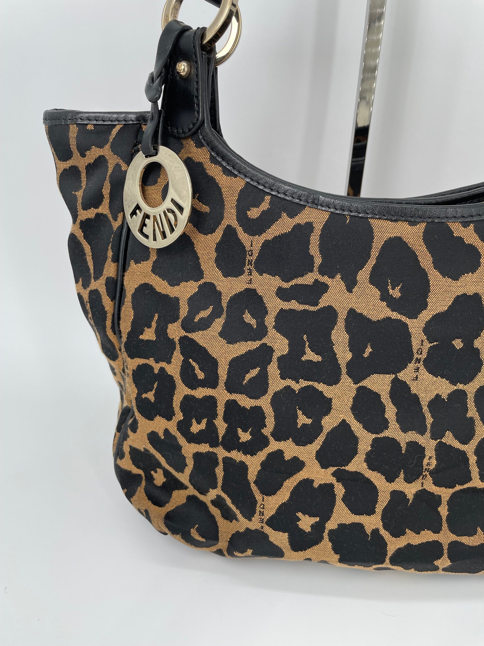 This is a vintage Fendi Leopard Print Chef Canvas tote bag. The bag features a brown and black leopard print canvas body with black leather handles and edging. The goldtone hardware, and removable Fendi logo charm finishes off this lightweight and easy to carry bag perfectly. The "Chef" style has a softly pleated body giving it a voluminous silhouette, a zip compartment to the centre and 2 side pockets means everything can be easily carried. There is also a small zip pocket for your important items.