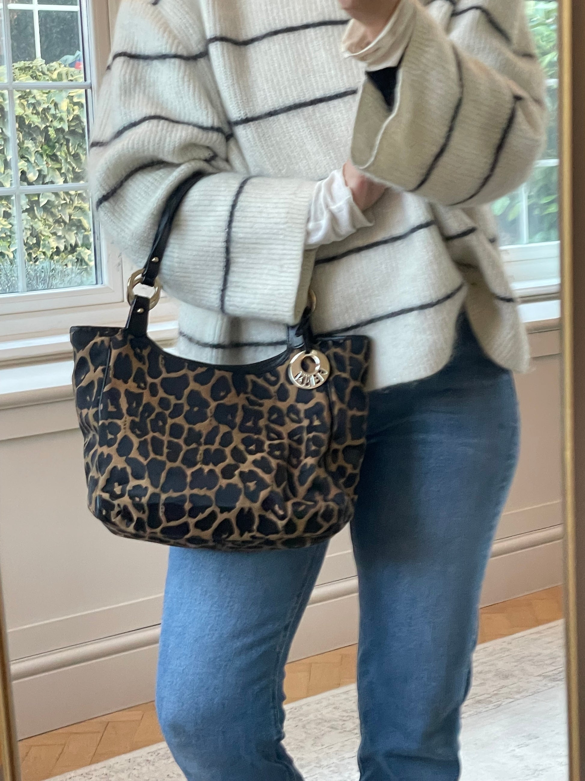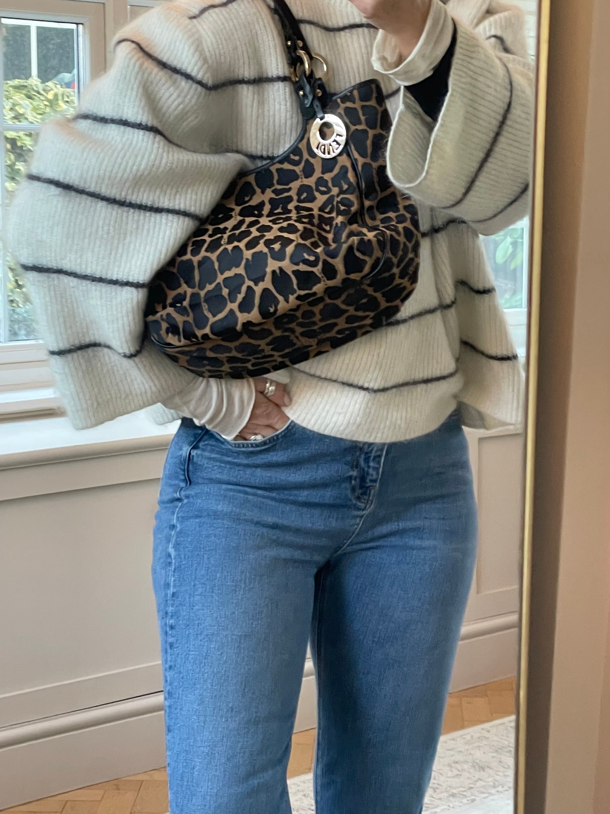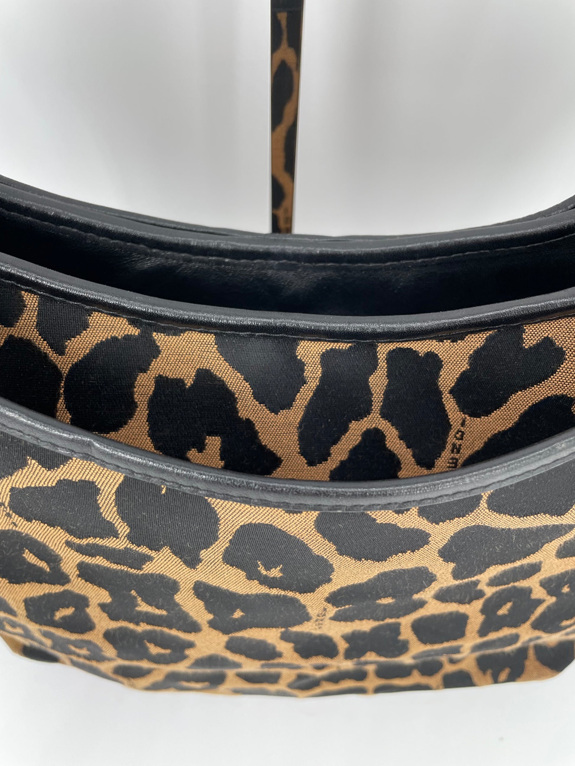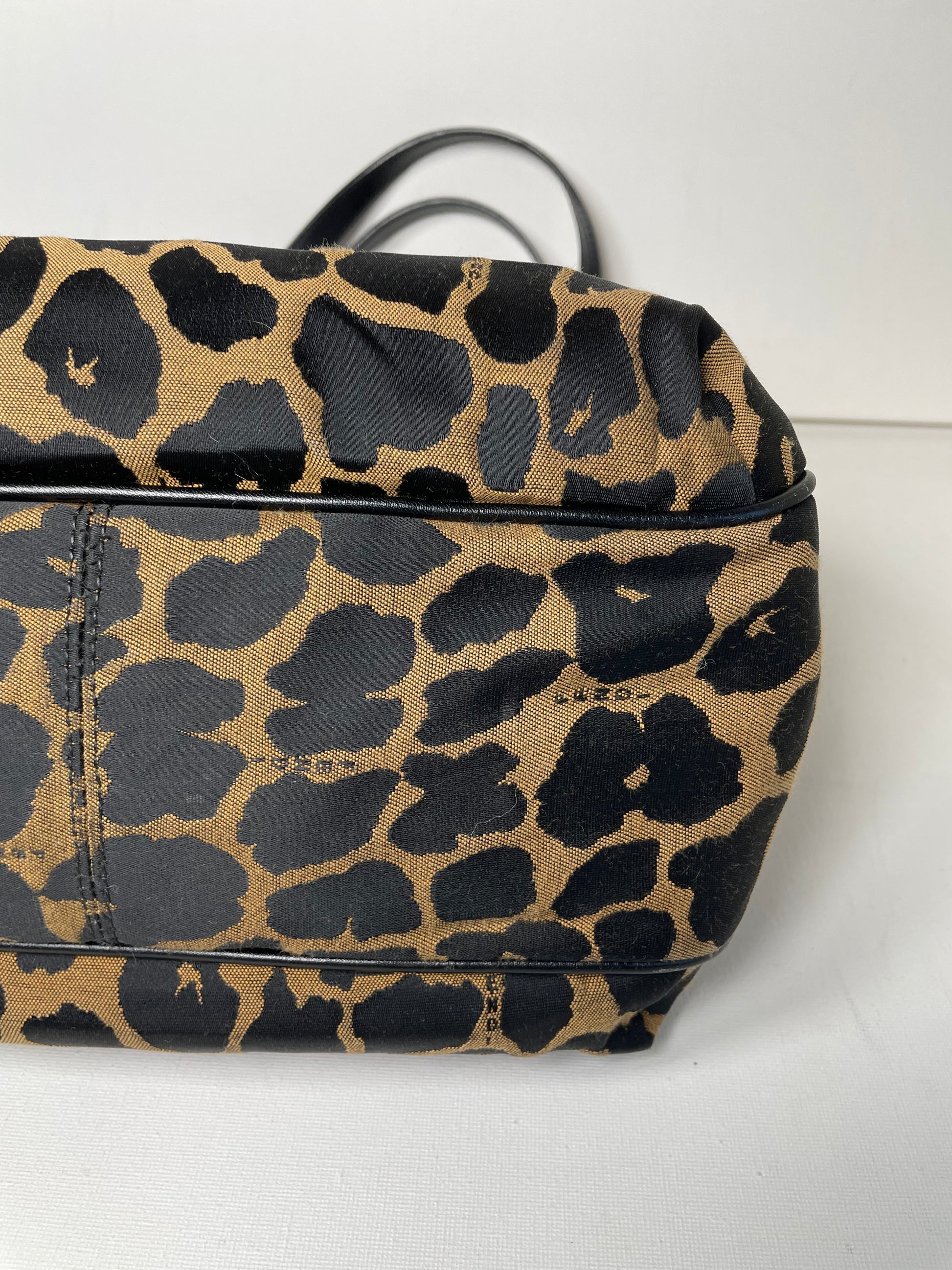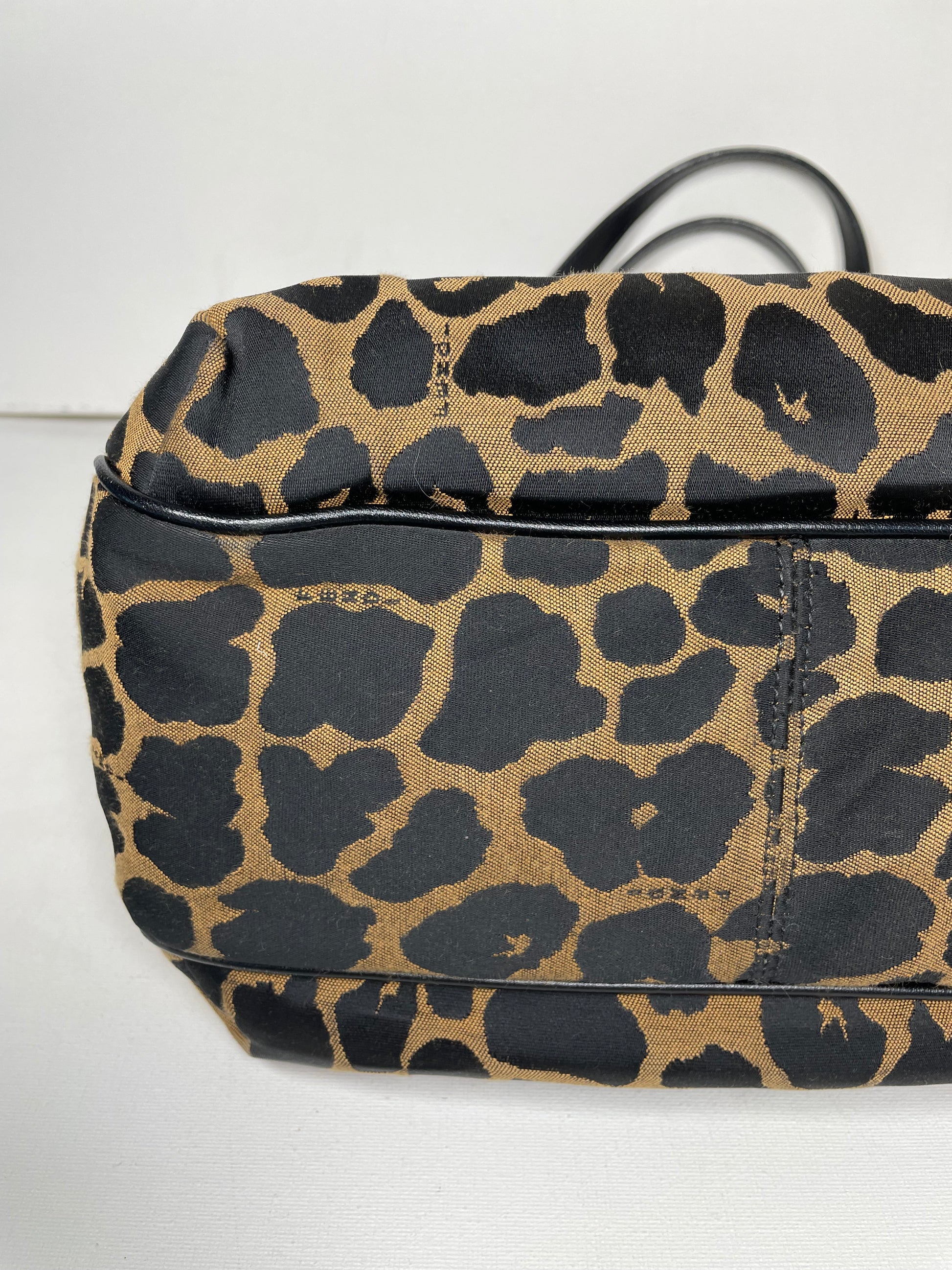 This is a vintage Fendi Leopard Print Chef Canvas tote bag. The bag features a brown and black leopard print canvas body with black leather handles and edging. The goldtone hardware, and removable Fendi logo charm finishes off this lightweight and easy to carry bag perfectly. The "Chef" style has a softly pleated body giving it a voluminous silhouette, a zip compartment to the centre and 2 side pockets means everything can be easily carried. There is also a small zip pocket for your important items.